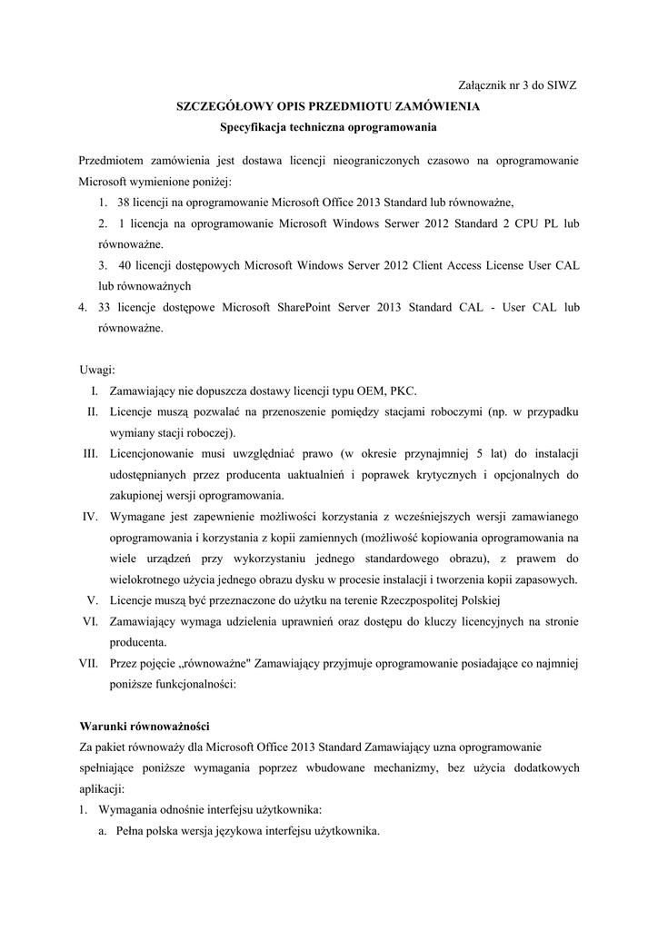 Załącznik nr 3 do SIWZ SZCZEGÓŁOWY OPIS PRZEDMIOTU ZAMÓWIENIA Specyfikacja techniczna oprogramowania Przedmiotem zamówienia jest dostawa licencji nieograniczonych czasowo na oprogramowanie Microsoft wymienione poniżej: 1. 38 licencji na oprogramowanie Microsoft Office 2013 Standard lub równoważne, 2. 1 licencja na oprogramowanie Microsoft Windows Serwer 2012 Standard 2 CPU PL lub równoważne. 3. 40 licencji dostępowych Microsoft Windows Server 2012 Client Access License User CAL lub równoważnych 4. 33 licencje dostępowe Microsoft SharePoint Server 2013 Standard CAL - User CAL lub równoważne. Uwagi: I. Zamawiający nie dopuszcza dostawy licencji typu OEM, PKC. II. Licencje muszą pozwalać na przenoszenie pomiędzy stacjami roboczymi (np. w przypadku wymiany stacji roboczej). III. Licencjonowanie musi uwzględniać prawo (w okresie przynajmniej 5 lat) do instalacji udostępnianych przez producenta uaktualnień i poprawek krytycznych i opcjonalnych do zakupionej wersji oprogramowania. IV. Wymagane jest zapewnienie możliwości korzystania z wcześniejszych wersji zamawianego oprogramowania i korzystania z kopii zamiennych (możliwość kopiowania oprogramowania na wiele urządzeń przy wykorzystaniu jednego standardowego obrazu), z prawem do wielokrotnego użycia jednego obrazu dysku w procesie instalacji i tworzenia kopii zapasowych. V. Licencje muszą być przeznaczone do użytku na terenie Rzeczpospolitej Polskiej VI. Zamawiający wymaga udzielenia uprawnień oraz dostępu do kluczy licencyjnych na stronie producenta. VII. Przez pojęcie „równoważne" Zamawiający przyjmuje oprogramowanie posiadające co najmniej poniższe funkcjonalności: Warunki równoważności Za pakiet równoważy dla Microsoft Office 2013 Standard Zamawiający uzna oprogramowanie spełniające poniższe wymagania poprzez wbudowane mechanizmy, bez użycia dodatkowych aplikacji: 1. Wymagania odnośnie interfejsu użytkownika: a. Pełna polska wersja językowa interfejsu użytkownika. b. Prostota i intuicyjność obsługi, pozwalająca na pracę osobom nieposiadającym umiejętności technicznych. 2. Oprogramowanie musi umożliwiać tworzenie i edycję dokumentów elektronicznych w ustalonym formacie, który spełnia następujące warunki: a. posiada kompletny i publicznie dostępny opis formatu, b. ma zdefiniowany układ informacji w postaci XML zgodnie z Załącznikiem 2 Rozporządzenia Rady Ministrów z dnia 12 kwietnia 2012 r. w sprawie Krajowych Ram Interoperacyjności, minimalnych wymagań dla rejestrów publicznych i wymiany informacji w postaci elektronicznej oraz minimalnych wymagań dla systemów teleinformatycznych (Dz. U. 2012, poz. 526), c. Oprogramowanie musi umożliwiać dostosowanie dokumentów i szablonów do potrzeb instytucji d. W skład oprogramowania muszą wchodzić narzędzia programistyczne umożliwiające automatyzację pracy i wymianę danych pomiędzy dokumentami i aplikacjami (język makropoleceń, język skryptowy). 3. Do aplikacji musi być dostępna pełna dokumentacja w języku polskim. 4. Pakiet zintegrowanych aplikacji biurowych musi zawierać: a. Edytor tekstów b. Arkusz kalkulacyjny c. Narzędzie do przygotowywania i prowadzenia prezentacji d. Narzędzie do tworzenia drukowanych materiałów informacyjnych e. Narzędzie do zarządzania informacją prywatą (pocztą elektroniczną, kalendarzem, kontaktami i zadaniami) f. Narzędzie do tworzenia notatek przy pomocy klawiatury lub notatek odręcznych na ekranie urządzenia typu tablet PC z mechanizmem OCR. 5. Edytor tekstów musi umożliwiać: a. Edycję i formatowanie tekstu w języku polskim wraz z obsługą języka polskiego w zakresie sprawdzania pisowni i poprawności gramatycznej oraz funkcjonalnością słownika wyrazów bliskoznacznych i autokorekty. b. Wstawianie oraz formatowanie tabel. c. Wstawianie oraz formatowanie obiektów graficznych. d. Wstawianie wykresów i tabel z arkusza kalkulacyjnego (wliczając tabele przestawne). e. Automatyczne numerowanie rozdziałów, punktów, akapitów, tabel i rysunków. f. Automatyczne tworzenie spisów treści. g. Formatowanie nagłówków i stopek stron. h. Śledzenie i porównywanie zmian wprowadzonych przez użytkowników w dokumencie. i. Nagrywanie, tworzenie i edycję makr automatyzujących wykonywanie czynności. j. Określenie układu strony (pionowa/pozioma). k. Wydruk dokumentów. l. Wykonywanie korespondencji seryjnej bazując na danych adresowych pochodzących z arkusza kalkulacyjnego i z narzędzia do zarządzania informacją prywatną. m. Pracę na dokumentach utworzonych przy pomocy Microsoft Word 2003 lub Microsoft Word 2007 i 2010 z zapewnieniem bezproblemowej konwersji wszystkich elementów i atrybutów dokumentu. n. Zabezpieczenie dokumentów hasłem przed odczytem oraz przed wprowadzaniem modyfikacji. o. Wymagana jest dostępność do oferowanego edytora tekstu bezpłatnych narzędzi umożliwiających wykorzystanie go, jako środowiska kreowania aktów normatywnych i prawnych, zgodnie z obowiązującym prawem. p. Wymagana jest dostępność do oferowanego edytora tekstu bezpłatnych narzędzi umożliwiających podpisanie podpisem elektronicznym pliku z zapisanym dokumentem przy pomocy certyfikatu kwalifikowanego zgodnie z wymaganiami obowiązującego w Polsce prawa. 6. Arkusz kalkulacyjny musi umożliwiać: a. Tworzenie raportów tabelarycznych b. Tworzenie wykresów liniowych (wraz linią trendu), słupkowych, kołowych c. Tworzenie arkuszy kalkulacyjnych zawierających teksty, dane liczbowe oraz formuły przeprowadzające operacje matematyczne, logiczne, tekstowe, statystyczne oraz operacje na danych finansowych i na miarach czasu. d. Tworzenie raportów z zewnętrznych źródeł danych (inne arkusze kalkulacyjne, bazy danych zgodne z ODBC, pliki tekstowe, pliki XML, webservice) e. Obsługę kostek OLAP oraz tworzenie i edycję kwerend bazodanowych i webowych. Narzędzia wspomagające analizę statystyczną i finansową, analizę wariantową i 