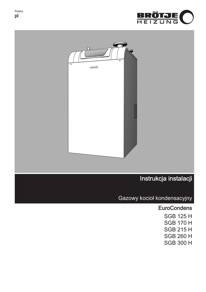 Polska pl Instrukcja instalacji Gazowy kocioł kondensacyjny EuroCondens SGB 125 H SGB 170 H SGB 215 H SGB 260 H SGB 300 H Szanowny Kliencie, bardzo dziękujemy za zakup niniejszego urządzenia. Przed rozpoczęciem korzystania z naszego produktu prosimy o uważne zapoznanie się z niniejszą instrukcją i zachowanie jej w bezpiecznym miejscu, aby można było korzystać z niej w przyszłości. Aby zapewnić bezpieczne i wydajne działanie urządzenia zalecamy jego regularne serwisowanie. Pomóc w tym może nasz ser wis oraz dział obsługi klienta. Mamy nadzieję, że będziecie Państwo przez wiele lat korzystać z urządzenia bez jakichkolwiek problemów. Spis treści Spis treści 1 Bezpieczeństwo . . . . . . . . . . . . . . . . . . . . . . . . . . . . . . . . . . . . . . . . . . . . . . . . . . . . . . . . . . . . . . . . . . 6 1.1 Ogólne instrukcje bezpieczeństwa . . . . . . . . . . . . . . . . . . . . . . . . . . . . . . . . . . . . . . . . . . . . . . . . 6 1.2 Użytkowanie zgodnie z przeznaczeniem . . . . . . . . . . . . . . . . . . . . . . . . . . . . . . . . . . . . . . . . . . . 8 1.3 Szczegółowe instrukcje bezpieczeństwa . . . . . . . . . . . . . . . . . . . . . . . . . . . . . . . . . . . . . . . . . . . 8 1.3.1 Gaz płynny . . . . . . . . . . . . . . . . . . . . . . . . . . . . . . . . . . . . . . . . . . . . . . . . . . . . . . . . . . . . 8 1.4 Zakres odpowiedzialności . . . . . . . . . . . . . . . . . . . . . . . . . . . . . . . . . . . . . . . . . . . . . . . . . . . . . . .8 1.4.1 Odpowiedzialność producenta . . . . . . . . . . . . . . . . . . . . . . . . . . . . . . . . . . . . . . . . . . . . . 8 1.4.2 Odpowiedzialność instalatora . . . . . . . . . . . . . . . . . . . . . . . . . . . . . . . . . . . . . . . . . . . . . .9 1.4.3 Odpowiedzialność użytkownika . . . . . . . . . . . . . . . . . . . . . . . . . . . . . . . . . . . . . . . . . . . . 9 2 O niniejszej instrukcji . . . . . . . . . . . . . . . . . . . . . . . . . . . . . . . . . . . . . . . . . . . . . . . . . . . . . . . . . . . . . . . . . . . . . . . . . . . . . . . .10 2.1 Informacje ogólne . . . . . . . . . . . . . . . . . . . . . . . . . . . . . . . . . . . . . . . . . . . . . . . . . . . . . . . . . . . . . . . . . . . . . . . . . . . . . 10 2.2 Dokumentacja uzupełniająca . . . . . . . . . . . . . . . . . . . . . . . . . . . . . . . . . . . . . . . . . . . . . . . . . . . . . . . . . . . . . . . . . . . . 10 2.3 Używane symbole . . . . . . . . . . . . . . . . . . . . . . . . . . . . . . . . . . . . . . . . . . . . . . . . . . . . . . . . . . . . . . . . . . . . . . . . . . . . . 10 2.3.1 Symbole stosowane w instrukcji . . . . . . . . . . . . . . . . . . . . . . . . . . . . . . . . . . . . . . . . . . . . . . . . . . . . . . . . . . 10 3 Specyfikacje techniczne . . . . . . . . . . . . . . . . . . . . . . . . . . . . . . . . . . . . . . . . . . . . . . . . . . . . . . . . . . . . . . . . . . . . . . . . . . . . . 12 3.1 Homologacje . . . . . . . . . . . . . . . . . . . . . . . . . . . . . . . . . . . . . . . . . . . . . . . . . . . . . . . . . . . . . . . . . . . . . . . . . . . . . . . . . 12 3.1.1 Przepisy i normy . . . . . . . . . . . . . . . . . . . . . . . . . . . . . . . . . . . . . . . . . . . . . . . . . . . . . . . . . . . . . . . . . . . . . . 12 3.1.2 Deklaracja producenta . . . . . . . . . . . . . . . . . . . . . . . . . . . . . . . . . . . . . . . . . . . . . . . . . . . . . . . . . . . . . . . . . .12 3.2 Dane techniczne . . . . . . . . . . . . . . . . . . . . . . . . . . . . . . . . . . . . . . . . . . . . . . . . . . . . . . . . . . . . . . . . . . . . . . . . . . . . . . 13 3.2.1 Dane techniczne – kotłowe ogrzewacze pomieszczeń zgodne z dyrektywą ErP . . . . . . . . . . . . . . . . . . . . . 13 3.2.2 Dane techniczne . . . . . . . . . . . . . . . . . . . . . . . . . . . . . . . . . . . . . . . . . . . . . . . . . . . . . . . . . . . . . . . . . . . . . . 14 3.2.3 Tabela wartości rezystancji czujników . . . . . . . . . . . . . . . . . . . . . . . . . . . . . . . . . . . . . . . . . . . . . . . . . . . . . . 15 3.2.4 Opory hydrauliczne . . . . . . . . . . . . . . . . . . . . . . . . . . . . . . . . . . . . . . . . . . . . . . . . . . . . . . . . . . . . . . . . . . . . 16 3.2.5 Wymiary i przyłącza . . . . . . . . . . . . . . . . . . . . . . . . . . . . . . . . . . . . . . . . . . . . . . . . . . . . . . . . . . . . . . . . . . . .17 3.2.6 Schemat połączeń elektrycznych . . . . . . . . . . . . . . . . . . . . . . . . . . . . . . . . . . . . . . . . . . . . . . . . . . . . . . . . . 19 4 Opis produktu . . . . . . . . . . . . . . . . . . . . . . . . . . . . . . . . . . . . . . . . . . . . . . . . . . . . . . . . . . . . . . . . . . . . . . . . . . . . . . . . . . . . . 20 4.1 Główne komponenty . . . . . . . . . . . . . . . . . . . . . . . . . . . . . . . . . . . . . . . . . . . . . . . . . . . . . . . . . . . . . . . . . . . . . . . . . . . 20 4.1.1 Kocioł . . . . . . . . . . . . . . . . . . . . . . . . . . . . . . . . . . . . . . . . . . . . . . . . . . . . . . . . . . . . . . . . . . . . . . . . . . . . . . . 20 4.1.2 Regulator pokojowy RGT . . . . . . . . . . . . . . . . . . . . . . . . . . . . . . . . . . . . . . . . . . . . . . . . . . . . . . . . . . . . . . . .21 4.2 Opis konsoli sterowniczej . . . . . . . . . . . . . . . . . . . . . . . . . . . . . . . . . . . . . . . . . . . . . . . . . . . . . . . . . . . . . . . . . . . . . . . 21 4.2.1 Elementy obsługi . . . . . . . . . . . . . . . . . . . . . . . . . . . . . . . . . . . . . . . . . . . . . . . . . . . . . . . . . . . . . . . . . . . . . . 21 4.2.2 Wyświetlane komunikaty . . . . . . . . . . . . . . . . . . . . . . . . . . . . . . . . . . . . . . . . . . . . . . . . . . . . . . . . . . . . . . . . 22 4.3 Akcesoria i wyposażenie dodatkowe . . . . . . . . . . . . . . . . . . . . . . . . . . . . . . . . . . . . . . . . . . . . . . . . . . . . . . . . . . . . . . 22 4.3.1 Wyposażenie dodatkowe . . . . .