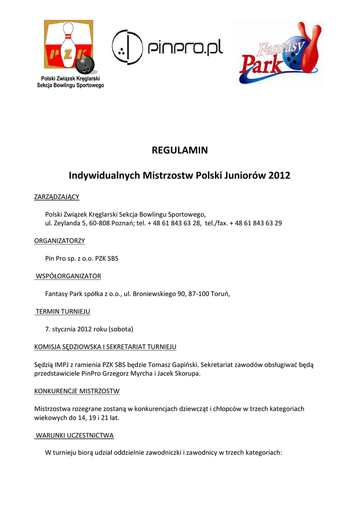 REGULAMIN Indywidualnych Mistrzostw Polski Juniorów 2012 ZARZĄDZAJĄCY Polski Związek Kręglarski Sekcja Bowlingu Sportowego, ul. Zeylanda 5, 60-808 Poznao; tel. + 48 61 843 63 28, tel./fax. + 48 61 843 63 29 ORGANIZATORZY Pin Pro sp. z o.o. PZK SBS WSPÓŁORGANIZATOR Fantasy Park spółka z o.o., ul. Broniewskiego 90, 87-100 Toruo, TERMIN TURNIEJU 7. stycznia 2012 roku (sobota) KOMISJA SĘDZIOWSKA I SEKRETARIAT TURNIEJU Sędzią IMPJ z ramienia PZK SBS będzie Tomasz Gapioski. Sekretariat zawodów obsługiwad będą przedstawiciele PinPro Grzegorz Myrcha i Jacek Skorupa. KONKURENCJE MISTRZOSTW Mistrzostwa rozegrane zostaną w konkurencjach dziewcząt i chłopców w trzech kategoriach wiekowych do 14, 19 i 21 lat. WARUNKI UCZESTNICTWA W turnieju biorą udział oddzielnie zawodniczki i zawodnicy w trzech kategoriach: 1. Kategoria juniorów młodszych dziewcząt i chłopców (do 14 lat) – Zawodniczki i zawodnicy urodzeni 01.01.1998 i później. 2. Kategoria juniorów dziewcząt i chłopców (do lat 19) – Zawodniczki i zawodnicy urodzeni w terminie 31.12.1997 – 31.08.1994. 3. Kategoria juniorów starszych dziewcząt i chłopców (do 21 lat) - Zawodniczki i zawodnicy urodzeni w terminie 01.01.1991 – 01.09.1994. Każdy ze startujących zobowiązany jest posiadad dowód tożsamości (dowód osobisty, legitymacja szkolna), licencję oraz aktualne badania lekarskie. Zgłoszenia do turnieju należy dokonad drogą on-line poprzez stronę internetową: www.pzksbs.pl, w przypadku problemów również e-mailem [email protected] z podaniem nr licencji, kategorii wiekowej i daty urodzenia. Wpisowe do turnieju jest płatne gotówką przed rozpoczęciem gier i wynosi: kategoria (do 14 lat) – 0,00 zł., kategoria (do 19 i 21 lat) – 100,00 zł. LISTY STARTOWE List startowe uruchomione zostaną 22.12.2011, natomiast zamknięte 5.01.2012 o godz. 22.00. PROGRAM TURNIEJU 1. Runda eliminacyjna – każdy ze startujących rozgrywa na uprzednio wylosowanych torach 6 gier, których suma decyduje o zajętym miejscu w swojej kategorii. Godziny rozpoczęcia składów: 9.00 i 12.00. Zmiana torów następuje po rozegraniu każdej gry .Wszyscy zawodnicy przesuwają się o dwa tory w prawo. UWAGA! Około godz.14.00 -14.30 przewidziany jest posiłek (koszt pokrywa organizator) dla wszystkich zawodników i zawodniczek. II. Runda finałowa – Początek dla kategorii „junior” godz. 15.00, dla kategorii „junior starszy” godz 16.30. Do rundy finałowej awansuje po 6 najlepszych zawodniczek i zawodników w kategorii wiekowej do 19 i 21 lat. Po wylosowaniu torów zawodniczki przystępują do gry na torach 1-6, natomiast zawodnicy 7-12. Zmiana torów następuje po rozegraniu każdej gry .Wszyscy zawodnicy przesuwają się o trzy tory w prawo. W przypadku niepełnej obsady rundy finałowej w którejś z kategorii, sędzia ma prawo wyznaczyd inny system zmiany torów w RF. Uczestnicy RF rozegrają 4 kolejne gry, a suma punktów tych gier zostanie doliczona do punktów zdobytych w RE. KLASYFIKACJA MISTRZOSTW I W kategorii do 19 i 21 lat dziewcząt i chłopców: - o miejscach 1-6 decydowad będzie suma punktów z RE i RF, - pozostałe miejsca wg punktów zdobytych w RE. II W kategorii do 14 lat dziewcząt i chłopców: - klasyfikacja Mistrzostw ułożona zostanie wg. punktów zdobytych w RE. ROZGRZEWKA Przed rozpoczęciem każdej rundy eliminacyjnej zostanie uruchomiona 7-minutowa rozgrzewka, natomiast przed każdą rundą finałową 5-minutowa rozgrzewka. REMISY W przypadku remisu o wyższej pozycji decyduje wyższa ostatnia gra, a w przypadku równości wyższa przedostatnia itd. DODATKOWE SKŁADY Nie przewiduje się organizacji dodatkowych składów. Limit uczestników IMPJ 2012 to łącznie 72 osoby. SMAROWANIE Zawody zostaną rozegrane na smarowaniu zamieszczonym w załączniku. DEKORACJA ZWYCIĘZCÓW Dekoracja zwycięzców nastąpi: w kategorii do lat 14 po zakooczeniu RE około godz. 14.45., w kategorii do lat 19 po zakooczeniu RF tej kategorii wiekowej około godz. 16.20, w kategorii do lat 21 po zakooczeniu RF w tej kategorii wiekowej około godz. 18.00. NAGRODY Zawodniczki i zawodnicy z miejsc I do III miejsca każdej kategorii otrzymują za: I miejsce – tytuł Indywidualnego Mistrza Polski Juniorów Starszych, Juniorów lub Juniorów Młodszych, puchar, złoty medal. II miejsce – tytuł I Wicemistrza Polski Juniorów Starszych, Juniorów, Juniorów Młodszych, puchar, srebrny medal. III miejsce – tytuł II Wicemistrza Polski Juniorów Starszych, Juniorów, Juniorów Młodszych, puchar, brązowy medal. SPRAWY ORGANIZACYJNE 1. Sprawdzanie dokumentów zawodniczych, losowanie torów i odebranie formularzy ewidencji wyników najpóźniej na 30 minut przed rozpoczęciem gier. Płatność wyłącznie gotówką! 2. Wszystkie gry turnieju rozegrane zostaną systemem amerykaoskim, tj. systemem zmiennych torów, rzut za rzut - grę rozpoczyna zawodnik z prawego toru. 3. Każdy ze startujących zawodników licencjonowanych przystępując do zawodów wyraża zgodę na udostępnienie wizerunku do celów reklamowych PZK SBS. PRZEPISY PORZĄDKOWE TURNIEJÓW BOWLINGOWYCH 1. Niniejsze przepisy stanowią częśd Ogólnego Regulaminu Rozgrywek. Umieszczane są w regulaminach turniejów, w celu przypomnienia zawodnikom o części uregulowao Sekcji Bowlingu Sportowego. 2. Do kompetencji Sędziego Głównego należy: - pilnowanie przestrzegania przepisów sportu bowlingowego, wzywanie obsługi technicznej torów, korygowanie błędnych wyników na konsolach i inne, - rozstrzyganie sytuacji spornych, - ukaranie zawodnika białą kartką, która skutkuje, jako ostrzeżenie, - ukaranie zawodnika żółtą kartką, - ukaranie zawodnika czerwoną kartką, czyli dyskwalifikacja. 3. Ukaranie zawodnika żółtą lub czerwoną kartką za niesportowe zachowanie w czasie zawodów powoduje automatycznie następujące sankcje od następnego dnia od zakooczenia zawodów (zgodnie z KRS19.5.1): - czerwona kartka – dyskwalifikacja