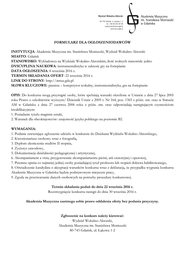 FORMULARZ DLA OGŁOSZENIODAWCÓW INSTYTUCJA: Akademia Muzyczna im. Stanisława Moniuszki, Wydział Wokalno-Aktorski MIASTO: Gdańsk STANOWISKO: Wykładowca na Wydziale Wokalno-Aktorskim, ilość wolnych stanowisk: jedno DYSCYPLINA NAUKOWA: instrumentalistyka w zakresie gry na fortepianie DATA OGŁOSZENIA: 8 września 2016 r. TERMIN SKŁADANIA OFERT: 22 września 2016 r. LINK DO STRONY: http://amuz.gda.pl SŁOWA KLUCZOWE: pianista – korepetytor wokalny, instrumentalistyka, gra na fortepianie OPIS: Do konkursu mogą przystąpić osoby, które spełniają warunki określone w Ustawie z dnia 27 lipca 2005 roku Prawo o szkolnictwie wyższym/ Dziennik Ustaw z 2005 r. Nr 164, poz. 1365 z późn. zm. oraz w Statucie AM w Gdańsku z dnia 27 czerwca 2006 roku z późn. zm. oraz odpowiadają następującym czynnościom kwalifikacyjnym: 1. Posiadanie tytułu magistra sztuki, 2. Warunek dla obcokrajowców: znajomość języka polskiego na poziomie B2. WYMAGANIA: 1. Podanie zawierające zgłoszenie udziału w konkursie do Dziekana Wydziału Wokalno-Aktorskiego, 2. Kwestionariusz osobowy wraz z fotografią, 3. Dyplom ukończenia studiów II stopnia, 4. Życiorys zawodowy, 5. Dokumentacja działalności pedagogicznej i artystycznej, 6. Akompaniament a vista, przygotowanie akompaniamentu pieśni, arii oratoryjnej i operowej, 7. Pisemna opinia co najmniej jednej osoby posiadającej tytuł profesora lub stopień doktora habilitowanego, 8. Oświadczenie kandydata o akceptacji warunków konkursu wraz z deklaracją, że przypadku wygrania konkursu Akademia Muzyczna w Gdańsku będzie podstawowym miejscem pracy, 9. Zgoda na przetwarzanie danych osobowych na potrzeby procedury konkursowej. Termin składania podań do dnia 22 września 2016 r. Rozstrzygnięcie konkursu nastąpi do dnia 30 września 2016 r. Akademia Muzyczna zastrzega sobie prawo oddalenia oferty bez podania przyczyny. Zgłoszenie na konkurs należy kierować: Wydział Wokalno-Aktorski, Akademia Muzyczna im. Stanisława Moniuszki 80-743 Gdańsk, ul. Łąkowa 1-2 FORM FOR EMPLOYERS INSTITUTION: The Stanislaw Moniuszko Music Academy in Gdansk, Faculty of Vocalism and Acting CITY: Gdansk POSITION: lecturer, Faculty of Vocalism and Acting, number of vacancies: one DISCIPLINE: instrumental studies, piano performance POSTED: 8 September 2016 r. EXPIRES: 22 September 2016 r. WEBSITE: http://amuz.gda.pl KEY WORDS: piano – vocal coach, instrumental studies, piano performance DESCRIPTION: Candidates who meet the requirements set out in Article 109 (1) of Higher Education Act of 27 July, 2005 (Journal of Laws No. 164, Item 1365, as amended); as well as in the AM Statute from 27 June 2006 with later amendments may enter the contest. Candidates should posses the following qualifications: 1. Master of Arts Diploma, 2. Condition for foreigners: knowledge of Polish language on a B2 level REQUIREMENTS: 1. Letter of application addressed to the Dean of the Faculty of Vocalism and Acting, 2. Personal questionnaire with photograph, 3. Diploma of Second Cycle Studies graduation, 4. Professional CV, 5. Documented didactic and artistic activity, 6. Sight-reading accompaniment, preparing a lied as well as oratorio and opera aria, 7. Written opinion of at least one person holding the title of professor or doctoral degree, 8. Statement of the candidate's acceptance of the conditions of the contest together with the declaration that The Stanislaw Moniuszko Music Academy in Gdansk will be the basic place of employment in case of winning the contest, 9. Agreement to processing personal data for the contest requirements. Deadline for submitting applications: 22 September 2016 r. The contest will be concluded by 30 September 2016 r. The Stanislaw Moniuszko Music Academy in Gdansk reserves the right to reject any applications considered unsuitable without giving any justifications. Documents should be submitted to the Faculty of Vocalism and Acting, The Stanislaw Moniuszko Academy of Music, 80-743 Gdansk, Poland, ul. Łąkowa 1–2
