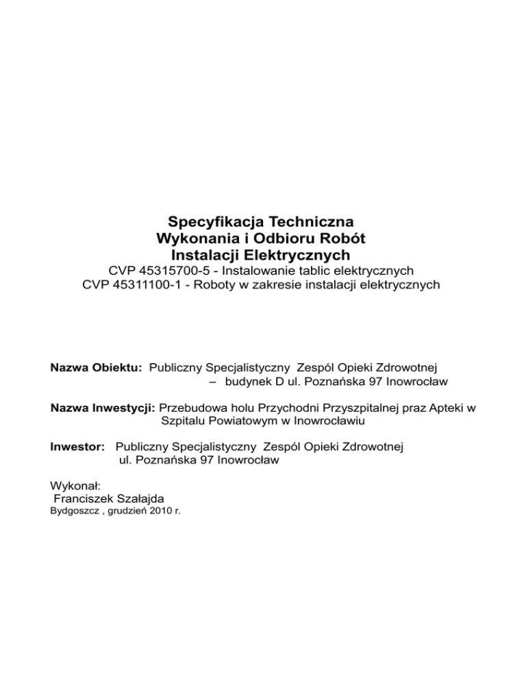 Specyfikacja Techniczna Wykonania i Odbioru Robót Instalacji Elektrycznych CVP 45315700-5 - Instalowanie tablic elektrycznych CVP 45311100-1 - Roboty w zakresie instalacji elektrycznych Nazwa Obiektu: Publiczny Specjalistyczny Zespól Opieki Zdrowotnej – budynek D ul. Poznańska 97 Inowrocław Nazwa Inwestycji: Przebudowa holu Przychodni Przyszpitalnej praz Apteki w Szpitalu Powiatowym w Inowrocławiu Inwestor: Publiczny Specjalistyczny Zespól Opieki Zdrowotnej ul. Poznańska 97 Inowrocław Wykonał: Franciszek Szałajda Bydgoszcz , grudzień 2010 r. 1. Opis ogólny ........................................................................................................................3 1.1. Zakres robót................................................................................................................3 1.2. Roboty towarzyszące ..................................................................................................3 1.3. Teren budowy i zaplecze wykonawcy. ........................................................................3 1.4. Kody CVP wg Wspólnego Słownika Zamówień........................................................ .3 2. Prace demontażowe i montażowe .......................................................................................3 2.1. Prace demontażowe .....................................................................................................3 2.1.1 Sprzęt.........................................................................................................................3 2.2. Prace montażowe rozdzielni i tablic elektrycznych........................................................3 2.2.1 Sprzęt..........................................................................................................................4 2.3. Prace montażowe instalacji elektrycznych.....................................................................4 2.3.1. Sprzęt.........................................................................................................................4 3. Warunki wykonania i odbioru................................................................................................4 3.1. Roboty demontażowe....................................................................................................4 3.2. Rozdzielnie i tablice rozdzielcze .................................................................. ................4 3.3. Obwody elektryczne ……… ..........................................................................................4 4. Przepisy związane ...............................................................................................................4 5. Informacje dodatkowe ..........................................................................................................5 1. Opis ogólny 1.1. Zakres robót Część elektryczna swym zakresem obejmuje; - roboty demontażowe instalacji elektrycznej do i w rozdzielniach – roboty montażowe w nowych rozdzielniach – montaż gniazd, wyłączników, lamp - pomiary instalacji elektrycznych. 1.2. Roboty towarzyszące Roboty towarzyszące będą obejmowały dodatkowe prace porządkowe oraz prace zabezpieczające z uwagi prowadzenie prac w czynnym obiekcie i wspólnym korzystaniem z ciągów komunikacyjnych. 1.3. Teren budowy i zaplecze wykonawcy. Przewiduje się, że Inwestor w uzgodnieniu z Wykonawcą robót przeznaczy na okres prac pomieszczenie dla zaplecza wykonawcy robót elektrycznych. 1.4. Kody CVP wg Wspólnego Słownika Zamówień Grupa robót CVP 4530000-0 Roboty w zakresie instalacji budowlanych Klasa robót CVP45310000-3 Roboty w zakresie instalacji elektrycznych Kategoria robót CVP 45311000-0- Roboty w zakresie instalacji CVP45315700-5 -Instalowanie tablic elektrycznych CVP 45311100-1 -Roboty w zakresie instalacji elektrycznych 2. Prace demontażowe i montażowe 2.1. Prace demontażowe Zdemontować; - demontaż istniejących kabli i przewodów do i w rozdzielniach. Odłączenie istniejących obwodów elektrycznych od napięcia na istniejących tablicach należy wykonać pod nadzorem konserwatora instalacji elektrycznych. Zdemontowany osprzęt elektryczny należy przekazać we wskazane miejsce Inwestorowi. Zbędny osprzęt elektryczny należy utylizować. Inwestorowi dostarczyć protokół z przekazania osprzętu elektrycznego do utylizacji. 2.1.1 Sprzęt Niezbędny sprzęt do wykonania robót to: Samochód dostawczy, osprzęt dla układania linii kablowych, ręczne elektronarzędzia, drabiny oraz mierniki elektryczne. 2.2. Prace montażowe rozdzielni i tablic elektrycznych Osprzęt elektryczny tablic i obudowy o standardzie firm ,Hager, Legrand, Moeller Rozdzielnie wyposażone są wg dokumentacji technicznej. Opisy i oznaczenia obwodów wg schematów Rozmieszczenie aparatów w szafkach tak jak w dokumentacji. Dostarczyć świadectwa badań i protokoły pomiarów. 2.2.1 Sprzęt Niezbędny sprzęt do wykonania robót to ręczne elektronarzędzia, drabiny oraz mierniki elektryczne. 2.3. Prace montażowe instalacji elektrycznych Przewody elektryczne układane p.t. w rurkach osłonowych w ciągach pionowych i poziomych. Prace będą prowadzone w czynnym obiekcie. Po wykonaniu instalacji przeprowadzić niezbędne pomiary elektryczne. 2.3.1. Sprzęt Niezbędny sprzęt do wykonania robót to ręczne elektronarzędzia, drabiny oraz mierniki elektryczne. Zabroniona jest praca młotem udarowym na ścianach z wyłożoną glazurą Wszystkie materiały i osprzęt elektryczny zabudowany w budynku muszą posiadać niezbędne certyfikaty, atesty i świadectwa dopuszczenia. Zabudowany osprzęt musi być zgodny z projektem i przedstawioną ofertą . Zmiana zabudowanego osprzętu musi być zatwierdzona przez Inspektora Nadzoru Inwestora. 3. Warunki wykonania i odbioru. 3.1. Roboty demontażowe. Przed rozpoczęciem prac demontażowych istniejące obwody elektryczne należy odłączyć od tablic rozdzielczych pod nadzorem dyżurnego e