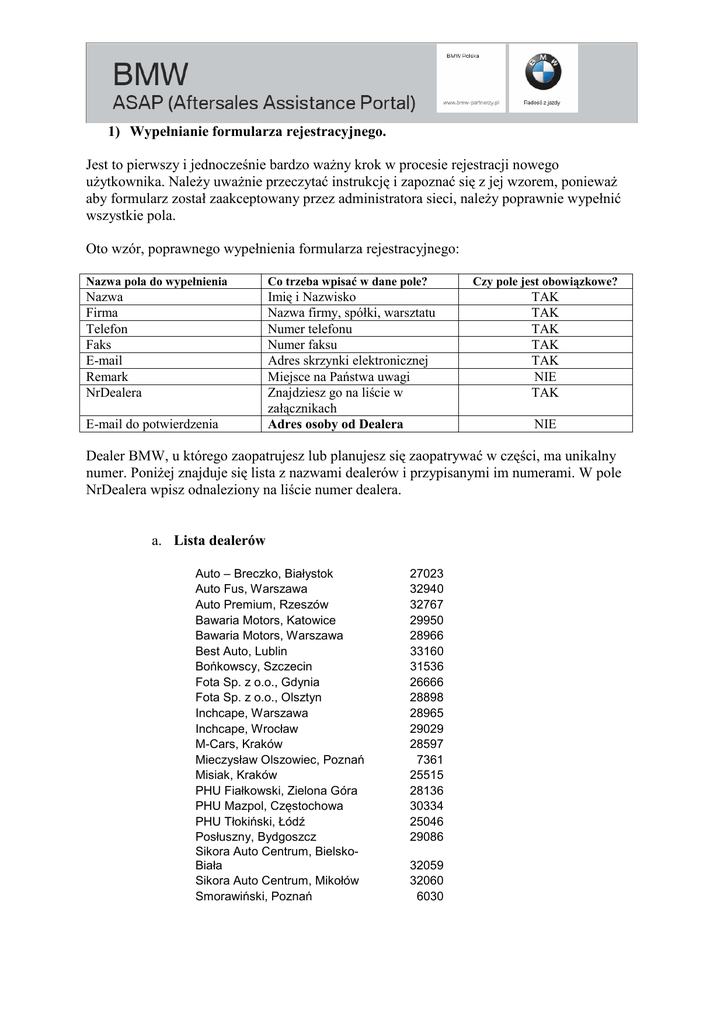 1) Wypełnianie formularza rejestracyjnego. Jest to pierwszy i jednocześnie bardzo waŜny krok w procesie rejestracji nowego uŜytkownika. NaleŜy uwaŜnie przeczytać instrukcję i zapoznać się z jej wzorem, poniewaŜ aby formularz został zaakceptowany przez administratora sieci, naleŜy poprawnie wypełnić wszystkie pola. Oto wzór, poprawnego wypełnienia formularza rejestracyjnego: Nazwa pola do wypełnienia Co trzeba wpisać w dane pole? Nazwa Firma Telefon Faks E-mail Remark NrDealera Imię i Nazwisko Nazwa firmy, spółki, warsztatu Numer telefonu Numer faksu Adres skrzynki elektronicznej Miejsce na Państwa uwagi Znajdziesz go na liście w załącznikach Adres osoby od Dealera E-mail do potwierdzenia Czy pole jest obowiązkowe? TAK TAK TAK TAK TAK NIE TAK NIE Dealer BMW, u którego zaopatrujesz lub planujesz się zaopatrywać w części, ma unikalny numer. PoniŜej znajduje się lista z nazwami dealerów i przypisanymi im numerami. W pole NrDealera wpisz odnaleziony na liście numer dealera. a. Lista dealerów Auto – Breczko, Białystok Auto Fus, Warszawa Auto Premium, Rzeszów Bawaria Motors, Katowice Bawaria Motors, Warszawa Best Auto, Lublin Bońkowscy, Szczecin Fota Sp. z o.o., Gdynia Fota Sp. z o.o., Olsztyn Inchcape, Warszawa Inchcape, Wrocław M-Cars, Kraków Mieczysław Olszowiec, Poznań Misiak, Kraków PHU Fiałkowski, Zielona Góra PHU Mazpol, Częstochowa PHU Tłokiński, Łódź Posłuszny, Bydgoszcz Sikora Auto Centrum, BielskoBiała Sikora Auto Centrum, Mikołów Smorawiński, Poznań 27023 32940 32767 29950 28966 33160 31536 26666 28898 28965 29029 28597 7361 25515 28136 30334 25046 29086 32059 32060 6030 Po wypełnieniu formularza sprawdź jeszcze raz poprawność wszystkich podanych danych. Upewnij się, Ŝe zaznaczyłeś wszystkie wymagane pola. Jeśli tak, kliknij na przycisk „Zapisz”. 2) Dane zostały zapisane Następnie zobaczysz ekran, który informuje Cię, Ŝe Twoje dane zostały zapisane. Na podany przez Ciebie adres poczty elektronicznej zostanie przesłana informacja o dalszych krokach. Zamknij to okno i oczekuj na e-mail. 3) Otrzymałeś E-mail od ASAP Otrzymanie wiadomości z adresu [email protected] oznacza, Ŝe utworzono dla Ciebie konto na portalu. Zapamiętaj nazwę uŜytkownika i wejdź na stronę rejestracji, klikając na „ASAP”. Po kliknięciu na link „ASAP” zostaniesz przekierowany na stronę portalu. PoniewaŜ jesteś nowym uŜytkownikiem, musisz się zarejestrować. Jest to potrzebne, tylko jeden raz, za pierwszym zgłoszeniem uŜytkownika. PoniŜej zobaczysz kolejne kroki, procesu rejestracji. 4) Rejestracja uŜytkownika do portalu Trzeba zarejestrować w systemie otrzymaną nazwę uŜytkownika. W tym celu kliknij na „Rejestracja”. Ta procedura jest konieczna tylko raz, przy pierwszym uŜyciu. 5) Rejestracja krok 1 Rejestracja krok 2 6) Zgłoszenie – Logowanie do systemu Tak będzie wyglądało logowanie do systemu za kaŜdym następnym razem. Trzeba wpisać nazwę uŜytkownika oraz przypisane do niego hasło i kliknąć na „Zgłoszenie”. 7) Witamy w Portalu ASAP