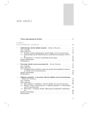 SPIS TREŚCI Wykaz najważniejszych skrótów ........................................................................ 13 CZE˛ŚĆ I ZAGADNIENIA OGÓLNE ................................................................................ 15 1. 2. 3. Epidemiologia chorób układu kra˛żenia – Barbara Ślusarska ......................... Cele rozdziału ........................................................................................................ Słowa kluczowe ..................................................................................................... 1.1. Wybrane aspekty epidemiologii chorób układu sercowo-naczyniowego ... 1.2. Epidemiologia chorób układu kra˛żenia a profilaktyczne programy zdrowotne ................................................................................................................... 1.3. Piele˛gniarstwo w obszarze kardiologii prewencyjnej ................................. Pytania sprawdzaja˛ce ............................................................................................. Piśmiennictwo ........................................................................................................ Prewencja chorób sercowo-naczyniowych – Dorota Talarska ........................ Cele rozdziału ........................................................................................................ Słowa kluczowe ..................................................................................................... 2.1. Charakterystyka czynników ryzyka oraz sposoby ich modyfikacji w prewencji chorób sercowo-naczyniowych ............................................................... Pytania sprawdzaja˛ce ............................................................................................. Piśmiennictwo ........................................................................................................ Edukacja pacjentów w prewencji schorzeń układu sercowo-naczyniowego – Małgorzata Posłuszna ........................................................................................ Cele rozdziału ........................................................................................................ Słowa kluczowe ..................................................................................................... 3.1. Rola edukacji w profilaktyce schorzeń układu sercowo-naczyniowego .... 3.2. Metody i formy wykorzystywane w edukacji pacjentów ze schorzeniami sercowo-naczyniowymi ................................................................................ 3.3. Planowanie i ewaluacja działań edukacyjnych piele˛gniarki kardiologicznej .................................................................................................................. Pytania sprawdzaja˛ce ............................................................................................. Piśmiennictwo ........................................................................................................ 17 17 17 18 21 24 25 25 27 27 27 30 42 43 45 45 45 46 50 58 62 63 9 4. Rehabilitacja kardiologiczna – Ewa Piotrowicz, Ewa Jakubowska ................. Cele rozdziału ........................................................................................................ Słowa kluczowe ..................................................................................................... 4.1. Definicja i zadania kompleksowej rehabilitacji kardiologicznej ................ 4.2. Zespół realizuja˛cy kompleksowa˛ rehabilitacje˛ kardiologiczna˛ ................... 4.3. Realizacja kompleksowej rehabilitacji kardiologicznej .............................. 4.4. Edukacja ........................................................................................................ 4.5. Trening fizyczny ........................................................................................... 4.6. Efekty kompleksowej rehabilitacji kardiologicznej .................................... Pytania sprawdzaja˛ce ............................................................................................. Piśmiennictwo ........................................................................................................ 65 65 65 66 67 67 71 72 74 74 75 CZE˛ŚĆ II DIAGNOSTYKA SCHORZEŃ UKŁADU SERCOWO-NACZYNIOWEGO .............................................................................................. 77 5. 6. Podmiotowa i przedmiotowa ocena układu sercowo-naczyniowego – Edyta Katarzyna Cudak ................................................................................................... Cele rozdziału ........................................................................................................ Słowa kluczowe ..................................................................................................... 5.1. Badanie podmiotowe układu kra˛żenia ......................................................... 5.2. Badanie przedmiotowe (fizykalne) układu kra˛żenia ................................... Pytania sprawdzaja˛ce ............................................................................................. Piśmiennictwo ........................................................................................................ 79 79 79 80 82 87 87 Badania diagnostyczne – Anna Nowicka ............................................................ Cele rozdziału ........................................................................................................ Słowa kluczowe ..................................................................................................... 6.1. Elektrokardiografia ....................................................................................... 6.2. Określenie tolerancji wysiłku (próby czynnościowe) ................................. 6.3. Badania obrazowe ......................................................................................... 6.4. Badan