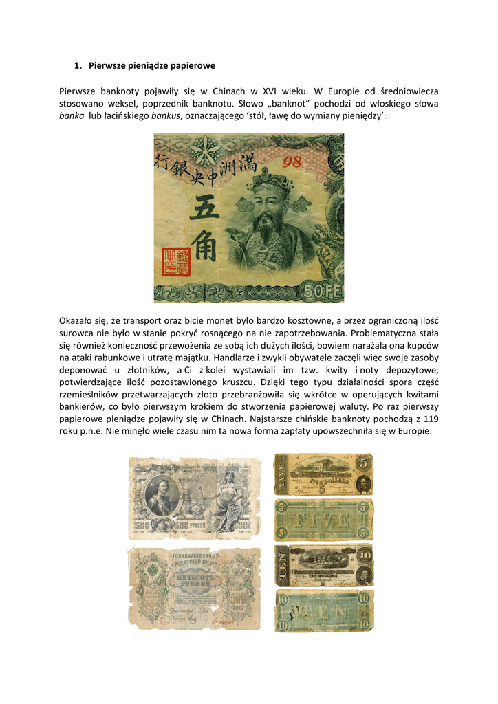 1. Pierwsze pieniądze papierowe Pierwsze banknoty pojawiły się w Chinach w XVI wieku. W Europie od średniowiecza stosowano weksel, poprzednik banknotu. Słowo „banknot” pochodzi od włoskiego słowa banka lub łacińskiego bankus, oznaczającego ‘stół, ławę do wymiany pieniędzy’. Okazało się, że transport oraz bicie monet było bardzo kosztowne, a przez ograniczoną ilość surowca nie było w stanie pokryć rosnącego na nie zapotrzebowania. Problematyczna stała się również konieczność przewożenia ze sobą ich dużych ilości, bowiem narażała ona kupców na ataki rabunkowe i utratę majątku. Handlarze i zwykli obywatele zaczęli więc swoje zasoby deponować u złotników, a Ci z kolei wystawiali im tzw. kwity i noty depozytowe, potwierdzające ilość pozostawionego kruszcu. Dzięki tego typu działalności spora część rzemieślników przetwarzających złoto przebranżowiła się wkrótce w operujących kwitami bankierów, co było pierwszym krokiem do stworzenia papierowej waluty. Po raz pierwszy papierowe pieniądze pojawiły się w Chinach. Najstarsze chińskie banknoty pochodzą z 119 roku p.n.e. Nie minęło wiele czasu nim ta nowa forma zapłaty upowszechniła się w Europie. Na początku banknoty były bonami skarbowymi, które w razie potrzeby wymieniano na monety kruszcowe. Takie depozyty pozwalały nie martwić się o ciężkość pieniędzy czy napady zbójców. Jednak banki często emitowały więcej bonów skarbowych niż posiadały monet. Wtedy zabroniono wszystkim bankom, z wyjątkiem jednego, drukować banknoty. Ten bank nazywamy do dziś bankiem centralnym. Jednak problem zbyt dużej ilości banknotów nadal nie znikał. Dlatego postanowiono, że banknotów nie będzie trzeba wymieniać na monety, tylko zostaną one prawnym środkiem płatniczym. 2. Pieniądz elektroniczny Pieniądz przechodzi kolejne niezwykłe metamorfozy. Pieniądz w postaci monet i banknotów okazał się z czasem mało wygodny. O wiele wygodniej jest zdeponować gotówkę w banku, a rozrachunki regulować za pomocą przelewów lub czeków. W ten sposób pojawił się na rynku pieniądz bezgotówkowy, zwany także depozytowym. Dziś prawdziwą furorę robi pieniądz elektroniczny, wirtualny, którym posługujemy się w momencie realizacji płatności za pomocą kart magnetycznych: wypłacając gotówkę w bankomacie lub też płacąc kartą w punktach handlowo usługowych. Opracowano na podstawie: T. Małkowski, J .Rześniowiecki, „Historia i społeczeństwo”, T. Kałkowski, „Tysiąc lat monety polskiej”, Z. Dobosiewicz, „Bankowość”, J. Kuczałek, D. Ura, M. Urban, „Wiedza o społeczeństwie”, M. N. Rothbard, ”Złoto, banki, ludzie – krótka historia pieniądza”, H. Cywiński, „Dziesięć wieków pieniądza polskiego”.