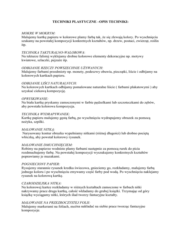 TECHNIKI PLASTYCZNE –OPIS TECHNIKI: MOKRE W MOKRYM: Malujemy kartkę papieru w kolorowe plamy farbą tak, że się zlewają kolory. Po wyschnięciu szukamy na powstałej kompozycji konkretnych kształtów, np. drzew, postaci, zwierząt, roślin itp. TECHNIKA TAKTURALNO-WALOROWA: Na tekturze falistej wyklejamy drobne kolorowe elementy dekoracyjne np. motywy kwiatowe, szlaczki, pejzaże itp. ODBIJANIE RZECZY POWSZECHNIE UŻYWANYCH: Malujemy farbami przedmioty np. monety, podeszwy obuwia, pieczątki, liście i odbijamy na kolorowych kartkach papieru. ODBIJANIE LIŚCI NATURALNYCH: Na kolorowych kartkach odbijamy pomalowane naturalne liście ( farbami plakatowymi ) aby uzyskać ciekawą kompozycję. OPRYSKIWANIE: Na biała kartkę pryskamy zamoczonymi w farbie pędzelkami lub szczoteczkami do zębów, aby powstała kolorowa kompozycja. TECHNIKA WYDRAPYWANEK: Kartkę papieru malujemy gęstą farbą, po wyschnięciu wydrapujemy obrazek za pomocą nożyka, szpilki. MALOWANIE NITKĄ: Narysowany kontur obrazka wypełniamy nitkami (różnej długości) lub drobno pociętą włóczką, aby powstał kolorowy rysunek. MALOWANIE DMUCHNIĘCIEM: Robimy na papierze wodniste plamy farbami następnie za pomocą rurek do picia rozdmuchujemy farbę. Na powstałej kompozycji wyszukujemy konkretnych kształtów poprawiamy je mazakami. POGNIECIONY PAPIER: Rysujemy starannie rysunek kredka świecowa, gnieciemy go, rozkładamy, malujemy farbą jednego koloru i po wyschnięciu zmywamy część farby pod wodą. Po wyschnięciu naklejamy rysunek na kolorową kartkę. CZARODZIEJSKA NITKA: Na kolorowej kartce rozkładamy w różnych kształtach zamoczone w farbach nitki nakrywamy prace druga kartką, całość wkładamy do grubej książki. Trzymając od góry książkę wyciągamy nitki, których ślad tworzy fantazyjne kształty. MALOWANIE NA PRZEZROCZYSTEJ FOLII: Malujemy markerami na foliach, można nakładać na siebie prace tworząc fantazyjne kompozycje.