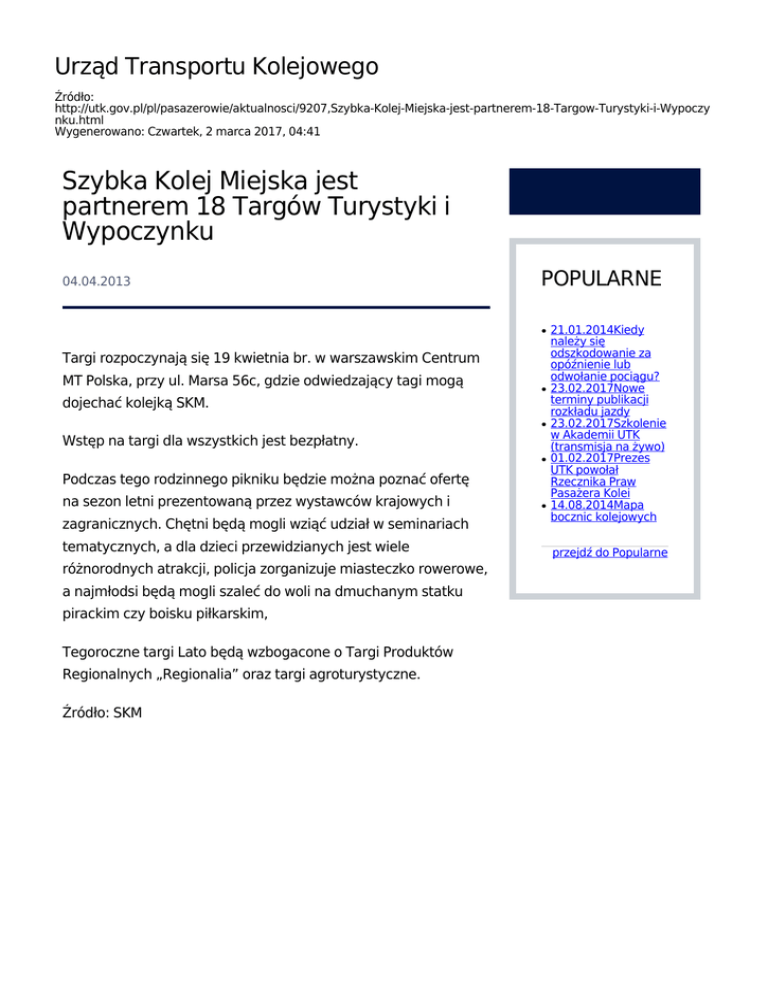 Urząd Transportu Kolejowego Źródło: http://utk.gov.pl/pl/pasazerowie/aktualnosci/9207,Szybka-Kolej-Miejska-jest-partnerem-18-Targow-Turystyki-i-Wypoczy nku.html Wygenerowano: Czwartek, 2 marca 2017, 04:41 Szybka Kolej Miejska jest partnerem 18 Targów Turystyki i Wypoczynku 04.04.2013 POPULARNE ● Targi rozpoczynają się 19 kwietnia br. w warszawskim Centrum MT Polska, przy ul. Marsa 56c, gdzie odwiedzający tagi mogą ● dojechać kolejką SKM. ● Wstęp na targi dla wszystkich jest bezpłatny. ● Podczas tego rodzinnego pikniku będzie można poznać ofertę na sezon letni prezentowaną przez wystawców krajowych i zagranicznych. Chętni będą mogli wziąć udział w seminariach tematycznych, a dla dzieci przewidzianych jest wiele różnorodnych atrakcji, policja zorganizuje miasteczko rowerowe, a najmłodsi będą mogli szaleć do woli na dmuchanym statku pirackim czy boisku piłkarskim, Tegoroczne targi Lato będą wzbogacone o Targi Produktów Regionalnych „Regionalia” oraz targi agroturystyczne. Źródło: SKM ● 21.01.2014Kiedy należy się odszkodowanie za opóźnienie lub odwołanie pociągu? 23.02.2017Nowe terminy publikacji rozkładu jazdy 23.02.2017Szkolenie w Akademii UTK (transmisja na żywo) 01.02.2017Prezes UTK powołał Rzecznika Praw Pasażera Kolei 14.08.2014Mapa bocznic kolejowych przejdź do Popularne