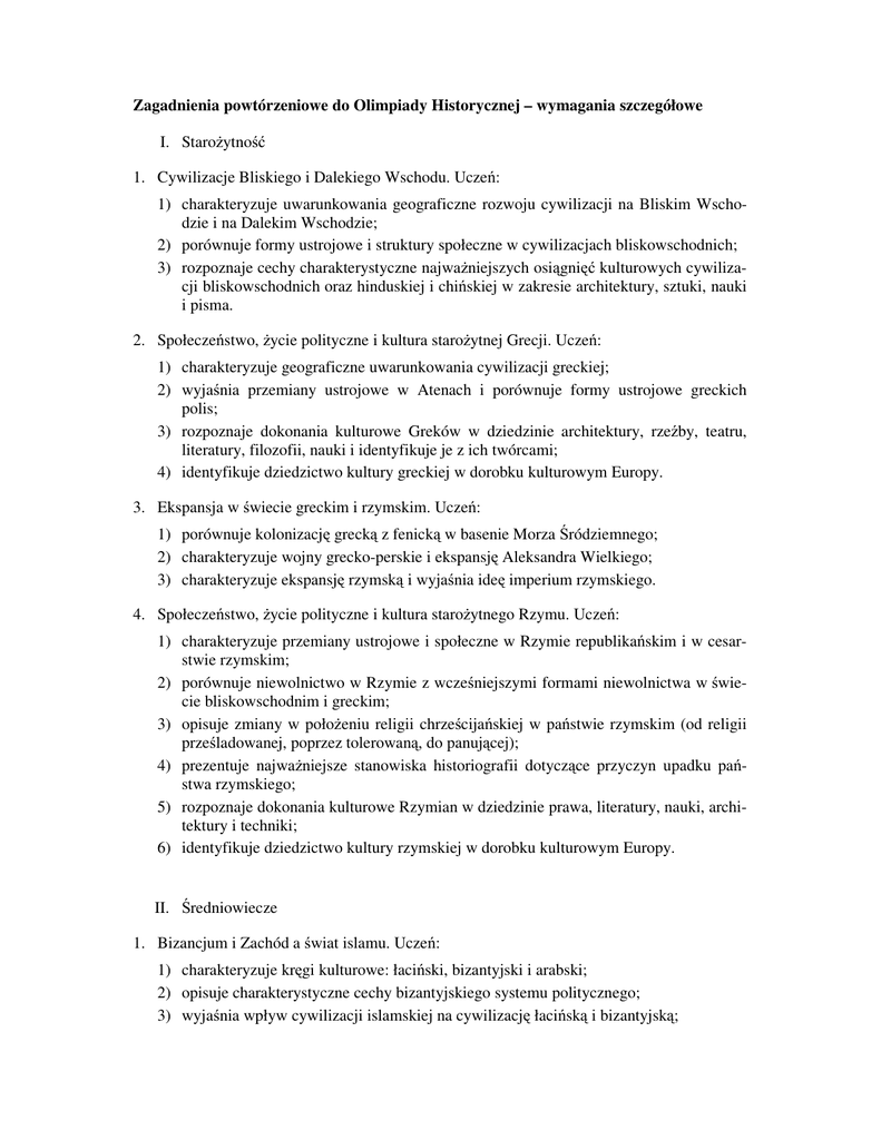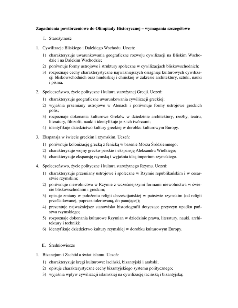 Zagadnienia powtórzeniowe do Olimpiady Historycznej – wymagania szczegółowe I. Starożytność 1. Cywilizacje Bliskiego i Dalekiego Wschodu. Uczeń: 1) charakteryzuje uwarunkowania geograficzne rozwoju cywilizacji na Bliskim Wschodzie i na Dalekim Wschodzie; 2) porównuje formy ustrojowe i struktury społeczne w cywilizacjach bliskowschodnich; 3) rozpoznaje cechy charakterystyczne najważniejszych osiągnięć kulturowych cywilizacji bliskowschodnich oraz hinduskiej i chińskiej w zakresie architektury, sztuki, nauki i pisma. 2. Społeczeństwo, życie polityczne i kultura starożytnej Grecji. Uczeń: 1) charakteryzuje geograficzne uwarunkowania cywilizacji greckiej; 2) wyjaśnia przemiany ustrojowe w Atenach i porównuje formy ustrojowe greckich polis; 3) rozpoznaje dokonania kulturowe Greków w dziedzinie architektury, rzeźby, teatru, literatury, filozofii, nauki i identyfikuje je z ich twórcami; 4) identyfikuje dziedzictwo kultury greckiej w dorobku kulturowym Europy. 3. Ekspansja w świecie greckim i rzymskim. Uczeń: 1) porównuje kolonizację grecką z fenicką w basenie Morza Śródziemnego; 2) charakteryzuje wojny grecko-perskie i ekspansję Aleksandra Wielkiego; 3) charakteryzuje ekspansję rzymską i wyjaśnia ideę imperium rzymskiego. 4. Społeczeństwo, życie polityczne i kultura starożytnego Rzymu. Uczeń: 1) charakteryzuje przemiany ustrojowe i społeczne w Rzymie republikańskim i w cesarstwie rzymskim; 2) porównuje niewolnictwo w Rzymie z wcześniejszymi formami niewolnictwa w świecie bliskowschodnim i greckim; 3) opisuje zmiany w położeniu religii chrześcijańskiej w państwie rzymskim (od religii prześladowanej, poprzez tolerowaną, do panującej); 4) prezentuje najważniejsze stanowiska historiografii dotyczące przyczyn upadku państwa rzymskiego; 5) rozpoznaje dokonania kulturowe Rzymian w dziedzinie prawa, literatury, nauki, architektury i techniki; 6) identyfikuje dziedzictwo kultury rzymskiej w dorobku kulturowym Europy. II. Średniowiecze 1. Bizancjum i Zachód a świat islamu. Uczeń: 1) charakteryzuje kręgi kulturowe: łaciński, bizantyjski i arabski; 2) opisuje charakterystyczne cechy bizantyjskiego systemu politycznego; 3) wyjaśnia wpływ cywilizacji islamskiej na cywilizację łacińską i bizantyjską; 4) rozpoznaje najważniejsze osiągnięcia cywilizacji islamskiej w zakresie architektury, sztuki i nauki. 2. Europa wczesnego średniowiecza. Uczeń: 1) opisuje zasięg terytorialny, organizację władzy, gospodarkę i kulturę państwa Franków; 2) charakteryzuje i porównuje ideę cesarstwa karolińskiego z ideą cesarstwa Ottonów; 3) opisuje proces tworzenia się państw w Europie Zachodniej, z uwzględnieniem najazdów Arabów, Normanów i Węgrów; 4) opisuje proces powstawania państw w środkowowschodniej Europie, z uwzględnieniem wpływu cywilizacji łacińskiej i bizantyjskiej; 5) charakteryzuje funkcjonowanie władzy, struktur społecznych i gospodarki w systemie feudalnym. 3. Europa w okresie krucjat. Uczeń: 1) wyjaśnia ideowe i polityczne przyczyny rywalizacji papiestwa z cesarstwem o zwierzchnictwo nad średniowieczną Europą; 2) charakteryzuje polityczne, społeczno-gospodarcze i religijne uwarunkowania oraz ocenia skutki wypraw krzyżowych do Ziemi Świętej i rekonkwisty; 3) opisuje charakterystyczne przejawy ożywienia społeczno-gospodarczego w Europie XI–XIII w.; 4) opisuje kierunki i charakter oraz konsekwencje najazdów mongolskich dla Europy Środkowo-Wschodniej. 4. Polska w okresie wczesnopiastowskim. Uczeń: 1) 2) 3) 4) prezentuje główne stanowiska historiografii dotyczące etnogenezy Słowian; wyjaśnia uwarunkowania narodzin państwa polskiego i jego chrystianizacji; opisuje rozwój terytorialny państwa polskiego w X–XII w.; rozpoznaje tendencje centralistyczne i decentralistyczne w życiu politycznym państwa polskiego w X–XII w.; 5) synchronizuje najważniejsze wydarzenia z dziejów Polski i Europy w X–XII w. 5. Polska w okresie rozbicia dzielnicowego. Uczeń: 1) wyjaśnia przyczyny polityczne i społeczno-gospodarcze oraz następstwa rozbicia dzielnicowego; 2) porównuje proces formowania się społeczeństwa stanowego w Polsce i w zachodniej Europie; 3) opisuje przemiany społeczno-gospodarcze na ziemiach polskich oraz ocenia społeczno-kulturowe skutki kolonizacji na prawie niemieckim; 4) charakteryzuje proces przezwyciężenia rozbicia politycznego ziem polskich ze wskazaniem na rolę władców i Kościoła; 5) synchronizuje najważniejsze wydarzenia z okresu rozbicia dzielnicowego i dziejów Europy. 6. Europa późnego średniowiecza. Uczeń: 1) wyjaśnia przyczyny kryzysu idei władzy uniwersalnej w Europie późnego średniowiecza; 2) charakteryzuje przemiany społeczne i gospodarcze w Europie w późnym średniowieczu; 3) opisuje zmiany na mapie politycznej Europie w XIV–XV w.; 4) charakteryzuje następstwa upadku cesarstwa bizantyńskiego i ekspansji tureckiej dla Europy. 7. Polska w XIV–XV w. Uczeń: 1) opisuje rozwój terytorialny państwa polskiego w XIV–XV w.; 2) charakteryzuje rozwój monarchii stanowej w Polsce, uwzględniając strukturę społeczeństwa polskiego w późnym średniowieczu i rozwój przywilejów szlacheckich; 3) wyjaśnia międzynarodowe i wewnętrzne uwarunkowania związków Polski z Węgrami i Litwą w XIV–XV w.; 4) charakteryzuje i ocenia stosunki polsko-krzyżackie na płaszczyźnie politycznej, gospodarczej i kulturowej; 5) ocenia panowanie Piastów w dziejach Polski; 6) ocenia politykę dynastyczną Jagiellonów; 7) synchronizuje wydarzenia z dziejów Polski i Europy w XIV–XV w. 8. Kultura średniowiecza. Uczeń: 1) wyjaśnia uniwersalny charakter kultury średniowiecznej; 2) ocenia znaczenie włączenia ziem polskich do cywilizacyjnego kręgu świata zachodniego (łacińskiego); 3) identyfikuje dokonania kultury okresu średniowiecza w zakresie piśmiennictwa, prawa, filozofii, architektury i sztuki, z uwzględnieniem kultury polskiego średniowiec