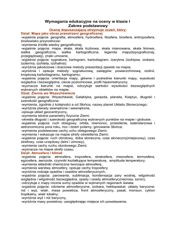 Wymagania edukacyjne na oceny w klasie I Zakres podstawowy Ocenę dopuszczającą otrzymuje uczeń, który: Dział: Mapa jako obraz przestrzeni geograficznej -wyjaśnia pojęcia: geografia, atmosfera, hydrosfera, litosfera, biosfera, antroposfera, środowisko przyrodnicze: -wymienia źródła wiedzy geograficznej. -wyjaśnia pojęcia: mapa, skala, skala liczbowa, skala mianowana, skala liniowa, siatka geograficzna, siatka kartograficzna, legenda mapy(topograficznej, przeglądowej), znaki umowne, -wyjaśnia pojęcia: sygnatura, kartogram, kartodiagram, izarytma (izohipsa, izobara, izoterma, izohieta, izohalina): -wyróżnia jakościowe i ilościowe metody prezentacji zjawisk na mapie, -wyróżnia i opisuje metody: sygnaturową, zasięgów, powierzchniową, izolinii, kropkową kartodiagramu, kartogramu; -wyjaśnia pojęcia: orientacja mapy, główne i pośrednie kierunki mapy, wysokość względna i bezwzględna, ciecie poziomicowe, profil hipsometryczny; -wyznacza kierunki na mapie, odczytuje wartości wysokości bezwzględnych wybranych obiektów na mapie; Dział: Ziemia we Wszechświecie -wyjaśnia pojęcia: Wszechświat, Galaktyka, gwiazda, planeta, Księżyc, długość i szerokość geograficzna; -wymienia, zgodnie z kolejności a od Słońca, nazwy planet Układu Słonecznego; -wyróżnia planety zewnętrzne i wewnętrzne, -opisuje układ geocentryczny, -wymienia istotne parametry fizyczne Ziemi; -określa długość i szerokość geograficzną wybranych punktów na mapie i globusie. -wyjaśnia pojęcia: ruch obiegowy, orbita, równonoc, przesilenie, kalendarzowa i astronomiczna pora roku, noc i dzień polarny, górowanie Słońca; -wymienia podstawowe cechy uchu obiegowego Ziemi; -wymienia i wskazuje na mapie strefy oświetlenia Ziemi; -wyjaśnia pojęcie: ruch obrotowy, doba słoneczna, czas słoneczny(miejscowy), czas strefowy, czas urzędowy (letni i zimowy), -wymienia cechy ruchu obrotowego Ziemi; -wyznacza na mapie strefy czasu, Dział: Atmosfera i klimat -wyjaśnia pojęcia: atmosfera, troposfera, stratosfera, mezosfera, termosfera, egzosfera, aerozole, czynniki kształtujące temperaturę, amplituda temperatury; -wymienia składniki chemiczne tworzące atmosferę, -wymienia warstwy atmosfery, opisuje cechy troposfery; -wyróżnia rodzaje opadów i osadów atmosferycznych; -wyjaśnia pojęcia: parowanie, sublimacja, kondensacja pary wodnej, wilgotność względna i wilgotność bezwzględna, opady i osady atmosferyczne(rosa, szron), -odczytuje z mapy roczne sumy opadów w wybranych regionach świata; -wyjaśnia pojęcia: ciśnienie atmosferyczne, izobara, hektopaskal, układy baryczne: niż i wyż, wiatr, masa powietrza, front atmosferyczny, pasat, monsun, cyklon tropikalny, wiatr lokalny; -wyróżnia wyż i niż baryczny, -wyróżnia masy powietrza, uwzględniając miejsce ich powstawania, -wyjaśnia pojęcia: pogoda, elementy pogody, mapa synoptyczna, stacja meteorologiczna, prognoza krótkoterminowa i długoterminowa; -wyróżnia elementy(składniki) pogody; -wyróżnia na mapie synoptycznej układy baryczne, fronty atmosferyczne, rodzaje opadów i wartości temperatur, -wyjaśnia pojęcia: klimat, klimat morski i kontynentalny, czynnik klimatotwórczy, diagram klimatyczny (klimatogram); -wyjaśnia pojęcia: typ klimatu, strefa klimatyczna, klimat strefowy, klimat astrefowy, klimat lokalny; -wymienia i wskazuje na mapie strefy klimatyczne, Dział: Hydrosfera -wyjaśnia pojęcia: hydrosfera, bilans wodny, retencja, parowanie, sublimacja, infiltracja; -wymienia podstawowe właściwości wody; -wyjaśnia pojęcia: wszechocean, morze(przybrzeżne, śródziemne, międzywyspowe), pływy(przypływy i odpływy),prądy, falowanie, zasolenie; -wyróżnia typy mórz i wskazuje na mapie wybrane przykłady; -wymienia przykłady oddziaływania wody morskiej na wybrzeże; -wyjaśnia pojęcia: rzeka główna, dorzecze, zlewisko, dział wodny, rzeki okresowe, rzeki epizodyczne, powódź, jezioro, wody artezyjske, źródło; -wymienia typy rzek wyróżnione ze względu na ciągłość zachowania; -wyróżnia kryteria klasyfikacji jezior; -wymienia podstawowe typy genetyczne jezior i wskazuje ich przykłady na mapie; -wyjaśnia pojęcia: lodowiec górski, lądolód, granica wieloletniego śniegu, pole firnowe, jęzor lodowcowy, wieloletnia zmarzlina; -wyróżnia i opisuje warunki klimatyczne i orograficzne niezbędne do powstania lodowców górskich i lądolodów; Dział: Wewnętrzne procesy kształtujące litosferę -wyjaśnia pojęcia: skorupa ziemska, skorupa kontynentalna, skorupa oceaniczna, płaszcz ziemski, -wyróżnia i nazywa warstwy budujące wnętrze Ziemi, uwzględniając ich zmiany składu chemicznego i właściwości fizycznych; -wyróżnia ery i okresy dziejów Ziemi; -wyjaśnia pojęcia: minerał, skała, skały magmowe, osadowe, metamorficzne(przeobrażone); -wymienia cechy minerałów oraz przykłady minerałów skałotwórczych; -wyjaśnia pojęcia: dryf kontynentów, płyty litosfery(kontynentalna, oceaniczna), prądy konwekcyjne, strefa subdukcji, strefa ryftu, strefa kolizji; -wyróżnia na schemacie(rysunku) strefy ryftów, subdukcji i kolizji; -wskazuje na mapie tektonicznej świata płyty litosfery, grzbiety śródoceaniczne, strefy subdukcji i ryftów; -wyjaśnia pojęcia: plutonizm, intruzja magmowa, wulkan, wulkanizm, lawa, magma, krater, materiał piroklastyczny, stratowulkan; -wymienia elementy budowy wulkanu, -wymienia produkty erupcji wulkanicznych, -wyjaśnia pojęcia: trzęsienia ziemi, epicentrum, hipocentrum, sejsmograf, obszary sejsmiczne, pensejsmiczne, asejsmiczne; -klasyfikuje trzęsienia ziemi ze względu na ich genezę; -wymienia negatywne skutki trzęsień ziemi, -wyjaśnia pojęcia: platforma, płaszczowina, monoklina, niecka, płyta, pasmo fałdowe, zrąb tektoniczny, rów tektoniczny, przekrój geologiczny; -wyjaśnia pojęcia: krzywa hipsograficzna, góry, wyżyny, niziny, wysokość względna, wysokość bezwzględna, szelf, grzbiet, basen i r