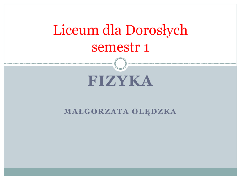 Liceum dla Dorosłych semestr 1 FIZYKA MAŁGORZATA OLĘDZKA Temat 1: O ODKRYCIACH KOPERNIKA, KEPLERA I NEWTONA. 1) Teoria Ptolemeusza Inaczej: teoria geocentryczna. Nieruchoma Ziemia jest centrum świata i zajmuje w nim wyjątkowe, uprzywilejowane miejsce. Wokół Ziemi poruszają się po okręgach Słońce, Księżyc i gwiazdy a po bardziej skomplikowanych torach – planety. 2) Teoria Kopernika 1543r. „O obrotach sfer niebieskich” –dzieło Mikołaja Kopernika. Inaczej – teoria heliocentryczna. Ziemia wraz z obiegającym ją Księżycem i inne planety krążą wokół Słońca po torach, których kształt jest zbliżony do okręgów. Ziemia obraca się również wokół własnej osi, a konsekwencją tego ruchu jest następstwo dnia i nocy. 3) Odkrycia Keplera 1609r. „Nowa astronomia” – dzieło Johannesa Keplera. I prawo Keplera: Orbita każdej planety jest elipsą, a Słońce znajduje się w jednym z jej ognisk, wspólnym dla wszystkich planet. Odkrycia Keplera c.d. II prawo Keplera: Promień wodzący planety (czyli odcinek łączący planetę ze Słońcem) zakreśla w jednakowych odstępach czasu figury o takich samych polach powierzchni. Odkrycia Keplera c.d. Wniosek z II prawa Keplera: Podczas ruchu planety po eliptycznym torze zmienia się jej odległość od Słońca i szybkość. Gdy planeta znajduje się najdalej od Słońca, jej szybkość jest najmniejsza, a gdy najbliżej – największa. P A P - peryhelium A - aphelium 4) Hipoteza Newtona o jedności Wszechświata Takie same oddziaływania są odpowiedzialne za zachowanie ciał nie tylko na Ziemi, ale i we Wszechświecie. Zatem prawa fizyki sformułowane dla otaczających nas przedmiotów można stosować również do planet i gwiazd, czyli obiektów, których nie możemy bezpośrednio badać w doświadczeniach.