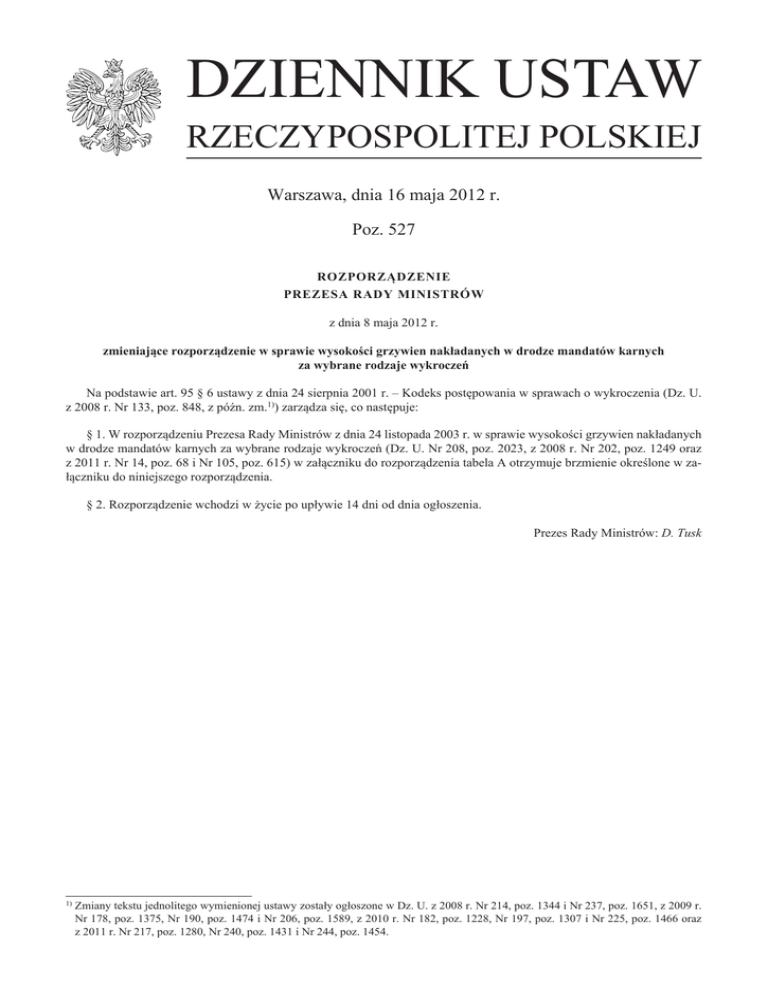 DZIENNIK USTAW RZECZYPOSPOLITEJ POLSKIEJ Warszawa, dnia 16 maja 2012 r. Poz. 527 ROZPORZĄDZENIE PREZESA RADY MINISTRÓW z dnia 8 maja 2012 r. zmieniające rozporządzenie w sprawie wysokości grzywien nakładanych w drodze mandatów karnych za wybrane rodzaje wykroczeń Na podstawie art. 95 § 6 ustawy z dnia 24 sierpnia 2001 r. – Kodeks postępowania w sprawach o wykroczenia (Dz. U. z 2008 r. Nr 133, poz. 848, z późn. zm.1)) zarządza się, co następuje: § 1. W rozporządzeniu Prezesa Rady Ministrów z dnia 24 listopada 2003 r. w sprawie wysokości grzywien nakładanych w drodze mandatów karnych za wybrane rodzaje wykroczeń (Dz. U. Nr 208, poz. 2023, z 2008 r. Nr 202, poz. 1249 oraz z 2011 r. Nr 14, poz. 68 i Nr 105, poz. 615) w załączniku do rozporządzenia tabela A otrzymuje brzmienie określone w załączniku do niniejszego rozporządzenia. § 2. Rozporządzenie wchodzi w życie po upływie 14 dni od dnia ogłoszenia. Prezes Rady Ministrów: D. Tusk 1) miany tekstu jednolitego wymienionej ustawy zostały ogłoszone w Dz. U. z 2008 r. Nr 214, poz. 1344 i Nr 237, poz. 1651, z 2009 r. Z Nr 178, poz. 1375, Nr 190, poz. 1474 i Nr 206, poz. 1589, z 2010 r. Nr 182, poz. 1228, Nr 197, poz. 1307 i Nr 225, poz. 1466 oraz z 2011 r. Nr 217, poz. 1280, Nr 240, poz. 1431 i Nr 244, poz. 1454. Dziennik Ustaw –2– Poz. 527 Załącznik Załącznik do rozporządzenia Prezesa Rady do rozporządzenia Ministrów z dnia 8 maja 2012 r. (poz. 527) Prezesa Rady Ministrów z dnia 8 maja 2012 r. WYSOKOŚĆ GRZYWIEN NAKŁADANYCH W DRODZE MANDATU KARNEGO ZA WYBRANE RODZAJE WYKROCZEŃ PRZEZ UPRAWNIONE ORGANY WYSOKOŚĆ GRZYWIEN NAKŁADANYCH W DRODZE MANDATU KARNEGO TABELA A TABELA A ZA WYBRANE RODZAJE WYKROCZEŃ PRZEZ UPRAWNIONE ORGANY Lp. Kwalifikacja prawna – ustawa wg opisu pod tabelą* Naruszenie Grzywna w zł 1 2 3 4 1 art. 51 § 1 i 2 k.w. Zakłócenie spokoju, porządku publicznego, spoczynku nocnego albo wywoływanie zgorszenia w miejscu publicznym od 100 do 500 2 art. 64 § 1 k.w. Nieumieszczenie przez właściciela, administratora, dozorcę lub użytkownika nieruchomości tabliczki z numerem porządkowym nieruchomości, nazwą ulicy lub placu albo miejscowości 100 3 art. 65 § 1 i 2 k.w. Umyślne wprowadzenie w błąd co do danych osobowych organu państwowego lub instytucji upoważnionej do legitymowania od 200 do 500 4 art. 67 § 1 k.w. Umyślne uszkodzenie lub usunięcie ogłoszenia wystawionego publicznie przez instytucję państwową, samorządową albo organizację społeczną 150 5 art. 77 k.w. Niezachowanie środków ostrożności przy trzymaniu zwierzęcia od 50 do 250 6 art. 78 k.w. Doprowadzenie zwierzęcia poprzez drażnienie lub płoszenie do tego, że staje się niebezpieczne od 250 do 500 Niszczenie roślinności ochronnej na brzegach wód morskich i śródlądowych 100 8 Niszczenie płotków faszynowych 100 9 Zdejmowanie chrustu z wydm 100 10 Chodzenie lub przebywanie na wydmach 50 11 Niszczenie ogrodzeń wydm i lasu 200 12 Biwakowanie na wydmach 300 13 Niszczenie tablic informacyjno-ostrzegawczych na wydmach i w lasach 100 14 Niszczenie umocnień brzegowych 500 7 art. 81 k.w. 15 art. 82 § 1–5 k.w. Naruszenie przepisów o ochronie przeciwpożarowej 16 art. 117 k.w. Naruszenie obowiązku czystości i porządku w obrębie nieruchomości 17 art. 140 k.w. Publiczne dopuszczenie się nieobyczajnego wybryku od 50 do 100 18 art. 141 k.w. Umieszczenie w miejscu publicznym nieprzyzwoitego ogłoszenia, napisu lub rysunku albo używanie słów nieprzyzwoitych od 50 do 100 19 art. 145 k.w. Zanieczyszczanie lub zaśmiecanie miejsca dostępnego dla publiczności od 50 do 500 20 art. 10 ust. 2 u.u.c.p.g. Niewyposażenie nieruchomości w pojemniki służące do zbierania odpadów komunalnych 100 Niezbieranie powstałych na terenie nieruchomości odpadów komunalnych 100 21 od 50 do 500 100 Dziennik Ustaw 1 –3– 2 Poz. 527 3 4 Nieuprzątanie błota, śniegu, lodu i innych zanieczyszczeń z chodników położonych wzdłuż nieruchomości 100 Wykonywanie prac geologicznych bez posiadania wymaganych kwalifikacji 300 24 Dozorowanie prac geologicznych bez posiadania wymaganych kwalifikacji 300 25 Kierowanie pracami geologicznymi bez posiadania wymaganych kwalifikacji 300 22 23 art. 178 u.p.g.g. art. 179 pkt 1 u.p.g.g. Wykonywanie robót geologicznych w celach innych niż poszukiwanie lub rozpoznawanie złóż kopalin: 26 1) bez zatwierdzonego projektu robót geologicznych 300 27 2) z naruszeniem warunków określonych w projekcie robót geologicznych 200 28 3) bez przedłożenia projektu robót geologicznych, który nie podlega zatwierdzeniu 300 29 4) z naruszeniem warunków określonych w projekcie robót geologicznych, który nie podlega zatwierdzeniu 200 art. 179 pkt 2 u.p.g.g. Niezawiadomienie właściwych organów o zamiarze rozpoczęcia wykonywania robót geologicznych 300 art. 181 pkt 1 u.p.g.g. Wykonywanie bez posiadania wymaganych kwalifikacji: 30 31 1) czynności kierownictwa ruchu zakładu górniczego 300 32 2) czynności dozoru ruchu zakładu górniczego 300 33 3) innych czynności w ruchu zakładu górniczego 300 34 art. 181 pkt 2 u.p.g.g. 35 art. 183 u.p.g.g. Wykonywanie bez posiadania wymaganych kwalifikacji: 1) czynności kierownictwa w podmiotach zawodowo trudniących się ratownictwem górniczym 300 2) czynności specjalistów w podmiotach zawodowo trudniących się ratownictwem górniczym 300 Niedopełnienie obowiązków w zakresie: 36 1) prowadzenia ewidencji zasobów złoża kopaliny 300 37 2) przedkładania informacji o zmianach zasobów złoża kopaliny 300 38 3) posiadania wymaganej dokumentacji mierniczo-geologicznej 300 39 4) sporządzania wymaganej dokumentacji mierniczo-geologicznej 300 40 5) aktualizowania wymaganej dokumentacji mierniczo-geologicznej 250 41 6) uzupełniania wymaganej dokumentacji mierniczo-geologicznej 250 art. 184 ust. 3 pkt 1 u.p.g.g. Wykonywanie czynności w ruchu zakładu górniczego, w sposób mogący wywołać niebezpieczeństwo dla ż