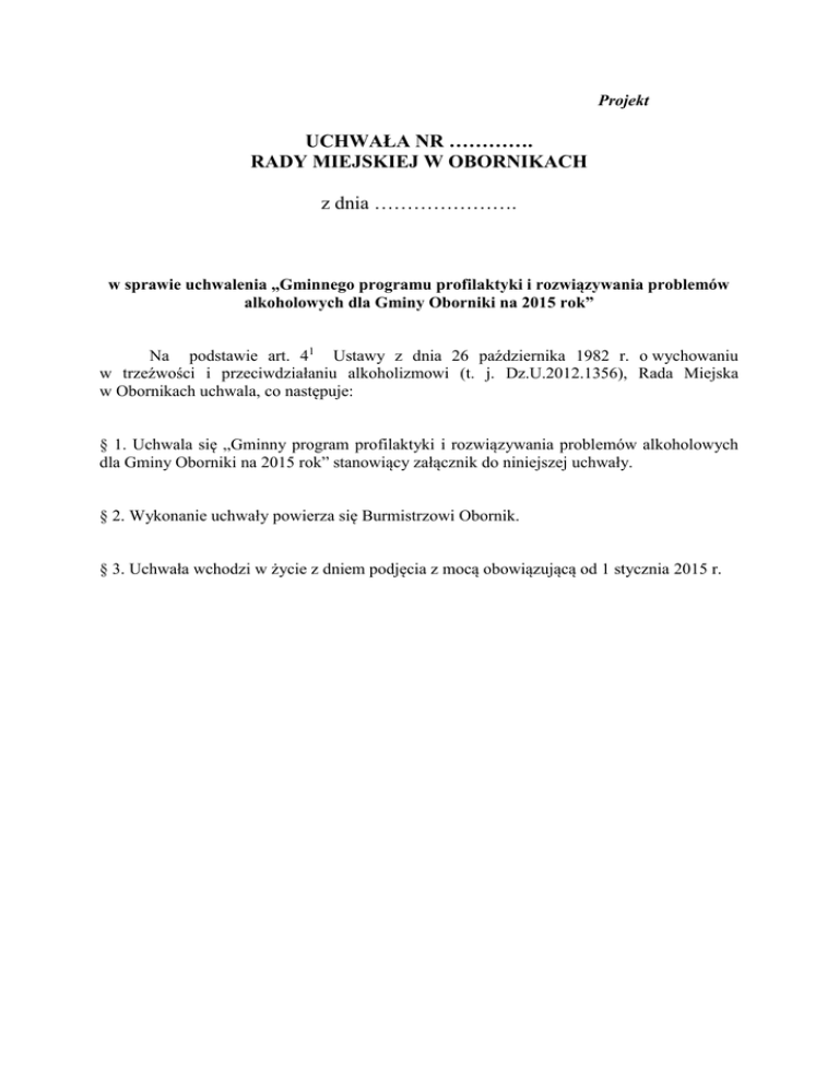 Projekt UCHWAŁA NR …………. RADY MIEJSKIEJ W OBORNIKACH z dnia …………………. w sprawie uchwalenia „Gminnego programu profilaktyki i rozwiązywania problemów alkoholowych dla Gminy Oborniki na 2015 rok” Na podstawie art. 41 Ustawy z dnia 26 października 1982 r. o wychowaniu w trzeźwości i przeciwdziałaniu alkoholizmowi (t. j. Dz.U.2012.1356), Rada Miejska w Obornikach uchwala, co następuje: § 1. Uchwala się „Gminny program profilaktyki i rozwiązywania problemów alkoholowych dla Gminy Oborniki na 2015 rok” stanowiący załącznik do niniejszej uchwały. § 2. Wykonanie uchwały powierza się Burmistrzowi Obornik. § 3. Uchwała wchodzi w życie z dniem podjęcia z mocą obowiązującą od 1 stycznia 2015 r. Uzasadnienie Zgodnie z art. 4 1 Ustawy o wychowaniu w trzeźwości i przeciwdziałaniu alkoholizmowi, prowadzenie działań związanych z profilaktyką i rozwiązywaniem problemów alkoholowych oraz integracja społeczna osób uzależnionych należy do zadań własnych gminy. „Gminny program profilaktyki i rozwiązywania problemów alkoholowych” uchwalany corocznie przez Radę Miejską na podstawie art. 41 ustawy o wychowaniu w trzeźwości i przeciwdziałaniu alkoholizmowi jest aktem prawnym, na podstawie którego prowadzona jest realizacja wskazanych działań. W związku z powyższym, podjęcie uchwały w sprawie uchwalenia „Gminnego programu profilaktyki i rozwiązywania problemów alkoholowych dla Gminy Oborniki na 2015 rok” jest w pełni uzasadnione. Gminny program profilaktyki i rozwiązywania problemów alkoholowych dla Gminy Oborniki na 2015 rok Treść programu: I. Wstęp II. Podstawowe cele i strategie oraz kierunki działania III.Zasady wynagradzania członków Gminnej Komisji Rozwiązywania Problemów Alkoholowych IV. Finanse I. Wstęp Gminny Program Profilaktyki i Rozwiązywania Problemów Alkoholowych dla Gminy Oborniki na 2015 rok jest kontynuacją działań realizowanych w tym zakresie od kilku lat na terenie Gminy. Zaplanowane działania są corocznie poddawane ocenie i udoskonalane, po to, by realizacja jego celów przynosiła wymierne korzyści dla poszczególnych grup mieszkańców naszej Gminy. Podstawą tworzenia Gminnego programu profilaktyki i rozwiązywania problemów alkoholowych jest: 1. 2. 3. 4. 5. Ustawa z dnia 26 października 1982 r. o wychowaniu w trzeźwości i przeciwdziałaniu alkoholizmowi (t. j. Dz. U. 2012.1356.) Ustawa z dnia z dnia 9 czerwca 2011 r. o wspieraniu rodziny i systemie pieczy zastępczej (t. j. Dz. U. 2013 135 ze zm.) Ustawa z dnia 12 marca 2004r. o pomocy społecznej (t. j. Dz. U. 2015.163 ze zm.) Ustawa z dnia 29 lipca 2005 r o przeciwdziałaniu przemocy w rodzinie (Dz. U. 2005.180.1493 ze zm.) Ustawa z dnia 24 kwietnia 2003 r. o działalności pożytku publicznego i o wolontariacie (t. j. Dz. U. 2014.1118 ze zm.). Gminny program profilaktyki i rozwiązywania problemów alkoholowych nie jest szczegółowym wykazem poszczególnych zadań realizowanych przez Gminę, ale określa jego politykę w stosunku do zadań nałożonych przez ustawę. Z uwagi na fakt, iż rozwiązywanie problemów społecznych wymaga współdziałania szeregu instytucji, np. administracji, służby zdrowia, oświaty, policji, pomocy społecznej, kościoła oraz organizacji pozarządowych koniecznym jest koordynacja wszystkich służb, instytucji działających na rzecz trzeźwości, przeciwdziałaniu przemocy związanej z alkoholem oraz niwelowanie skutków alkoholizmu. II. Podstawowe cele i strategie oraz kierunki działania Program przygotowany na 2015 r. jest zgodny z ustawą, jak również z założeniami rekomendacji do realizowania i finansowania gminnych programów oraz programów zalecanych przez Państwową Agencję Rozwiązywania Problemów Alkoholowych. Celami strategicznymi Gminnego Programu Profilaktyki i Rozwiązywania Problemów Alkoholowych dla Gminy Oborniki w 2015 roku są: 1. Zwiększenie dostępności pomocy terapeutycznej i rehabilitacyjnej dla osób uzależnionych od alkoholu Działalność Ośrodka Profilaktyki i Rozwiązywania Problemów Alkoholowych w Obornikach przy ul. Piłsudskiego 76 jako „miejsca pierwszego kontaktu" poprzez: 1) udzielanie pomocy i informacji osobom uzależnionym i członkom ich rodzin, 2) motywowanie osób uzależnionych i współuzależnionych do podjęcia terapii, 3) opracowanie diagnozy problemów uzależnień i przemocy na terenie gminy Oborniki, 4) opracowanie ulotki o formach pomocy dla rodzin z problemami uzależnień i przekazywanie ich podczas spotkań komisji motywacyjnych, 5) rozpoznawanie zjawiska przemocy domowej, 6) udzielanie stosownego wsparcia i informacji o możliwościach uzyskania pomocy i powstrzymania przemocy, 7) współpraca ośrodka z grupami AA, AL ANON Wymienione wyżej zadania mają charakter ciągły, realizowane przez: - pracownika Ośrodka Profilaktyki i Rozwiązywania Problemów Alkoholowych w Obornikach, - Gminną Komisję Rozwiązywania Problemów Alkoholowych w Obornikach, - terapeutę uzależnień zatrudnionego w Ośrodku. 8) zabezpieczenie środków na wynagrodzenie dla osoby tam zatrudnionej i członków GKRPA, 9) zatrudnienie wykwalifikowanego terapeuty uzależnień, pracującego w zakładzie lecznictwa odwykowego, 10) pomoc osobom uzależnionym po przebytym podstawowym programie terapii, 11) zakup literatury związanej z problemami alkoholowymi i rozpropagowanie ich na spotkaniach motywacyjnych GKRPA oraz w szkołach, 12) pokrywanie częściowo kosztów utrzymania ośrodka. 2. Udzielanie rodzinom, w których występują problemy alkoholowe, pomocy psychospołecznej i prawnej, a w szczególności ochrony przed przemocą poprzez: 1) przyjmowanie zgłoszeń o przypadkach nadużywania alkoholu, 2) prowadzenie poradnictwa dla osób uzależnionych jak również rodzin tych osób, 3) zapraszanie na rozmowę interwencyjno - motywacyjną osób, co do których wpłynęło zgłoszenie oraz rozpoznawanie w trakcie rozmowy zjawiska przemocy w ro