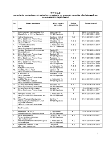 WYKAZ podmiotów posiadających aktualne zezwolenia na sprzedaż napojów alkoholowych na terenie GMINY DĄBRÓWNO Lp. Nazwa podmiotu Adres punktu sprzedaży Rodzaj zezwolenia Data ważności Detal 1. Polski Koncern Naftowy Orlen S.A. Stacja Paliw nr 1040 w Dąbrównie Jabłonowo 5B, 14-120 Dąbrówno C A 24.06.2014-30.06.2024 01.06.2015-30.06.2024 2. Halina Górzkowska Sklep Spożywczo-Przemysłowy Sklep Spożywczo-Przemysłowy Zbigniew Meller Firma Handlowa ABC Ewa Rucińska Sklep Spożywczo-Przemysłowy Artykuły Spożywczo-Przemysłowe Marek Zalewski Sklep Spożywczo-Przemysłowy Krystyna Sznarkowska Sklep Spożywczo-Przemysłowy Tomasz Chełchowski Sklep Spożywczo-Przemysłowy Teresa Wasilewska Osiekowo 5 lok. 2 14-120 Dąbrówno Wierzbica 19, 14-120 Dąbrówno ul. Kościuszki 10C, 14-120 Dąbrówno A,B 01.06.2013-31.05.2017 A, B, C 01.07.2015-30.06.2025 A, B, C 18.05.2013-31.05.2017 Samin 13A, 14-120 Dąbrówno Saminek 12, 14-120 Dąbrówno Tułodziad 11, 14-120 Dąbrówno Marwałd 22, 14-120 Dąbrówno A, B, C 01.07.2015-30.06.2025 A 01.07.2015-30.06.2025 A, B, C 01.07.2015-30.06.2025 A B 01.07.2015-30.06.2020 01.07.2015-30.04.2020 ABC bis Patryk Paweł Korona HANDEL Hanna Psiuk Sklep Spożywczo-Przemysłowy F.H.U. LOTOS Jerzy Kowanda Sklep Spożywczo-Przemysłowy JULMAT Sp. z o.o. Paweł Stanisław Matczak Sklep Spożywczo-Przemysłowy Lucyna Dominik-Wilczewska Sklep Spożywczo-Przemysłowy Lucyna Dominik-Wilczewska Sklep Spożywczo-Przemysłowy ul. Kościuszki 10, 14-120 Dąbrówno Elgnowo 12, 14-120 Dąbrówno Wierzbica 17/2a, 14-120 Dąbrówno A, B, C 01.11.2015-31.10.2025 A, B, C 01.07.2015-30.06.2025 A, B, C 01.07.2012-30.06.2016 ul. Kościuszki 19, 14-120 Dąbrówno A, B, C 24.08.2012-31.08.2016 Tułodziad 16, 14-120 Dąbrówno Marwałd 35, 14-120 Dąbrówno A, B, C 21.04.2015-30.04.2020 A, B C 17.05.2013-31.05.2017 02.01.2014-31.05.2017 ABC plus Korona Zofia Sklep Spożywczo-Przemysłowy „ABC plus” Handel Artykułami SpożywczoPrzemysłowymi i Podnajem Lokali Zygmunt Józefowicz Sklep Spożywczo-Przemysłowy ul. Kościuszki 10, 14-120 Dąbrówno A 01.06.2015-31.05.2025 Gardyny 7, 14-120 Dąbrówno A, B, C 01.07.2015-30.06.2025 ul. Ogrodowa 7, 14-120 Dąbrówno Leszcz dz. Nr 121/14, 14-120 Dąbrówno A, C 22.04.2013-31.05.2017 A, B 12.04.2013-31.05.2017 ul. Kościuszki 10, 14-120 Dąbrówno Okrągłe 1A, 14-120 Dąbrówno A, C 10.08.2014-31.08.2024 A, B 01.07.2012-30.06.2016 3. 4. 5. 6. 7. 8. 9. 10. 11. 12. 13. 14. 15. 16. Gastronomia 1. 2. 3. 4. Pensjonat „ZACISZE” Usługi Hotelarsko Gastronomiczne Irena Jędrzejewska Firma Handlowo-Usługowa „Bar nad jeziorem” Przedsiębiorstwo Handlowo-Usługowe Tatiana Piątek Agnieszka Zarzecka „A-Art.” Bar „Chata Wuja Toma” 1 5. LAKE LAND Hanna Przepióra Bar 6. „ELWOX” Wojciech Witkowski Willa Dąbrowa Nadwiślańska Agencja Turystyczna Sp. z o.o. w Tychach Ośrodek Wypoczynkowy „INTERPIAST” kawiarnia 7. Wzgórze Letniskowe Dąbrowa 28, 14-120 Dąbrówno ul. Dębowa 45, 14-120 Dąbrówno Kalbornia 3, 14-120 Dąbrówno A, B 01.07.2012-30.06.2016 A 01.04.2015-31.03.2020 A, B, C 01.05.2015-30.04.2020 2
