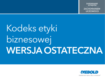 ZAPEWNIANIE WYNIKÓW z ZACHOWANIEM UCZCIWOŚCI Kodeks etyki biznesowej WERSJA OSTATECZNA SPIS TREŚCI Contents Wiadomość od naszego prezesa i dyrektora generalnego........................ 3 Nasze właściwe używanie informacji o konkurencji................................................................. 13 Wizja, misja i wartości firmy Diebold.4 Nasze lobbowanie i działania polityczne............ 16 Dlaczego nasze wartości są tak ważne?........6 Gdzie, kiedy i kogo obowiązuje nasz Kodeks etyki biznesowej?...................................6 Przygotowujemy nasze dokumenty biznesowe i finansowe ze wzorową uwagą i troską........................................................................ 17 Przyjmij, że Kodeks zawsze obowiązuje................ 6 Nasze wyniki finansowe............................................ 17 Z kim mogę się konsultować w sytuacjach budzących wątpliwości?......................................7 Oczekujemy, że kierownicy będą pełnić rolę przewodników................................................................ 7 Wszyscy mamy obowiązek zgłaszania potencjalnych naruszeń Kodeksu........................... 8 Działania odwetowe są surowo zabronione i nie będą tolerowane.................................................. 8 Jak firma rozpatruje potencjalne naruszenia Kodeksu?.............................................8 Wartości firmy Diebold RZETELNOŚĆ..................................... 9 Nasze dokumenty biznesowe................................. 18 Jesteśmy zaangażowani w prawa człowieka oraz czyste, bezpieczne i zdrowe środowisko........................................... 19 Wartości firmy Diebold WSPÓŁPRACA.................................... 20 Rozwijamy właściwe relacje ze stronami trzecimi.................................................. 21 Nasze kontakty z klientami.......................................21 Nasza współpraca z dostawcami i innymi podmiotami...................................................................21 Nasza współpraca z rządem....................................22 Chronimy nasze zasoby..................................... 27 Nasze aktywa................................................................27 Nasza własność intelektualna.................................28 Nasze komputery i systemy komunikacji...............29 Wartości firmy Diebold WIEDZA...30 Jesteśmy dumni i uczciwi w naszych komunikatach skierowanych do opinii publicznej................................................................. 31 Nasze kontakty z opinią publiczną........................31 Używanie przez nas mediów społecznościowych....................................................31 Nigdy nie wykorzystujemy niewłaściwie informacji wewnętrznych................................. 31 Szanujemy prywatność naszych pracowników, klientów i użytkowników końcowych............................................................... 32 Wiadomość od naszego wiceprezesa i głównego specjalisty ds. zgodności z przepisami............................................33 Utrzymujemy środowisko pracy, w którym panuje atmosfera szacunku dla innych...... 10 Właściwie postępujemy w kwestiach prezentów i rozrywki............................................ 23 Nasze miejsce pracy wolne od przypadków nękania............................................................................10 Unikamy konfliktów interesów...................... 24 Zasoby firmy Diebold..........................34 Sumiennie przestrzegamy wszystkich międzynarodowych przepisów o handlu..25 Indeks....................................................... 38 Nasze zaangażowanie w równe szanse............... 11 Nasze odpowiedzialne zachowanie w miejscu pracy................................................................................. 11 Zawsze postępujemy zgodnie z uczciwymi i etycznymi praktykami biznesowymi........ 12 Nasze zobowiązanie do konkurowania w sposób uczciwy........................................................ 12 2 Nasza czujność w zakresie przekupstwa............ 14 Chronimy poufne informacje.......................... 27 Wartości firmy Diebold INNOWACJA........................................ 26 Jesteśmy dumni z naszych produktów i usług......................................................................... 27 Dokonaj zgłoszenia na stronie EthicsPoint lub przejdź do części Zasoby firmy Diebold aby uzyskać informacje o numerach telefonów do naszej Infolinii Zasad Etycznych. A Message from President WIADOMOŚĆ ODOur NASZEGO PREZESA and Chief Executive Officer I DYREKTORA GENERALNEGO “W firmie Diebold jesteśmy dumni z naszej kultury otwartych drzwi, w której nie są tolerowane akty odwetu, mile widziane jest zadawanie pytań i zachęcamy do dialogu.” Nasza wspólna praca w firmie Diebold opiera się Kodeks obowiązuje w całej rodzinie spółek firmy za zadawanie pytań lub zgłoszenie wątpliwości na naszych kluczowych wartościach: rzetelności, Diebold i w każdym miejscu, w którym prowadzimy zgodnie z prawdą. W firmie Diebold jesteśmy współpracy, innowacji i wiedzy. Te wartości działalność. Poświęć chwilę, aby przeczytać Kodeks dumni z naszej kultury otwartych drzwi, w której nie ukierunkowują nasze codzienne decyzje i i zrozumieć, jak jego zasady i wytyczne mają są tolerowane działania odwetowe, mile widziane zapewniają zasady przewodnie dla naszej pracy, zastosowanie w Twojej pracy. Używaj go jako ram jest zadawanie pytań i zachęcamy do dialogu. której celem jest dostarczanie innowacyjnych do działania w sposób uczciwy i etyczny. technologii i usług, które umacniają pozycje firm. Wszyscy odgrywamy rolę w zapewnianiu sukcesu Oczekujemy, że będziesz przestrzegać Kodeksu i firmy Diebold. Dziękuję za Twoje zaangażowanie Jestem bardzo zadowolony, że mogę jego zasad. Nigdy nie należy podejmować działań, w uczciwość biznesową. przedstawić nasz Kodeks etyki bi