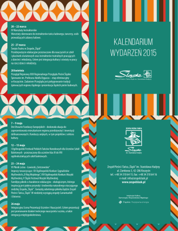 20 – 22 marca IV Warsztaty Instruktorskie Warsztaty skierowane do instruktorów tańca ludowego, tancerzy, osób prowadzących zabawy ludowe. 25 - 27 marca Święto Teatru w Zespole „Śląsk” Przedsięwzięcie edukacyjne przeznaczone dla nauczycieli ze szkół i placówek oświatowych oraz instruktorów teatralnych pracujących z dziećmi i młodzieżą. Celem jest integracja kultury i oświaty w pracy na rzecz dzieci i młodzieży. KALENDARIUM wyDarzeń 2015 20 kwietnia Przegląd Rejonowy XXII Regionalnego Przeglądu Pieśni Śląskie Śpiewanie im. Profesora Adolfa Dygacza – etap eliminacyjny w Koszęcinie. Zadaniem Przeglądu jest pielęgnowanie tradycji śpiewaczych regionu śląskiego i prezentacja śląskich pieśni ludowych. 7 – 9 maja Dni Otwarte Funduszy Europejskich - doskonała okazja do zaprezentowania mieszkańcom regionu przedsięwzięć i inwestycji dofinansowanych z funduszy unijnych, w tym projektów z sektora kultury. 12 – 15 maja I Ogólnopolski Festiwal Polskich Tańców Narodowych dla Uczniów Szkół Baletowych - przeznaczony dla uczniów klas III do VIII ogólnokształcących szkół baletowych. 23 – 24 maja VI Piknik Leśno - Łowiecki „Cietrzewisko” Imprezy towarzyszące: XX Ogólnopolski Konkurs Sygnalistów Myśliwskich „O Róg Wojskiego”, XVI Ogólnopolski Konkurs Muzyki Myśliwskiej, V Śląski Festiwal Muzyki Myśliwskiej. Familijny piknik o charakterze edukacyjno - ekologicznym, którego inspiracją jest piękno przyrody i środowiska naturalnego otaczającego siedzibę Zespołu „Śląsk” . Gwiazdą sobotniego pikniku będzie Zespół Pieśni i Tańca „Śląsk”. W niedzielę wystąpią zespoły Carrantuohill i Universe. 26 maja Integracyjna Scena Prezentacji Uczniów i Nauczycieli. Celem prezentacji jest promowanie działań twórczego nauczyciela i ucznia, a także integracja międzypokoleniowa. Zespół Pieśni i Tańca „Śląsk” im. Stanisława Hadyny ul. Zamkowa 3, 42-286 Koszęcin tel. +48 34 310 64 15; fax: +48 34 310 64 16 e-mail: [email protected] www.zespolslask.pl 11 czerwca Dzień otwarty w Zespole „Śląsk”w ramach, którego przewidzieliśmy wiele atrakcji. Gala Edukacji Regionalnej Koncert Galowy Regionalnego Przeglądu Pieśni „Śląskie Śpiewanie“ im. prof. Adolfa Dygacza - w ramach VIII Metropolitarnego Święta Rodziny. 5 - 12 lipca Letnia Szkoła Artystyczna 2015. X Warsztaty Polskich Tańców Ludowych i Narodowych. Warsztaty skierowane do tancerzy ludowych na różnym poziomie. Podczas zajęć uczestnicy mają okazję poznać polskie tańce regionalne i narodowe, a także różne techniki tańca mobilizujące do pracy nad doskonaleniem własnego poziomu technicznego i artystycznego. 13 czerwca Industriada. Tylko w czasie INDUSTRIADY możesz jednego dnia wsiąść do kolejki wąskotorowej, zobaczyć jak wydobywano węgiel, zjechać do zabytkowych podziemi kopalni srebra, poznać zabytki kolei, sprawdzić jak drukowano prasę... 17 - 26 lipca Letnia Szkoła Artystyczna 2015. XI Międzynarodowa Letnia Szkoła Tańca Współczesnego. Warsztaty skierowane do tancerzy na poziomie zaawansowanym i średniozaawansowanym. Dziesięciodniowy, intensywny program umożliwia tancerzom pogłębienie praktyki technik tj. Klasyka, Modern, Jazz, Improvisation. 26 - 28 czerwca II Europejski Konkurs „Rozśpiewany Śląsk“. Konkurs pieśni inspirowanej twórczością ludową. Przesłuchania eliminacyjne odbywać się będą w dniach 26-27 czerwca 2015,a konkurs główny w dniu 28 czerwca. 26 – 28 czerwca XVII Piknik Artystyczny „Święto Śląska”. Wystąpią między innymi: Zespół „Śląsk”, Zespół „Mazowsze”, PIERSI, Kabaret Nowaki, Tymon Tymański, Robert Brylewski, Whiskey River oraz goście z zagranicy Vocaldente oraz Germán López i Antonio Toledo. 3 – 13 sierpnia Letnia Szkoła Artystyczna 2015. Warsztaty Muzyki Dawnej– „Selva Morale e Spirituale- Claudio Monteverdi”. Celem kursu jest „zanurzenie się” w muzyce Claudio Monteverdiego. Zajęcia odbędą się pod kierunkiem trzech ekspertów - muzyków specjalizujących się w tym repertuarze i wykonujących go regularnie razem. Wykładowcami będą Enrique Gómez-Cabrero Fernández, Ciuffa i Marco Vitale. 8 – 9 sierpnia 2015 I Międzynarodowy Śląski Turniej w Powożeniu Tradycyjnym Impreza o wyjątkowym charakterze i unikatowej formule. Na terenie zabytkowego Zespołu Pałacowo-Parkowego w Koszęcinie rywalizować będzie europejska elita powozów zaprzęgowych. W tych dniach podziwiać będziemy piękne konie szlachetnych ras, stroje z epoki oraz oryginalne, zabytkowe powozy. Licznym konkursom i emocjonującym konkurencjom towarzyszyć będzie wiele atrakcji, między innymi wielka parada powozów ulicami Koszęcina z udziałem artystów Zespołu „Śląsk”. 21 – 30 sierpnia XXVIII Międzynarodowy Studencki Festiwal Folklorystyczny Organizatorem Festiwalu jest Cieszyn – miasto gospodarz, Zespół Pieśni i Tańca „Śląsk” oraz Uniwersytet Śląski w Katowicach. 25 lipca Letnia Szkoła Artystyczna 2015 „Śląsk - nowe możliwości” - widowisko wieńczące Międzynarodową Letnią Szkołę Tańca Współczesnego Artystycznym tłem będzie Pałac w Koszęcinie – w jego czterech przestrzeniach: wieża, Sala Balowa, park oraz Sala Widowiskowa – utalentowani tancerze przedstawią wielopłaszczyznowe, ultra nowoczesne widowisko w ciekawych choreografiach. 5 września Narodowe czytanie z Prezydentem Rzeczypospolitej Polskiej 5 września po raz czwarty tradycyjnie, jak co roku, aktywnie włączamy się do akcji Prezydenta RP „Narodowe czytanie” tym razem „Lalka“ Bolesława Prusa. 25 września Inauguracja Sezonu Artystycznego 2015/2016 Drugi w tym roku dzień otwarty Zespołu Pieśni i Tańca „Śląsk” w ramach którego na dzieci i młodzież będzie czekało wiele atrakcji: warsztaty taneczne i wokalne, zwiedzanie Izby Tradycji, ciekawe opowieści o historii „Śląska”. Uczestnicy mogą w tych dnia