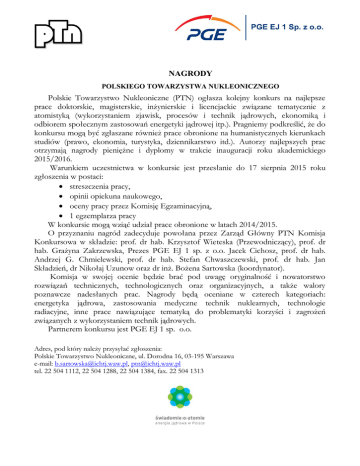 NAGRODY POLSKIEGO TOWARZYSTWA NUKLEONICZNEGO Polskie Towarzystwo Nukleoniczne (PTN) ogłasza kolejny konkurs na najlepsze prace doktorskie, magisterskie, inżynierskie i licencjackie związane tematycznie z atomistyką (wykorzystaniem zjawisk, procesów i technik jądrowych, ekonomiką i odbiorem społecznym zastosowań energetyki jądrowej itp.). Pragniemy podkreślić, że do konkursu mogą być zgłaszane również prace obronione na humanistycznych kierunkach studiów (prawo, ekonomia, turystyka, dziennikarstwo itd.). Autorzy najlepszych prac otrzymają nagrody pieniężne i dyplomy w trakcie inauguracji roku akademickiego 2015/2016. Warunkiem uczestnictwa w konkursie jest przesłanie do 17 sierpnia 2015 roku zgłoszenia w postaci: streszczenia pracy, opinii opiekuna naukowego, oceny pracy przez Komisję Egzaminacyjną, 1 egzemplarza pracy W konkursie mogą wziąć udział prace obronione w latach 2014/2015. O przyznaniu nagród zadecyduje powołana przez Zarząd Główny PTN Komisja Konkursowa w składzie: prof. dr hab. Krzysztof Wieteska (Przewodniczący), prof. dr hab. Grażyna Zakrzewska, Prezes PGE EJ 1 sp. z o.o. Jacek Cichosz, prof. dr hab. Andrzej G. Chmielewski, prof. dr hab. Stefan Chwaszczewski, prof. dr hab. Jan Składzień, dr Nikołaj Uzunow oraz dr inż. Bożena Sartowska (koordynator). Komisja w swojej ocenie będzie brać pod uwagę oryginalność i nowatorstwo rozwiązań technicznych, technologicznych oraz organizacyjnych, a także walory poznawcze nadesłanych prac. Nagrody będą oceniane w czterech kategoriach: energetyka jądrowa, zastosowania medyczne technik nuklearnych, technologie radiacyjne, inne prace nawiązujące tematyką do problematyki korzyści i zagrożeń związanych z wykorzystaniem technik jądrowych. Partnerem konkursu jest PGE EJ 1 sp. o.o. Adres, pod który należy przysyłać zgłoszenia: Polskie Towarzystwo Nukleoniczne, ul. Dorodna 16, 03-195 Warszawa e-mail: [email protected], [email protected] tel. 22 504 1112, 22 504 1288, 22 504 1384, fax. 22 504 1313
