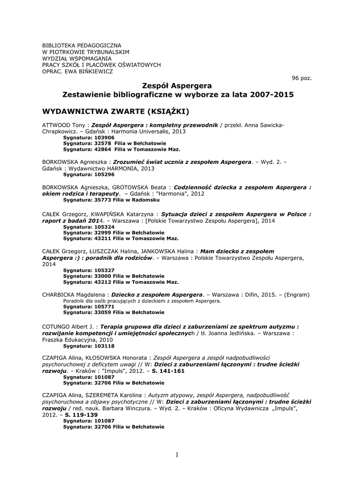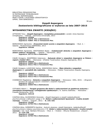 BIBLIOTEKA PEDAGOGICZNA W PIOTRKOWIE TRYBUNALSKIM WYDZIAŁ WSPOMAGANIA PRACY SZKÓŁ I PLACÓWEK OŚWIATOWYCH OPRAC. EWA BIŃKIEWICZ 96 poz. Zespół Aspergera Zestawienie bibliograficzne w wyborze za lata 2007-2015 WYDAWNICTWA ZWARTE (KSIĄŻKI) ATTWOOD Tony : Zespół Aspergera : kompletny przewodnik / przekł. Anna SawickaChrapkowicz. – Gdańsk : Harmonia Universalis, 2013 Sygnatura: 103906 Sygnatura: 32578 Filia w Bełchatowie Sygnatura: 42864 Filia w Tomaszowie Maz. BORKOWSKA Agnieszka : Zrozumieć świat ucznia z zespołem Aspergera. – Wyd. 2. – Gdańsk : Wydawnictwo HARMONIA, 2013 Sygnatura: 105296 BORKOWSKA Agnieszka, GROTOWSKA Beata : Codzienność dziecka z zespołem Aspergera : okiem rodzica i terapeuty. – Gdańsk : "Harmonia", 2012 Sygnatura: 35773 Filia w Radomsku CAŁEK Grzegorz, KWAPIŃSKA Katarzyna : Sytuacja dzieci z zespołem Aspergera w Polsce : raport z badań 2014. – Warszawa : [Polskie Towarzystwo Zespołu Aspergera], 2014 Sygnatura: 105324 Sygnatura: 32999 Filia w Bełchatowie Sygnatura: 43211 Filia w Tomaszowie Maz. CAŁEK Grzegorz, ŁUSZCZAK Halina, JANKOWSKA Halina : Mam dziecko z zespołem Aspergera :) : poradnik dla rodziców. – Warszawa : Polskie Towarzystwo Zespołu Aspergera, 2014 Sygnatura: 105327 Sygnatura: 33000 Filia w Bełchatowie Sygnatura: 43212 Filia w Tomaszowie Maz. CHARBICKA Magdalena : Dziecko z zespołem Aspergera. – Warszawa : Difin, 2015. – (Engram) Poradnik dla osób pracujących z dzieckiem z zespołem Aspergera. Sygnatura: 105771 Sygnatura: 33059 Filia w Bełchatowie COTUNGO Albert J. : Terapia grupowa dla dzieci z zaburzeniami ze spektrum autyzmu : rozwijanie kompetencji i umiejętności społecznych / tł. Joanna Jedlińska. – Warszawa : Fraszka Edukacyjna, 2010 Sygnatura: 103118 CZAPIGA Alina, KŁOSOWSKA Honorata : Zespół Aspergera a zespół nadpobudliwości psychoruchowej z deficytem uwagi // W: Dzieci z zaburzeniami łączonymi : trudne ścieżki rozwoju. – Kraków : "Impuls", 2012. – S. 141-161 Sygnatura: 101087 Sygnatura: 32706 Filia w Bełchatowie CZAPIGA Alina, SZEREMETA Karolina : Autyzm atypowy, zespół Aspergera, nadpobudliwość psychoruchowa a objawy psychotyczne // W: Dzieci z zaburzeniami łączonymi : trudne ścieżki rozwoju / red. nauk. Barbara Winczura. – Wyd. 2. – Kraków : Oficyna Wydawnicza „Impuls”, 2012. – S. 119-139 Sygnatura: 101087 Sygnatura: 32706 Filia w Bełchatowie 1 DUMARA Małgorzata : Tajemnica dziecka z zespołem Aspergera // W: Współczesne problemy pedagogiki specjalnej / pod red. Urszuli Bartnikowskiej, Czesława Kosakowskiego, Amadeusza Krause. – Olsztyn : Wydawnictwo Uniwersytetu Warmińsko-Mazurskiego, cop. 2008. – S. 336-340 Sygnatura: 97690 EMMONS Polly Godwin, McKendry Anderson Liz : Dzieci z zaburzeniami integracji sensorycznej : zaburzenia rozwojowo-sensoryczne oraz edukacyjne występujące w ramach autyzmu, ADHD, trudności szkolnych oraz zaburzeń dwubiegunowych / [tł. [z ang.] Robert Waliś. – Warszawa : "K. E. Liber", 2007. – (Biblioteka Rodzica i Pedagoga). – S. 153176 : Więcej o zespole Aspegera Diagnozowanie zespołu Aspergera. Problemy dotyczące życia społecznego i komunikacji – pragmatyka. Opis przykładowego dnia z życia jedenastoletrniego chłopca z zespołem Aspergera (z zaznaczeniem elementów pragmatyki). Sygnatura: 103214 Sygnatura: 31161 Filia w Bełchatowie Sygnatura: 40310 Filia w Tomaszowie Maz. FAST Yvona : Zespół Aspergera i NLD : problematyka dotycząca zatrudnienia – relacje i strategie / tł. Marzenna Rączkowska. – Warszawa : "Fraszka Edukacyjna" : "Synapsis", 2008. – (Seria z Parasolem) Sygnatura: 96822 Sygnatura: 30613 Filia w Opocznie GRAND Claire : Autyzm i zespół Aspergera / [przekł. Andrzej Bilik]. – Warszawa : Wydawnictwo Studio EMKA, cop. 2012 Sygnatura : 103167 GRAY Carol : Nowe historyjki społeczne / przekł. Juliusz Okuniewski. – Gdańsk : Harmonia Universalis, 2014 Ponad 150 historyjek, które uczą umiejętności społecznych dzieci z autyzmem, zespołem Aspergera i ich rówieśników. Sygnatura: 105306+CD Sygnatura 32694+CD Filia w Bełchatowie JAGIELSKA Gabriela : Dziecko z autyzmem i zespołem Aspergera w szkole i przedszkolu : informacje dla pedagogów i opiekunów. – Warszawa : Ośrodek Rozwoju Edukacji, 2010. – (One Są Wśród Nas. Seria 2) Sygnatura; Sygnatura; Sygnatura: Sygnatura: 100045, 100052 31097, 31104 Filia w Bełchatowie 30110, 30111 Filia w Opocznie 41784, 41791, 42126, 42133, 42140 Filia w Tomaszowie Maz. JAKLEWICZ Hanna : Całościowe zaburzenia rozwojowe // W: Psychiatria dzieci i młodzieży / red Irena Namysłowska ; [autorzy Wanda Badura-Madej i in.]. – Wyd. 1 (dodruk). – Warszawa : Wydawnictwo Lekarskie PZWL, cop. 2011. – S. 110-128 Zespół Aspergera (s. 126-127) – definicja, epidemiologia, obraz kliniczny, rokowanie . Sygnatura: 104659 KANTOR Halina : Dziecko z ADHD i zespołem Aspergera w szkole : co pomaga we wspieraniu dziecka, a co stanowi przeszkodę (na podstawie doświadczeń własnych oraz rodziców uczestniczących w www.forum.adhd.org.pl) // W: Szkoła na miarę możliwości dziecka / red. Danuta Krzywoń, Beata Matusek. – Sosnowiec : Oficyna Wydawnicza Humanitas. Wyższa Szkoła Humanitas, 2009. – S. 154-159 Sygnatura: 103261 KLONOWSKA-SENDERSKA Iwona, SZAFRAŃSKA Karina : Psychologiczne, pedagogiczne i logopedyczne wspomaganie rozwoju wysokofunkcjonujących dzieci ze spektrum autyzmu (ASD). Cz. 2 // W: Medycyna w logopedii : terapia, wspomaganie, wsparcie : trzy drogi – jeden cel. / red. nauk. Jacek Jarosław Błeszyński. – Gdańsk : Harmonia Universalis, 2013. – S. 97-111 Sygnatura: 103114, 106885 2 KOMENDER Jadwiga, JAGIELSKA Gabriela, BRYŃSKA Anita : Autyzm i zespół Aspergera. – Wyd. 1 dodr. – Warszawa : Wydawnictwo Lekarskie PZWL, cop. 2012. – (Centrum Zdrowia Dziecka Poleca / red. nauk. serii Sergiusz Jóźwiak) Sygnatura: 98059 KORENDO Marta : Rozwój języka dzieci z zespołem Aspergera – konsekwencje diagn