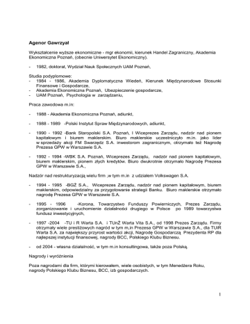 Agenor Gawrzyał Wykształcenie wyŜsze ekonomiczne - mgr ekonomii, kierunek Handel Zagraniczny, Akademia Ekonomiczna Poznań, (obecnie Uniwersytet Ekonomiczny). - 1982, doktorat, Wydział Nauk Społecznych UAM Poznań, Studia podyplomowe: - 1984 - 1986, Akademia Dyplomatyczna Wiedeń, Kierunek Międzynarodowe Stosunki Finansowe i Gospodarcze, - Akademia Ekonomiczna Poznań, Ubezpieczenie gospodarcze, - UAM Poznań, Psychologia w zarządzaniu, Praca zawodowa m.in: - 1988 - Akademia Ekonomiczna Poznań, adiunkt, - 1988 - 1989 -Polski Instytut Spraw Międzynarodowych, adiunkt, - 1990 - 1992 -Bank Staropolski S.A. Poznań, I Wiceprezes Zarządu, nadzór nad pionem kapitałowym i biurem maklerskim. Biuro maklerskie uczestniczyło m.in. jako lider w sprzedaŜy akcji FM Swarzędz S.A. inwestorom zagranicznym, otrzymało teŜ Nagrodę Prezesa GPW w Warszawie S.A. - 1992 - 1994 -WBK S.A. Poznań, Wiceprezes Zarządu, nadzór nad pionem kapitałowym, biurem maklerskim, pionem złych kredytów. Biuro dwukrotnie otrzymało Nagrodę Prezesa GPW w Warszawie S.A., Nadzór nad restrukturyzacją wielu firm ,w tym m.in z udziałem Volkswagen S.A. - 1994 - 1995 -BGś S.A., Wiceprezes Zarządu, nadzór nad pionem kapitałowym, biurem maklerskim, odpowiedzialny za przygotowanie strategii Banku. Biuro maklerskie otrzymało nagrodę Prezesa GPW w Warszawie S.A. - 1995 - 1996 -Korona, Towarzystwo Funduszy Powierniczych, Prezes Zarządu, zorganizowanie i uruchomienie działalności drugiego w Polsce po 1989 towarzystwa fundusz inwestycyjnych, - 1997 -2004 -TU i R Warta S.A. i TUnś Warta Vita S.A., od 1998 Prezes Zarządu. Firmy otrzymały wiele prestiŜowych nagród w tym m,in Prezesa GPW w Warszawie S.A., dla TUiR Warta S.A. za największy przyrost wartości akcji, Nagrodę Gospodarczą Prezydenta RP dla najlepszej instytucji finansowej, nagrody BCC, Polskiego Klubu Biznesu. - od 2004 - własna działalność, w tym m.in konsultingowa, takŜe poza Polską. Nagrody i wyróŜnienia Poza nagrodami dla firm, którymi kierowałem, wiele osobistych, w tym MenedŜera Roku, nagrody Polskiego Klubu Biznesu, BCC, izb gospodarczych. 1 Pan Agenor Gawrzyał nie prowadzi działalności konkurencyjnej w stosunku do działalności RAFAKO S.A. Nie uczestniczy w spółce konkurencyjnej jako wspólnik spółki cywilnej, spółki osobowej lub jako członek organu spółki kapitałowej bądź w innej konkurencyjnej osobie prawnej jako członek organu. Nie figuruje w Rejestrze DłuŜników Niewypłacalnych, prowadzonym na podstawie ustawy o KRS. 2