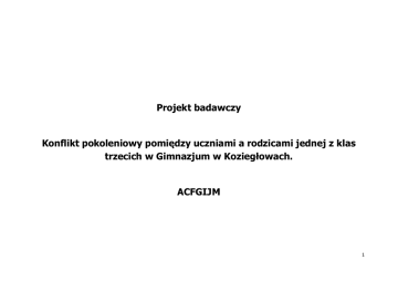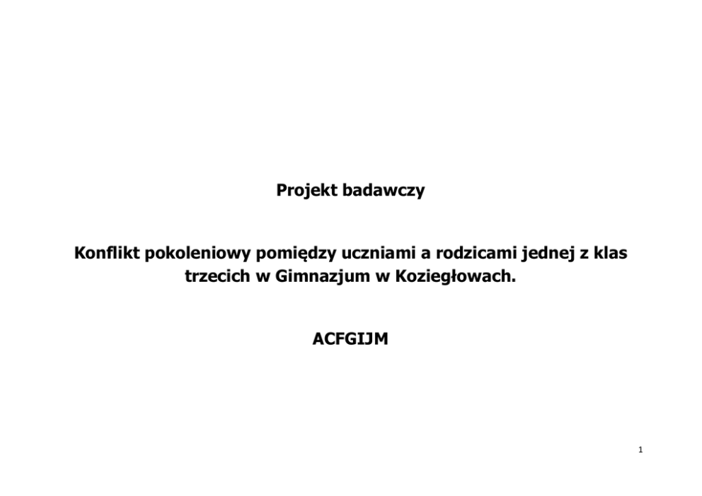 Projekt badawczy Konflikt pokoleniowy pomiędzy uczniami a rodzicami jednej z klas trzecich w Gimnazjum w Koziegłowach. ACFGIJM 1 Spis treści: 1. Wstęp. 2. Pytania badawcze. 3. Grupa badawcza. 3.1. Dobór przedstawicieli grupy badawczej. 4. Przedmiot badania. 5. Plan pracy. 6. Zebrane informacje, analiza oraz wnioski. 6.1. Natalia. 6.1.1. Pamiętnik Natalii. 6.1.2. Pamiętnik rodziców Natalii. 6.1.3. Analiza relacji Natalii z rodzicami. 6.1.4. Wnioski. 6.2. Anna. 6.2.1. Pamiętnik Anny. 6.2.2. Pamiętnik matki Anny. 6.2.3. Analiza relacji Anny z matką. 6.2.4. Wnioski. 6.3. Szymon. 6.3.1. Pamiętnik Szymona. 6.3.2. Pamiętnik rodziców Szymona. 6.3.3. Analiza relacji Szymona z rodzicami. 6.3.4. Wnioski. 7. Odpowiedzi na pytania badawcze. 8. Podsumowanie. 2 1. Wstęp. Konflikt pokoleniowy istnieje od zarania dziejów. Przejawia się on różnicy w poglądach, postrzeganiu otaczającej rzeczywistości, ubiorze, zainteresowaniach, a wreszcie życiowych priorytetach. Znalezienie wspólnej płaszczyzny porozumienia jest wyzwaniem dla młodych i starych pokoleń, mającym zapobiec ustaniu więzi międzyludzkich. Ich brak pociąga za sobą ogromne konsekwencje w życiu młodego człowieka, który może czuć się osamotniony, wykluczony i zagubiony w teraźniejszości. W efekcie nastolatek buntuje się, co przejawia w różnych postaciach. Powyższe zainspirowało mnie do przeanalizowania tematu mojego projektu badawczego. Będę się starał znaleźć odpowiedź na pytania badawcze postawione w punkcie 2 projektu, aby uzyskać „złoty środek” na poprawę wzajemnych relacji młodzieży z rodzicami. Nawiązując do teorii amerykańskiego psychologa Abrahama Masłowa dotyczącej potrzeb człowieka1, każde dziecko oprócz potrzeb fizjologicznych, ma potrzeby bezpieczeństwa, przynależności i szacunku, które zapewniają mu rodzice. Mając je zaspokojone, młody człowiek może swobodnie dążyć do samorealizacji. Tym samym rola rodzica we wprowadzaniu dziecka w dorosły świat jest niezmiernie ważna. 1 Zapała Katarzyna, „Wiedza o społeczeństwie. Vademecum. Egzamin gimnazjalny 2013”, Gdynia 2011, str. 7 3 2. Pytania badawcze. a. W jaki sposób objawia się konflikt pokoleniowy pomiędzy uczniami Gimnazjum w Koziegłowach a ich rodzicami? b. Co wpływa na występowanie konfliktu pokoleniowego pomiędzy uczniami Gimnazjum w Koziegłowach a ich rodzicami? c. Jak można poprawić relacje między uczniami a ich rodzicami, aby uniknąć eskalacji konfliktu? Poniżej zamieszczam wyjaśnienie znaczenia poszczególnych pojęć: Konflikt (z łaciny conflictus – zderzenie) - niezgodność, sprzeczność interesów, poglądów, spór, zatarg.2 Pokolenie -grupa osób, która zwłaszcza ze względu na podobny wiek, doświadczyła jakiegoś szczególnego wydarzenia lub wydarzeń.3 Eskalacja – natężanie, zwiększanie, stopniowanie czegoś.4 2 Portal Wiedzy w Onet.pl, http://portalwiedzy.onet.pl/72323,,,,konflikt,haslo.html, 22.12.2012 r. Wikipedia, http://pl.wikipedia.org/wiki/Pokolenie, 22.12.2012 r. 4 Markowski Andrzej, Pawelec Radosław, „Nowy słownik wyrazów obcych i trudnych”, Warszawa 2005, str.234 3 4 3. Grupa badawcza. Grupą badawczą w moim projekcie są wybrani losowo uczniowie jednej z klas trzecich w Gimnazjum w Koziegłowach Są to dwie dziewczyny i jeden chłopiec w wieku 15 lat (charakterystyka ww. osób zawarta została w tabeli nr 1). Osoby te zostały wybrane do grupy badawczej w drodze przypadkowego losowania, gdyż właśnie dzięki temu mogłem w późniejszej analizie uzyskać: - przekrój w zakresie odmiennych cech charakterów, - różnorodność zachowań w różnych sytuacjach, - różnorodność relacji na linii dorastające dziecko-rodzic. Młodzież poddaną badaniu łączy fakt uczęszczania do klasy o profilu matematycznym oraz fakt zamieszkania w tej samej miejscowości. Tabela nr 1 Charakterystyka losowo wybranych uczestników grupy badawczej(młodzież)5 5 Imię ucznia Wiek Zainteresowania Sposób na wolny czas Rodzeństwo tak/nie Natalia 15 lat rysunek siatkówka, pływanie tak (młodsza siostra) Anna 15 lat książka jazda na rowerze, jazda na łyżwach tak (starszy, dorosły brat) Szymon 15 lat gry komputerowe, czatowanie w sieci facebook tak (młodsza siostra i młodszy brat) Źródło: Pamiętniki uczniów gimnazjum wybranych losowo do grupy badawczej. 5 Do grupy badawczej w moim projekcie należą również rodzice wybranych losowo uczniów, których charakteryzuje: -różnica w wykształceniu, -różnica w statusie społecznym i co się z tym wiąże różne możliwości stworzenia zaplecza materialnego dla swoich dzieci, -różnica w podejściu do wychowania dziecka . Charakterystyka rodziców zawarta została w tabeli nr 2. Rodziców uczestniczących w projekcie badawczym łączy fakt posiadania dzieci w wieku lat 15 oraz fakt zamieszkania w tej samej miejscowości. Tabela nr 2 Charakterystyka rodziców losowo wybranych uczestników grupy badawczej (młodzieży)6 Rodzice Wykształcenie Zawód Zainteresowania kogo? Matka(M) Matka(M) Matka(M) Natalii Anny Szymona 6 Sposób spędzania wolnego czasu z dziećmi Ojciec (O) Ojciec (O) Ojciec (O) Matka (M); Ojciec (O) M – wyższe M - matematyk M - kino M - film O - wyższe O - informatyk O - książka O - siatkówka M – wyższe M - księgowa M- film M - seriale O - średnie O - nie żyje M – średnie M – własna działalność (sklep odzieżowy) M - pływanie M - film O - wyższe O - lekarz O - książka O - jazda na rowerze Źródło: Pamiętniki rodziców uczniów gimnazjum wybranych losowo do grupy badawczej. 6 3.1. Dobór przedstawicieli grupy badawczej. Losowy dobór przedstawicieli młodzieży różnej płci oraz ich rodziców jest zasadny i pozwoli w sposób miarodajny odpowiedzieć na postawione pytania badawcze, gdyż młodzi reprezentują sposób zachowania właściwy dla nastolatków w wieku lat 15, a ich rodzice - sposób reagowania właściwy dla przedstawicieli grupy dorosł