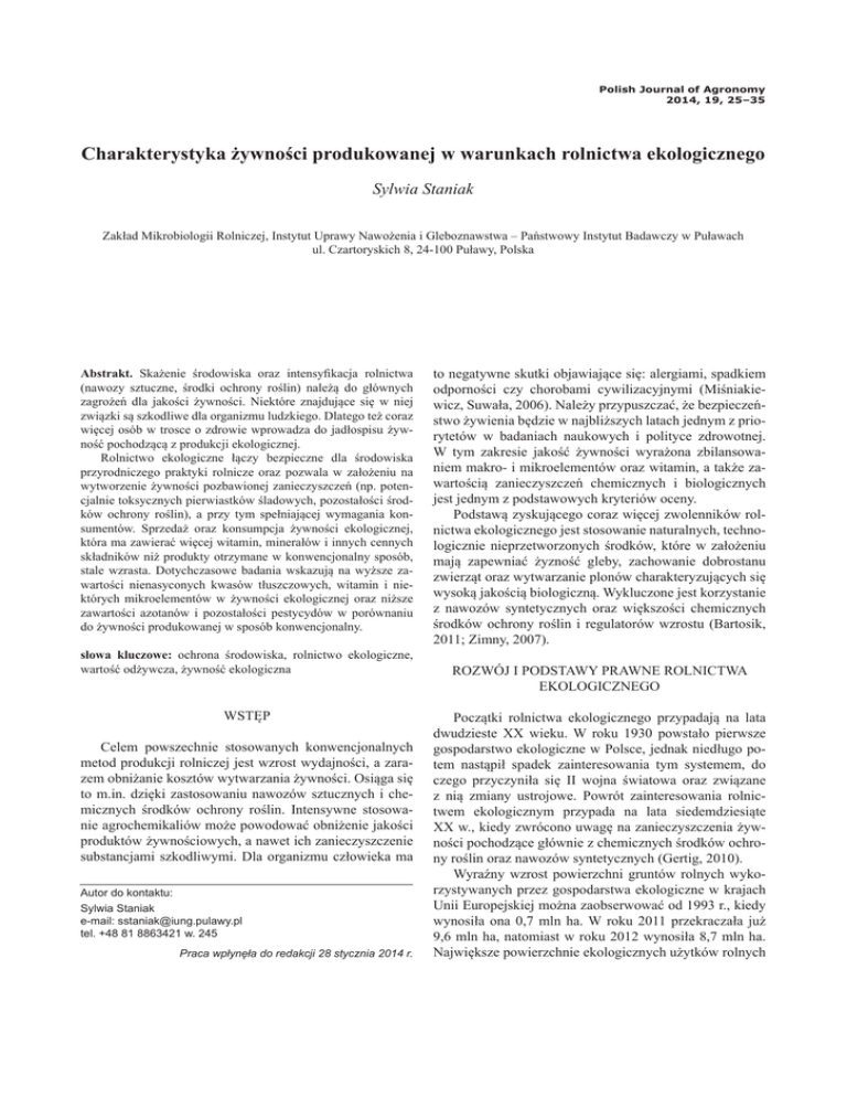 25 Polish Journal of Agronomy 2014, 19, 25–35 Charakterystyka żywności produkowanej w warunkach rolnictwa ekologicznego Sylwia Staniak Zakład Mikrobiologii Rolniczej, Instytut Uprawy Nawożenia i Gleboznawstwa – Państwowy Instytut Badawczy w Puławach ul. Czartoryskich 8, 24-100 Puławy, Polska Abstrakt. Skażenie środowiska oraz intensyfikacja rolnictwa (nawozy sztuczne, środki ochrony roślin) należą do głównych zagrożeń dla jakości żywności. Niektóre znajdujące się w niej związki są szkodliwe dla organizmu ludzkiego. Dlatego też coraz więcej osób w trosce o zdrowie wprowadza do jadłospisu żywność pochodzącą z produkcji ekologicznej. Rolnictwo ekologiczne łączy bezpieczne dla środowiska przyrodniczego praktyki rolnicze oraz pozwala w założeniu na wytworzenie żywności pozbawionej zanieczyszczeń (np. potencjalnie toksycznych pierwiastków śladowych, pozostałości środków ochrony roślin), a przy tym spełniającej wymagania konsumentów. Sprzedaż oraz konsumpcja żywności ekologicznej, która ma zawierać więcej witamin, minerałów i innych cennych składników niż produkty otrzymane w konwencjonalny sposób, stale wzrasta. Dotychczasowe badania wskazują na wyższe zawartości nienasyconych kwasów tłuszczowych, witamin i niektórych mikroelementów w żywności ekologicznej oraz niższe zawartości azotanów i pozostałości pestycydów w porównaniu do żywności produkowanej w sposób konwencjonalny. słowa kluczowe: ochrona środowiska, rolnictwo ekologiczne, wartość odżywcza, żywność ekologiczna WSTĘP Celem powszechnie stosowanych konwencjonalnych metod produkcji rolniczej jest wzrost wydajności, a zarazem obniżanie kosztów wytwarzania żywności. Osiąga się to m.in. dzięki zastosowaniu nawozów sztucznych i chemicznych środków ochrony roślin. Intensywne stosowanie agrochemikaliów może powodować obniżenie jakości produktów żywnościowych, a nawet ich zanieczyszczenie substancjami szkodliwymi. Dla organizmu człowieka ma Autor do kontaktu: Sylwia Staniak e-mail: [email protected] tel. +48 81 8863421 w. 245 Praca wpłynęła do redakcji 28 stycznia 2014 r. to negatywne skutki objawiające się: alergiami, spadkiem odporności czy chorobami cywilizacyjnymi (Miśniakiewicz, Suwała, 2006). Należy przypuszczać, że bezpieczeństwo żywienia będzie w najbliższych latach jednym z priorytetów w badaniach naukowych i polityce zdrowotnej. W tym zakresie jakość żywności wyrażona zbilansowaniem makro- i mikroelementów oraz witamin, a także zawartością zanieczyszczeń chemicznych i biologicznych jest jednym z podstawowych kryteriów oceny. Podstawą zyskującego coraz więcej zwolenników rolnictwa ekologicznego jest stosowanie naturalnych, technologicznie nieprzetworzonych środków, które w założeniu mają zapewniać żyzność gleby, zachowanie dobrostanu zwierząt oraz wytwarzanie plonów charakteryzujących się wysoką jakością biologiczną. Wykluczone jest korzystanie z nawozów syntetycznych oraz większości chemicznych środków ochrony roślin i regulatorów wzrostu (Bartosik, 2011; Zimny, 2007). ROZWÓJ I PODSTAWY PRAWNE ROLNICTWA EKOLOGICZNEGO Początki rolnictwa ekologicznego przypadają na lata dwudzieste XX wieku. W roku 1930 powstało pierwsze gospodarstwo ekologiczne w Polsce, jednak niedługo potem nastąpił spadek zainteresowania tym systemem, do czego przyczyniła się II wojna światowa oraz związane z nią zmiany ustrojowe. Powrót zainteresowania rolnictwem ekologicznym przypada na lata siedemdziesiąte XX w., kiedy zwrócono uwagę na zanieczyszczenia żywności pochodzące głównie z chemicznych środków ochrony roślin oraz nawozów syntetycznych (Gertig, 2010). Wyraźny wzrost powierzchni gruntów rolnych wykorzystywanych przez gospodarstwa ekologiczne w krajach Unii Europejskiej można zaobserwować od 1993 r., kiedy wynosiła ona 0,7 mln ha. W roku 2011 przekraczała już 9,6 mln ha, natomiast w roku 2012 wynosiła 8,7 mln ha. Największe powierzchnie ekologicznych użytków rolnych 26 Polish Journal of Agronomy, No. 19, 2014 w roku 2012 znajdowały się w Hiszpanii (1 593 197 ha), Włoszech (1 167 362 ha) oraz Francji (1 032 939 ha). Według statystyk w roku 2012 w krajach Unii Europejskiej było ponad 239 tys. gospodarstw ekologicznych i ponad 36 tys. przetwórni ekologicznych. Największą liczbą gospodarstw ekologicznych w roku 2012 wyróżniały się Włochy (43 852), Hiszpania (30 462) oraz Polska (25 944). Największą liczbą przetwórni w roku 2012 charakteryzowały się Niemcy (9183), Francja (8957) oraz Włochy (5873) (IJHARS, 2013). W Polsce wzrost liczby gospodarstw ekologicznych obserwuje się się po integracji z Unią Europejską – z 3760 kontrolowanych gospodarstw w roku 2004 do 9194 w 2006 r., 20956 w 2010 oraz 23449 w 2012 r. (Stalenga, Kuś, 2007; Kuś, 2010; IJHARS, 2013). Przytoczone dane wskazują, że system ekologiczny jest jednym z najszybciej rozwijających się zarówno w kraju, jak i w Europie. Jednakże należy jednocześnie podkreślić, że udział produkcji ekologicznej w ogólnej powierzchni gruntów rolnych w skali światowej jest wciąż niewielki w porównaniu do rolnictwa konwencjonalnego (Kuś, 2010). W Afryce i Azji odsetek powierzchni zajmowanych przez ekorolnictwo jest znacznie mniejszy niż w Europie. W przypadku Ameryki Południowej czy Australii i Oceanii jego udział jest relatywnie duży w stosunku do innych kontynentów, lecz dotyczy to przede wszystkim pastwisk użytkowanych w sposób ekstensywny (Runowski, 2009). Ponadto występowanie różnych upraw ekologicznych na poszczególnych kontynentach jest dość zróżnicowane. W Azji przeważają zboża oraz rośliny oleiste, w Europie głównie zboża i rośliny pastewne polowe, w Afryce to głównie tytoń i zioła, w Ameryce Południowej zboża i warzywa, natomiast w Ameryce Północnej zboża, rośliny pastewne oraz oleiste (Golinowska i in., 2013). Istnieje wiele czy