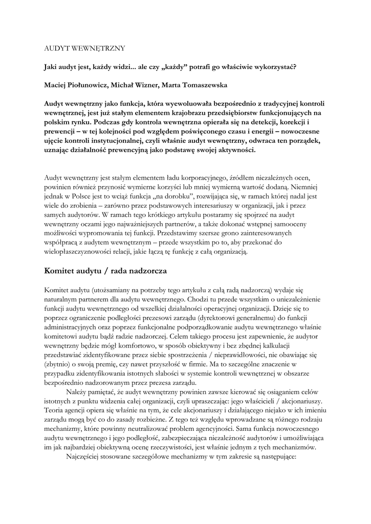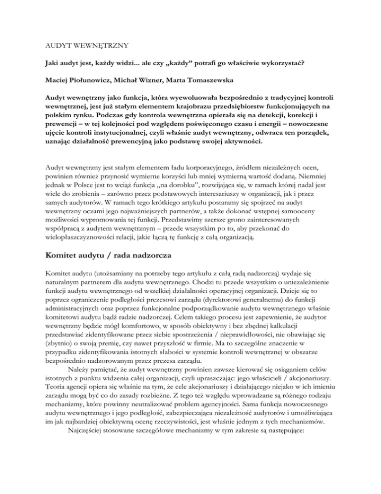 AUDYT WEWNĘTRZNY Jaki audyt jest, każdy widzi... ale czy „każdy” potrafi go właściwie wykorzystać? Maciej Piołunowicz, Michał Wizner, Marta Tomaszewska Audyt wewnętrzny jako funkcja, która wyewoluowała bezpośrednio z tradycyjnej kontroli wewnętrznej, jest już stałym elementem krajobrazu przedsiębiorstw funkcjonujących na polskim rynku. Podczas gdy kontrola wewnętrzna opierała się na detekcji, korekcji i prewencji – w tej kolejności pod względem poświęconego czasu i energii – nowoczesne ujęcie kontroli instytucjonalnej, czyli właśnie audyt wewnętrzny, odwraca ten porządek, uznając działalność prewencyjną jako podstawę swojej aktywności. Audyt wewnętrzny jest stałym elementem ładu korporacyjnego, źródłem niezależnych ocen, powinien również przynosić wymierne korzyści lub mniej wymierną wartość dodaną. Niemniej jednak w Polsce jest to wciąż funkcja „na dorobku”, rozwijająca się, w ramach której nadal jest wiele do zrobienia – zarówno przez podstawowych interesariuszy w organizacji, jak i przez samych audytorów. W ramach tego krótkiego artykułu postaramy się spojrzeć na audyt wewnętrzny oczami jego najważniejszych partnerów, a także dokonać wstępnej samooceny możliwości wypromowania tej funkcji. Przedstawimy szersze grono zainteresowanych współpracą z audytem wewnętrznym – przede wszystkim po to, aby przekonać do wielopłaszczyznowości relacji, jakie łączą tę funkcję z całą organizacją. Komitet audytu / rada nadzorcza Komitet audytu (utożsamiany na potrzeby tego artykułu z całą radą nadzorczą) wydaje się naturalnym partnerem dla audytu wewnętrznego. Chodzi tu przede wszystkim o uniezależnienie funkcji audytu wewnętrznego od wszelkiej działalności operacyjnej organizacji. Dzieje się to poprzez ograniczenie podległości prezesowi zarządu (dyrektorowi generalnemu) do funkcji administracyjnych oraz poprzez funkcjonalne podporządkowanie audytu wewnętrznego właśnie komitetowi audytu bądź radzie nadzorczej. Celem takiego procesu jest zapewnienie, że audytor wewnętrzny będzie mógł komfortowo, w sposób obiektywny i bez zbędnej kalkulacji przedstawiać zidentyfikowane przez siebie spostrzeżenia / nieprawidłowości, nie obawiając się (zbytnio) o swoją premię, czy nawet przyszłość w firmie. Ma to szczególne znaczenie w przypadku zidentyfikowania istotnych słabości w systemie kontroli wewnętrznej w obszarze bezpośrednio nadzorowanym przez prezesa zarządu. Należy pamiętać, że audyt wewnętrzny powinien zawsze kierować się osiąganiem celów istotnych z punktu widzenia całej organizacji, czyli upraszczając: jego właścicieli / akcjonariuszy. Teoria agencji opiera się właśnie na tym, że cele akcjonariuszy i działającego niejako w ich imieniu zarządu mogą być co do zasady rozbieżne. Z tego też względu wprowadzane są różnego rodzaju mechanizmy, które powinny neutralizować problem agencyjności. Sama funkcja nowoczesnego audytu wewnętrznego i jego podległość, zabezpieczająca niezależność audytorów i umożliwiająca im jak najbardziej obiektywną ocenę rzeczywistości, jest właśnie jednym z tych mechanizmów. Najczęściej stosowane szczegółowe mechanizmy w tym zakresie są następujące: uzależnienie zmiany na stanowisku kierującego komórką audytu od zgody komitetu audytu; akceptacja budżetu komórki audytu i wynagrodzenia kierującego komórką audytu przez komitet audytu; bezpośrednie raportowanie kierującego komórką audytu do komitetu audytu; akceptacja przez komitet audytu planów audytu; otrzymywanie przez komitet audytu okresowych sprawozdań audytu wewnętrznego; możliwość bezpośredniego zlecenia audytowi wykonania audytu w obszarze wskazanym przez przewodniczącego komitetu audytu, bez pośrednictwa zarządu organizacji; bieżący kontakt kierującego komórką audytu z przewodniczącym komitetu audytu. Powyższe zasady, i szereg innych, zostały na stałe wpisane do ścisłego kanonu dobrych praktyk reprezentowanych przede wszystkim przez Międzynarodowe Standardy Praktyki Zawodowej Audytu Wewnętrznego, przygotowane i wydane przez międzynarodowy Instytut Audytorów Wewnętrznych (IIA), mający swoje oddziały w ponad 100 krajach świata, w tym również w Polsce, w postaci Stowarzyszenia Audytorów Wewnętrznych (IIA Polska). W niektórych sektorach tego typu rozwiązania są wręcz wymagane regulacyjnie – tak jest np. w sektorze bankowym, gdzie Komisja Nadzoru Finansowego kładzie duży nacisk na niezależność, jakość pracy i właściwe kompetencje departamentów audytu wewnętrznego. W polskim sektorze bankowym funkcjonują instytucje, które zdecydowały się na to, aby departament audytu wewnętrznego został wręcz całkowicie podporządkowany komitetowi audytu, którego istnienie w bankach jest obowiązkowe. W przypadku sektora finansowego można więc mówić o największej dojrzałości w zakresie umocowania i wykorzystania audytu wewnętrznego przez organizację. Z jednej strony jest to spowodowane dostępem do najlepszych praktyk dzięki zagranicznym właścicielom tych instytucji, z drugiej zaś wymusza to sektorowy regulator. Warto zauważyć, że najlepsze praktyki przygotowywane przez Bazylejski Komitet Nadzoru Bankowego (w dokumencie Internal Audit Function in Banks, wydanym w czerwcu 2012 r.) idą jeszcze dalej. Komitet Bazylejski wielokrotnie podkreśla konieczność bezpośredniego nadzoru nad audytem wewnętrznym przez radę nadzorczą lub komitet audytu i zapewnienie jak największej niezależności audytu od zarządu banku. Jednocześnie jednak zakłada m.in. możliwość bezpośrednich spotkań i wymiany informacji pomiędzy audytem wewnętrznym w banku a nadzorcą finansowym, w tym również bez udziału kierownictwa banku. Regulacje Komitetu Bazylejskiego nie są obowiązującym prawem, ale często stają się podstawą do przygotowania dyrektyw unijnych, wiążących również