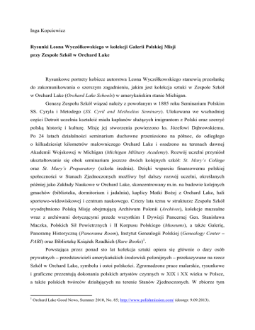 Inga Kopciewicz Rysunki Leona Wyczółkowskiego w kolekcji Galerii Polskiej Misji przy Zespole Szkół w Orchard Lake Rysunkowe portrety kobiece autorstwa Leona Wyczółkowskiego stanowią przesłankę do zakomunikowania o szerszym zagadnieniu, jakim jest kolekcja sztuki w Zespole Szkół w Orchard Lake (Orchard Lake Schools) w amerykańskim stanie Michigan. Genezę Zespołu Szkół wiązać należy z powołanym w 1885 roku Seminarium Polskim SS. Cyryla i Metodego (SS. Cyril and Methodius Seminary). Ulokowana we wschodniej części Detroit uczelnia kształcić miała kapłanów służących imigrantom z Polski oraz szerzyć polską historię i kulturę. Misję jej stworzenia powierzono ks. Józefowi Dąbrowskiemu. Po 24 latach działalności seminarium duchowne przeniesiono na północ, do odległego o kilkadziesiąt kilometrów malowniczego Orchard Lake i osadzono na terenach dawnej Akademii Wojskowej w Michigan (Michigan Military Academy). Rozwój uczelni przyniósł ukształtowanie się obok seminarium jeszcze dwóch kolejnych szkół: St. Mary’s College oraz St. Mary’s Preparatory (szkoła średnia). Dzięki wsparciu finansowemu polskiej społeczności w Stanach Zjednoczonych możliwy był dalszy rozwój uczelni, określanych później jako Zakłady Naukowe w Orchard Lake, skoncentrowany m.in. na budowie kolejnych gmachów (biblioteka, dormitorium i jadalnia), kaplicy Matki Bożej z Orchard Lake, hali sportowo-widowiskowej i centrum naukowego. Cztery lata temu w strukturze Zespołu Szkół wyodrębniono Polską Misję obejmującą Archiwum Polonii (Archives), kolekcje muzealne wraz z archiwami dotyczącymi przede wszystkim I Dywizji Pancernej Gen. Stanisława Maczka, Polskich Sił Powietrznych i II Korpusu Polskiego (Museums), a także Galerię, Panoramę Historyczną (Panorama Room), Instytut Genealogii Polskiej (Genealogy Center – PARI) oraz Bibliotekę Książek Rzadkich (Rare Books)1. Powstająca przez ponad sto lat kolekcja sztuki opiera się głównie o dary osób prywatnych – przedstawicieli amerykańskich środowisk polonijnych – przekazywane na rzecz Szkół w Orchard Lake, symbolu i ostoi polskości. Zgromadzone prace malarskie, rysunkowe i graficzne prezentują dokonania polskich artystów czynnych w XIX i XX wieku w Polsce, a także polskich twórców działających na terenie Stanów Zjednoczonych. W zbiorze tym 1 Orchard Lake Good News, Summer 2010, No. 85; http://www.polishmission.com/ (dostęp: 9.09.2013). wyróżniają się obrazy autorstwa Juliusza, Wojciecha i Jerzego Kossaków, Jana i Tadeusza Styków, Saturnina Świerzyńskiego, Stanisława Chlebowskiego, Antoniego Piotrowskiego, Jacka Malczewskiego, Wlastimila Hofmana, Kazimierza Sichulskiego, Juliana Fałata, Zofii Stryjeńskiej i Marcina Samlickiego, rysunki Jana Matejki, Leona Wyczółkowskiego i Józefa Pankiewicza oraz grafiki Daniela Chodowieckiego, Stefana Mrożewskiego, Jana Wałacha, Stanisława Raczyńskiego, Stanisława Rolicza, Kazimierza Szwainowskiego, Stefanii DretlerFlin i Krystyny Wróblewskiej, czy plakaty Stefan Norblina. Grupę dzieł artystów współczesnych reprezentują m.in. grafiki Czesława Podgórskiego, Barbary Rosiak, Jana Opalińskiego, Krzysztofa Wieczorka oraz rysunki Franciszka Starowieyskiego i Andrzeja Pityńskiego. fot. 1 Imponujący zbiór wymagał zaadaptowania na cele wystawiennicze wnętrza, które mogłoby zaspakajać potrzeby zarówno ekspozycyjne, jak i magazynowe. Historyzujące pomieszczenia obecnej Galerii pełniły niegdyś funkcję jadalni, a następnie kaplicy. Opiekę nad Galerią w latach 70. ubiegłego wieku przejął Marian Owczarski, artysta rzeźbiarzrezydent. Jej działalność skupiała się przede wszystkim na aktywności wystawienniczej oraz poszerzaniu kolekcji. Niestety, nigdy nie podjęto działań zmierzających do skatalogowania i naukowego opracowania zgromadzonych dzieł sztuki. Po śmierci opiekuna Galerii w 2010 roku dyrektor Polskiej Misji Marcin Chumięcki zwrócił się do Ministerstwa Kultury i Dziedzictwa Narodowego z prośbą o pomoc w przeprowadzeniu ewaluacji i inwentaryzacji zbiorów. Oddelegowana z Muzeum Okręgowego im. Leona Wyczółkowskiego w Bydgoszczy autorka niniejszego tekstu, podczas przeprowadzonych w latach 2010-2012 prac, zdokumentowała niemal 400 dzieł sztuki. Stworzona ewidencja zabytków służyć ma wzmocnieniu gwarancji trwałości kolekcji – pozwoli uniknąć zagrożenia jakim jest rozproszenie poprzez sprzedaż i wymianę poszczególnych dzieł sztuki. Przygotowany materiał jest obecnie sukcesywnie wprowadzany przez pracowników Polskiej Misji do bazy danych nowo zakupionego elektronicznego programu do ewidencjonowania zbiorów. Po całościowym opracowywaniu materiału, a także przeprowadzeniu kwerend i konsultacji w muzeach oraz bibliotekach, które pozwolą wyeliminować ewentualne braki oraz wątpliwości nasuwające się podczas dokumentacji zbioru, powstanie opublikowany drukiem ilustrowany Katalog Zbiorów Sztuki Polskiej Misji w Orchard Lake w polskiej i angielskiej wersji językowej. Materiał ten służyć będzie promocji kolekcji w środowiskach polonijnych na całym świecie; stanie się również interesującą bazą danych dla polskich placówek muzealnych i galerii. Zinwentaryzowanie kolekcji umożliwi też w przyszłości stworzenie nowoczesnej, zweryfikowanej merytorycznie, ekspozycji prac w Galerii Polskiej Misji. Stan zachowania dzieł sztuki jest ogólnie dobry, mimo że obiekty prezentowane są w sali ekspozycyjnej oraz przechowywane w pomieszczeniach magazynowych pozbawionych profesjonalnego wyposażenia i stabilnych warunków klimatycznych. Poszczególne obrazy i grafiki powinny zostać poddane zabiegom konserwatorskim o różnym stopniu zaawansowania. Utrzymanie dobrej kondycji zabytkom zagwarantuje modernizacja pomieszczenia ekspozycyjnego specjalistycznych urządzeń i magazynowego, stabilizujących uwzględniająca temperaturę i wilgotność wprowadzenie oraz montaż prof