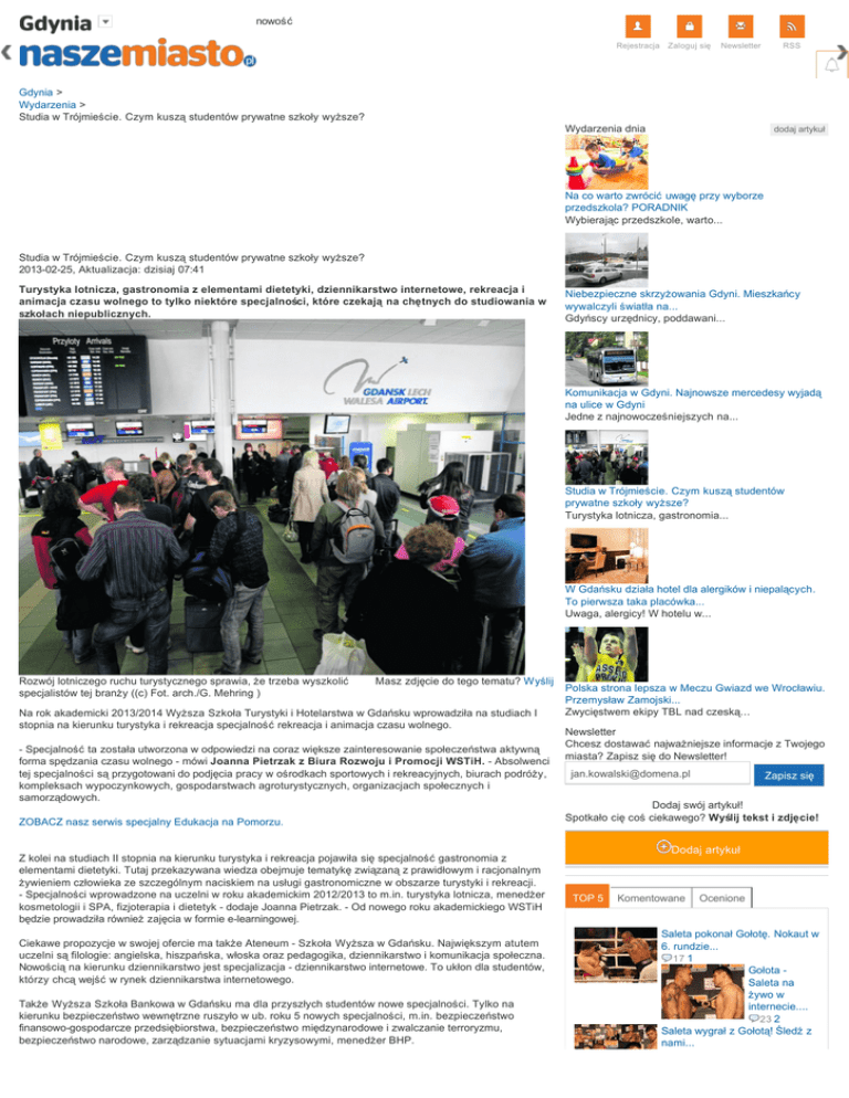 nowość Rejestracja Wydarzenia Rozrywka Katalog firm Ogłoszenia Sport Zaloguj się Dom Newsletter RSS Turystyka Gdynia > Wydarzenia > Studia w Trójmieście. Czym kuszą studentów prywatne szkoły wyższe? Wydarzenia dnia dodaj artykuł Na co warto zwrócić uwagę przy wyborze przedszkola? PORADNIK Wybierając przedszkole, warto... Studia w Trójmieście. Czym kuszą studentów prywatne szkoły wyższe? 2013-02-25, Aktualizacja: dzisiaj 07:41 Turystyka lotnicza, gastronomia z elementami dietetyki, dziennikarstwo internetowe, rekreacja i animacja czasu wolnego to tylko niektóre specjalności, które czekają na chętnych do studiowania w szkołach niepublicznych. Niebezpieczne skrzyżowania Gdyni. Mieszkańcy wywalczyli światła na... Gdyńscy urzędnicy, poddawani... Komunikacja w Gdyni. Najnowsze mercedesy wyjadą na ulice w Gdyni Jedne z najnowocześniejszych na... Studia w Trójmieście. Czym kuszą studentów prywatne szkoły wyższe? Turystyka lotnicza, gastronomia... W Gdańsku działa hotel dla alergików i niepalących. To pierwsza taka placówka... Uwaga, alergicy! W hotelu w... Rozwój lotniczego ruchu turystycznego sprawia, że trzeba wyszkolić specjalistów tej branży ((c) Fot. arch./G. Mehring ) Masz zdjęcie do tego tematu? Wyślij Na rok akademicki 2013/2014 Wyższa Szkoła Turystyki i Hotelarstwa w Gdańsku wprowadziła na studiach I stopnia na kierunku turystyka i rekreacja specjalność rekreacja i animacja czasu wolnego. - Specjalność ta została utworzona w odpowiedzi na coraz większe zainteresowanie społeczeństwa aktywną forma spędzania czasu wolnego - mówi Joanna Pietrzak z Biura Rozwoju i Promocji WSTiH. - Absolwenci tej specjalności są przygotowani do podjęcia pracy w ośrodkach sportowych i rekreacyjnych, biurach podróży, kompleksach wypoczynkowych, gospodarstwach agroturystycznych, organizacjach społecznych i samorządowych. ZOBACZ nasz serwis specjalny Edukacja na Pomorzu. Z kolei na studiach II stopnia na kierunku turystyka i rekreacja pojawiła się specjalność gastronomia z elementami dietetyki. Tutaj przekazywana wiedza obejmuje tematykę związaną z prawidłowym i racjonalnym żywieniem człowieka ze szczególnym naciskiem na usługi gastronomiczne w obszarze turystyki i rekreacji. - Specjalności wprowadzone na uczelni w roku akademickim 2012/2013 to m.in. turystyka lotnicza, menedżer kosmetologii i SPA, fizjoterapia i dietetyk - dodaje Joanna Pietrzak. - Od nowego roku akademickiego WSTiH będzie prowadziła również zajęcia w formie e-learningowej. Ciekawe propozycje w swojej ofercie ma także Ateneum - Szkoła Wyższa w Gdańsku. Największym atutem uczelni są filologie: angielska, hiszpańska, włoska oraz pedagogika, dziennikarstwo i komunikacja społeczna. Nowością na kierunku dziennikarstwo jest specjalizacja - dziennikarstwo internetowe. To ukłon dla studentów, którzy chcą wejść w rynek dziennikarstwa internetowego. Także Wyższa Szkoła Bankowa w Gdańsku ma dla przyszłych studentów nowe specjalności. Tylko na kierunku bezpieczeństwo wewnętrzne ruszyło w ub. roku 5 nowych specjalności, m.in. bezpieczeństwo finansowo-gospodarcze przedsiębiorstwa, bezpieczeństwo międzynarodowe i zwalczanie terroryzmu, bezpieczeństwo narodowe, zarządzanie sytuacjami kryzysowymi, menedżer BHP. Polska strona lepsza w Meczu Gwiazd we Wrocławiu. Przemysław Zamojski... Zwycięstwem ekipy TBL nad czeską... Newsletter Chcesz dostawać najważniejsze informacje z Twojego miasta? Zapisz się do Newsletter! [email protected] Zapisz się Dodaj swój artykuł! Spotkało cię coś ciekawego? Wyślij tekst i zdjęcie! Dodaj artykuł TOP 5 Komentowane Ocenione Saleta pokonał Gołotę. Nokaut w 6. rundzie... 17 1 Gołota Saleta na żywo w internecie.... 23 2 Saleta wygrał z Gołotą! Śledź z nami... 43 Menedżer sportu, medioznawca, animator kultury, organizator turystyki aktywnej - tak wyglądają sylwetki absolwentów kierunków wprowadzonych w Gdańskiej Wyższej Szkole Humanistycznej w roku akademickim 2012/2013. - Staramy się zapoznać z możliwościami regionu, wychodzić naprzeciw oczekiwaniom gmin i instytucji na Pomorzu, odpowiadając tym samym na ich zapotrzebowanie na konkretnych fachowców - mówi dr Waldemar Budziński, prorektor ds. studenckich GWSH. Zamów newsletter przekonaj się jakie to proste i wygodne! Aby zamówić bezpłatny newsletter, wystarczy wypełnić pole poniżej lub zalogować się w portalu i zaznaczyć odpowiednią opcję w ustawieniach swojego konta. Zapisz się Mieszkańcy informują: Danuta Strzelecka Tagi: nowe kierunki Trójmiasto prywatne szkoły wyższe dodaj artykuł Źródło materiału: Pracuj w fimie Polmor Sp. z o.o. 4 Family Cup 2013: Zawody narciarskie na... 15 Podobne Materiały Odlotowe specjalności w Wyzszej Szkole Turystyki i Hotelarstwa w Gdańsku Przyszłościowe specjalności w Wyższej Szkole Turystyki i Hotelarstwa w Gdańsku + Komentarze Trwa rekrutacja na studia wyższe. Są jeszcze miejsca na kilkudziesięciu kierunkach W 2020 roku kandydatów na studia ma być o 20 procent mniej niż jest ich teraz - uważa Mieczysław Struk, marszałek województwa pomorskiego. Nie brakuje też... Dodając komentarz akceptujesz regulamin. Dodaj komentarz Specjaliści będą rozmawiać o uzdrowiskach w Gdańsku Około 90 specjalistów z kraju i zagranicy uczestniczyć będzie w rozpoczynającej się w czwartek w Gdańsku konferencji naukowej na temat turystyki uzdrowiskowej. Brak komentarzy. Możesz być pierwszy! Mieszkańcy informują Gdańsk: Specjaliści będą rozmawiać o uzdrowiskach Około 90 specjalistów z kraju i zagranicy uczestniczyć będzie w rozpoczynającej się jutro w Gdańsku konferencji naukowej na temat turystyki uzdrowiskowej.... Ferie z angielskim dla dzieci z domów dziecka Podobne Imprezy Turystyczne After Session English Camp15-02-2013 Konkurs na najciekawszego literackiego SMS-a! Parkiet jak co tydzień rozgrzewać będą nasze waleczne tancerki - rew