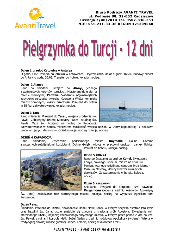 Biuro P odró ży AV ANTI TR AVE L ul. Podl esie 88 , 32-05 2 Radziszów Lice ncja Z/40/20 10 Tel . 050 7-836- 35 3 NI P: 5 51-2 11-3 3-36 R EGON 12 130 95 48 Dzień 1 przelot Katowice – Antalya O godz. 14:20 zbiórka na lotnisku w Katowicach – Pyrzowicach. Odlot o godz. 16:20. Planowy przylot do Antalyi o godz. 20:05. Transfer do hotelu, kolacja, nocleg. Dzień 2 Alanya Rano po śniadaniu Przejazd do Alanyi, jednego z ważniejszych kurortów tureckich. Miasto znajduje się na terenie starożytnej Pamfilii. Zwiedzanie najważniejszych zabytków: seldżucka twierdza, Czerwona Wieża, kompleks murów obronnych, kościół bizantyjski. Przejazd do hotelu w Silifke, zakwaterowanie, kolacja, nocleg. Dzień 3 Tars Rano śniadanie. Przejazd do Tarsu, miejsca urodzenia św. Pawła. Zobaczymy Bramę Kleopatry, Dom i studnię św. Pawła. Msza św. Przejazd na nocleg do Kapadocji. Zakwaterowanie w hotelu, Wieczorem możliwość wzięcia udziału w „nocy kapadockiej” z pokazem tańca wirujących derwiszów. Obiadokolacja, nocleg. kolacja, nocleg. DZIEŃ 4 KAPADOCJA Rano śniadanie, Zwiedzanie podziemnego miasta Kaymakli. Dolina Goreme z wczesnochrześcijańskimi kościołami, Dolinę Gołębi, wizyta w pracowni onyksu, zamek Uchisa. Powrót do hotelu, kolacja, nocleg. Dzień 5 KONYA Rano po śniadaniu wyjazd do Konyi. Zwiedzanie Konya, dawnego Ikonium, miasta na szlak św. Pawła), ważnego religijnego centrum życia islamu Muzeum Mevlany, dawny klasztor wirujących derwiszów. Zakwaterowanie w hotelu, kolacja, nocleg. DZIEŃ 6 PERGAMON Śniadanie. Przejazd do Bergama, czyli dawnego Pergamonu (jeden z siedmiu kościołów Apokalipsy św. Jana). Zwiedzanie ruin starożytnego miasta, Kolacja, nocleg na wybrzeżu egejskim koło Pergamonu. DZIEŃ 7 EFEZ Śniadanie. Przejazd do Efezu. Nawiedzenie Domu Matki Bożej, w którym spędziła ostatnie lata życia oraz bazyliki św. Jana, gdzie znajduje się zgodnie z tradycją grób Apostoła. Zwiedzanie ruin starożytnego Efezu, najlepiej zachowanego antycznego miasta, w którym przez ponad 2 lata nauczał św. Paweł, z ruinami kościoła Matki Bożej (jeden z siedmiu kościołów Apokalipsy św.Jana). Wizyta w tradycyjnej dawnej wiosce greckiej Sirince. Kolacja, nocleg w okolicach Efezu. AV ANTI TR AV EL – ŚWI AT CZEKA NA CIEBIE ! Biuro P odró ży AV ANTI TR AVE L ul. Podl esie 88 , 32-05 2 Radziszów Lice ncja Z/40/20 10 Tel . 050 7-836- 35 3 NI P: 5 51-2 11-3 3-36 R EGON 12 130 95 48 DZIEŃ 8 PAMMUKALE, HIERAPOLIS Śniadanie. Przejazd do Pammukale i starożytnego Hierapolis, miejsca męczeństwa św. Filipa. Możliwość kąpieli w słynnych "basenach" tzw. Bawełnianego Zamku. Zakwaterowanie w hotelu, kolacja, nocleg. DZIEŃ 9 PERGE – ALANYA Rano po śniadaniu przejazd do Perge, położonego na północ od Antalyi, starożytnego miasta które św. Paweł odwiedził podczas swej pierwszej podróży misyjnej i po powrocie na Wybrzeże. Tu rozpoczyna się jeden z pieszych szlaków św. Pawła. Msza święta. Zakwaterowanie w hotelu na Wybrzeżu, kolacja, nocleg. DZIEŃ 10 – 11 ALANYA Śniadanie. Wypoczynek na plaży. Kolacja, nocleg w ok. Alanya. Dzień 12 przelot Rano śniadanie, przejazd na lotnisko w Antalya, odlot o godz. 13:30. Przylot na lotnisko w Katowicach o godz. 15:20 CENA ZAWIERA: PRZELOT SAMOLOTEM CZARTEROWYM PRZEJAZD KOMFORTOWYM AUTOKAREM 11 NOCLEGÓW W HOTELACH *** ( lub 4* w zależności od wybranej opcji ) WYŻYWIENIE: 11 ŚNIADAŃ, 11 OBIADOKOLACJI UBEZPIECZENIE TURYSTYCZNE Signal Iduna KL, NNW, bagaż OPIEKA PILOTA PODATEK VAT CENA NIE ZAWIERA: Biletów wstępu do zwiedzanych obiektów, lokalnych przewodników, obowiązkowych zwyczajowych napiwków, nocy kapadockiej – łączny koszt ok. 120 Euro Wizy tureckiej koszt 15 Euro lub 20 USD ( płatne na lotnisku w Turcji ) termin: wrzesień 2011 cena: 3290 zł ( hotele 3* ) + 400 zł ( hotele 4* ) AV ANTI TR AV EL – ŚWI AT CZEKA NA CIEBIE ! Biuro P odró ży AV ANTI TR AVE L ul. Podl esie 88 , 32-05 2 Radziszów Lice ncja Z/40/20 10 Tel . 050 7-836- 35 3 NI P: 5 51-2 11-3 3-36 R EGON 12 130 95 48 AV ANTI TR AV EL – ŚWI AT CZEKA NA CIEBIE ! Biuro P odró ży AV ANTI TR AVE L ul. Podl esie 88 , 32-05 2 Radziszów Lice ncja Z/40/20 10 Tel . 050 7-836- 35 3 NI P: 5 51-2 11-3 3-36 R EGON 12 130 95 48 AV ANTI TR AV EL – ŚWI AT CZEKA NA CIEBIE !