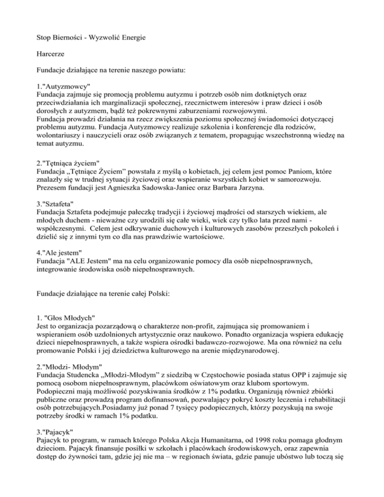 Stop Bierności - Wyzwolić Energie Harcerze Fundacje działające na terenie naszego powiatu: 1."Autyzmowcy" Fundacja zajmuje się promocją problemu autyzmu i potrzeb osób nim dotkniętych oraz przeciwdziałania ich marginalizacji społecznej, rzecznictwem interesów i praw dzieci i osób dorosłych z autyzmem, bądź też pokrewnymi zaburzeniami rozwojowymi. Fundacja prowadzi działania na rzecz zwiększenia poziomu społecznej świadomości dotyczącej problemu autyzmu. Fundacja Autyzmowcy realizuje szkolenia i konferencje dla rodziców, wolontariuszy i nauczycieli oraz osób związanych z tematem, propagując wszechstronną wiedzę na temat autyzmu. 2."Tętniąca życiem" Fundacja „Tętniące Życiem” powstała z myślą o kobietach, jej celem jest pomoc Paniom, które znalazły się w trudnej sytuacji życiowej oraz wspieranie wszystkich kobiet w samorozwoju. Prezesem fundacji jest Agnieszka Sadowska-Janiec oraz Barbara Jarzyna. 3."Sztafeta" Fundacja Sztafeta podejmuje pałeczkę tradycji i życiowej mądrości od starszych wiekiem, ale młodych duchem - nieważne czy urodzili się całe wieki, wiek czy tylko lata przed nami współczesnymi. Celem jest odkrywanie duchowych i kulturowych zasobów przeszłych pokoleń i dzielić się z innymi tym co dla nas prawdziwie wartościowe. 4."Ale jestem" Fundacja "ALE Jestem" ma na celu organizowanie pomocy dla osób niepełnosprawnych, integrowanie środowiska osób niepełnosprawnych. Fundacje działające na terenie całej Polski: 1. "Głos Młodych" Jest to organizacja pozarządową o charakterze non-profit, zajmująca się promowaniem i wspieraniem osób uzdolnionych artystycznie oraz naukowo. Ponadto organizacja wspiera edukację dzieci niepełnosprawnych, a także wspiera ośrodki badawczo-rozwojowe. Ma ona również na celu promowanie Polski i jej dziedzictwa kulturowego na arenie międzynarodowej. 2."Młodzi- Młodym" Fundacja Studencka „Młodzi-Młodym” z siedzibą w Częstochowie posiada status OPP i zajmuje się pomocą osobom niepełnosprawnym, placówkom oświatowym oraz klubom sportowym. Podopieczni mają możliwość pozyskiwania środków z 1% podatku. Organizują również zbiórki publiczne oraz prowadzą program dofinansowań, pozwalający pokryć koszty leczenia i rehabilitacji osób potrzebujących.Posiadamy już ponad 7 tysięcy podopiecznych, którzy pozyskują na swoje potrzeby środki w ramach 1% podatku. 3."Pajacyk" Pajacyk to program, w ramach którego Polska Akcja Humanitarna, od 1998 roku pomaga głodnym dzieciom. Pajacyk finansuje posiłki w szkołach i placówkach środowiskowych, oraz zapewnia dostęp do żywności tam, gdzie jej nie ma – w regionach świata, gdzie panuje ubóstwo lub toczą się wojny i trwałe konflikty zbrojne. Zajmuje się • dożywianie w szkołach i placówkach środowiskowych w Polsce • dostarczenie żywności dla dzieci i ich rodziców w czasie kryzysów humanitarnych • dożywianie terapeutyczne dzieci, matek karmiących i kobiet w ciąży 4.Fundacja Dom - Dbamy O Młodych Fundacja DOM Dbamy O Młodych powstała we Wrocławiu w 2014 roku z inicjatywy jej założyciela i Fundatora – Tomasza Michalskiego. Jest niezależną organizacją pozarządową, której misją jest wszechstronna pomoc dzieciom i młodzieży najciężej doświadczonych przez los, które nie znajdują wystarczającego wsparcia w środowisku w którym żyją. Celem jest wyrównywać szanse życiowe dzieci z domów dziecka, których każdego roku niestety jest coraz więcej, ale również młodzieży, z trudnych i dysfunkcyjnych rodzin. Pomaga finansowo, poprzez organizowanie stypendiów naukowych i sportowych dla najbardziej uzdolnionych, by pielęgnować i wspierać pasje i marzenia. 5. „Mimo Wszystko” Fundacja Anny Dymnej „Mimo Wszystko” posiada status Organizacji Pożytku Publicznego. Została założona we wrześniu 2003 roku. Głównym zadaniem jest pomoc dorosłym osobom z niepełnosprawnością intelektualną. Od 2003 roku Fundacja pomogła blisko 22 000 osób chorych i niepełnosprawnych w całej Polsce, dofinansowując leczenie, rehabilitację, wspierając edukację, a także promując ich twórczość artystyczną . Ponadto – dzięki Darczyńcom oraz Sponsorom – wybudowała, utrzymuje i prowadzi ośrodek terapeutyczno-rehabilitacyjny dla osób niepełnosprawnych intelektualnie „Dolina Słońca” w podkrakowskich Radwanowicach oraz Warsztat Terapii Zajęciowej w nadbałtyckim Lubiatowie. W Biurze Młodych Fundacji Anny Dymnej „Mimo Wszystko” zajmują się propagowaniem idei wolontariatu, m.in. realizując w szkołach projekt „Każdy jest komuś potrzebny”. Harcerze starsi Tekst źródłowy, Autor: Joanna Świba... "Każdy z nas zna uczucie onieśmielenia. Często staramy się unikać wystąpień publicznych oraz czujemy się nieswojo, w towarzystwie nieznajomych. Jednak, gdy w sytuacjach wymagających kontaktów interpersonalnych strach zaczyna nas paraliżować, możemy mieć do czynienia z fobią społeczną. Objawy fobii społecznej Inna nazwa fobii społecznej, to zaburzenie lęku społecznego. Pojawia się silny strach, przed sytuacjami, gdzie możemy zwrócić na siebie uwagę. Bardzo często, paraliżujący lęk pojawia się już na samą myśl o sytuacjach społecznych. Nie mówimy tutaj o zwykłej tremie, towarzyszącej wielu wystąpieniu publicznym, lub niezręcznym milczeniu podczas zapoznawania z nowymi osobami. Jeżeli lęk nie jest paraliżujący, staje się normalną częścią życia. Co więcej, dzięki niewielkiemu przerażeniu, w naszym organizmie wytwarza się adrenalina, powodująca mobilizację organizmu oraz ułatwiająca skupienie na wyznaczonym celu. Jednak jeżeli strach jest wyjątkowo nasilony, pojawia się problem. Jeżeli problem sprawiają nam czynności takie jak: telefonowanie w obecności innych, zabieranie głosu podczas dyskusji, jedzenie w miejscach publicznych, rozmowa z przełożonymi, załatwianie spraw w urzędach, przemawianie 