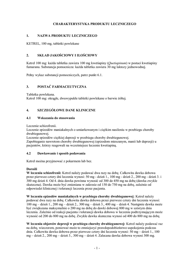 CHARAKTERYSTYKA PRODUKTU LECZNICZEGO 1. NAZWA PRODUKTU LECZNICZEGO KETREL, 100 mg, tabletki powlekane 2. SKŁAD JAKOŚCIOWY I ILOŚCIOWY Ketrel 100 mg: każda tabletka zawiera 100 mg kwetiapiny (Quetiapinum) w postaci kwetiapiny fumaranu. Substancja pomocnicza: każda tabletka zawiera 30 mg laktozy jednowodnej. Pełny wykaz substancji pomocniczych, patrz punkt 6.1. 3. POSTAĆ FARMACEUTYCZNA Tabletka powlekana. Ketrel 100 mg: okrągłe, dwuwypukłe tabletki powlekane o barwie żółtej. 4. SZCZEGÓŁOWE DANE KLINICZNE 4.1 Wskazania do stosowania Leczenie schizofrenii. Leczenie epizodów maniakalnych o umiarkowanym i ciężkim nasileniu w przebiegu choroby dwubiegunowej. Leczenie epizodów ciężkiej depresji w przebiegu choroby dwubiegunowej. Zapobieganie nawrotom choroby dwubiegunowej (epizodom mieszanym, manii lub depresji) u pacjentów, którzy reagowali na wcześniejsze leczenie kwetiapiną. 4.2 Dawkowanie i sposób podawania Ketrel można przyjmować z pokarmem lub bez. Dorośli W leczeniu schizofrenii: Ketrel należy podawać dwa razy na dobę. Całkowita dawka dobowa przez pierwsze cztery dni leczenia wynosi: 50 mg - dzień 1., 100 mg - dzień 2., 200 mg - dzień 3. i 300 mg dzień 4. Od 4. dnia dawka powinna wynosić od 300 do 450 mg na dobę (dawka zwykle skuteczna). Dawka może być zmieniana w zakresie od 150 do 750 mg na dobę, zależnie od odpowiedzi klinicznej i tolerancji leczenia przez pacjenta. W leczeniu epizodów maniakalnych w przebiegu choroby dwubiegunowej: Ketrel należy podawać dwa razy na dobę. Całkowita dawka dobowa przez pierwsze cztery dni leczenia wynosi: 100 mg – dzień 1., 200 mg – dzień 2., 300 mg – dzień 3., 400 mg – dzień 4. Następnie dawka może być zwiększana maksymalnie o 200 mg na dobę do dawki dobowej 800 mg w szóstym dniu leczenia. Zależnie od reakcji pacjenta i tolerancji dawka dobowa w leczeniu podtrzymującym może wynosić od 200 do 800 mg na dobę. Zwykle dawka skuteczna wynosi od 400 do 800 mg na dobę. W leczeniu objawów depresji w przebiegu choroby dwubiegunowej: Ketrel należy podawać raz na dobę, wieczorem, ponieważ może to zmniejszyć prawdopodobieństwo uspokojenia podczas dnia. Całkowita dawka dobowa przez pierwsze cztery dni leczenia wynosi: 50 mg – dzień 1., 100 mg – dzień 2., 200 mg – dzień 3., 300 mg – dzień 4. Zalecana dawka dobowa wynosi 300 mg. -1- Zależnie od odpowiedzi pacjenta na leczenie dawkę produktu Ketrel można zwiększyć do 600 mg na dobę. Skuteczność przeciwdepresyjna została wykazana dla dawek 300 mg i 600 mg na dobę, jednak w grupie przyjmującej 600 mg nie zaobserwowano dodatkowych korzyści podczas krótkotrwałego leczenia (patrz punkt 5.1). Leczenie epizodów depresji w przebiegu choroby dwubiegunowej powinno być prowadzone przez lekarza doświadczonego w leczeniu choroby dwubiegunowej. Zapobieganie nawrotom w chorobie dwubiegunowej Pacjentów z choroba afektywna dwubiegunową, u których wystąpiła pozytywna odpowiedź na leczenie kwetiapiną epizodu manii, epizodu mieszanego bądź depresyjnego, powinni kontynuować leczenie w takich samych dawkach. Dawkę należy ustalić indywidualnie w zależności od odpowiedzi klinicznej i tolerancji leczenia, w przedziale od 300 do 800 mg na dobę (dwa razy na dobę). W terapii podtrzymującej powinna być stosowana najniższa dawka efektywna. Osoby w podeszłym wieku Podobnie jak inne leki przeciwpsychotyczne, produkt Ketrel należy stosować ostrożnie u pacjentów z tej grupy wiekowej, szczególnie w początkowym okresie podawania. Może być konieczne wolniejsze zwiększanie dawki i podawanie mniejszej dawki dobowej niż u młodszych pacjentów zależnie od odpowiedzi klinicznej i tolerancji leczenia przez pacjenta. Średni klirens kwetiapiny u pacjentów w podeszłym wieku był zmniejszony o 30% do 50% w porównaniu do wartości u młodszych pacjentów. Nie badano bezpieczeństwa i skuteczności stosowania u pacjentów powyżej 65 lat z epizodami depresji w przebiegu choroby dwubiegunowej. Dzieci i młodzież Nie jest wskazane stosowanie kwetiapiny u dzieci i młodzieży poniżej 18 lat z powodu braku danych dotyczących stosowania leku w tej grupie wiekowej. Zaburzenia czynności nerek Nie ma konieczności zmiany dawki u pacjentów z zaburzeniami czynności nerek. Zaburzenia czynności wątroby Kwetiapina jest w znacznym stopniu metabolizowana w wątrobie. Dlatego należy ją stosować ostrożnie u pacjentów ze stwierdzonymi zaburzeniami czynności wątroby, szczególnie w początkowym okresie podawania. U pacjentów z zaburzeniami czynności wątroby leczenie należy rozpoczynać od dawki 25 mg na dobę. Dawkę można zwiększać codziennie o 25 mg do 50 mg aż do osiągnięcia dawki skutecznej, zależnie od odpowiedzi klinicznej i tolerancji leczenia przez pacjenta. 4.3 Przeciwwskazania Nadwrażliwość na kwetiapinę lub którąkolwiek substancję pomocniczą produktu. Jednoczesne stosowanie inhibitorów układu cytochromu P450 3A4, takich jak inhibitory proteaz stosowane w leczeniu HIV, leki przeciwgrzybicze z grupy azoli, erytromycyna, klarytromycyna i nefazodon (patrz punkt 4.5). 4.4 Specjalne ostrzeżenia i środki ostrożności dotyczące stosowania Samobójstwa/myśli samobójcze lub pogorszenie stanu klinicznego Depresja w przebiegu choroby dwubiegunowej jest związana ze zwiększonym ryzykiem występowania myśli samobójczych, samouszkodzeń i samobójstw (zdarzenia związane z próbami samobójczymi). Ryzyko to utrzymuje się do czasu uzyskania istotnej klinicznie remisji. Poprawa -2- może nie wystąpić przez kilka pierwszych lub więcej tygodni leczenia i w związku z tym pacjent powinien pozostawać pod ścisłą kontrolą lekarską do czasu wystąpienia poprawy. Doświadczenie kliniczne wskazuje, że ryzyko samobójstw zwiększa się we wczesnej fazie poprawy klinicznej. W badaniach klinicznych u pacjentów z ciężką depresją w przebiegu choroby dwubiegunowej obserwowano zwiększone ryzyko zdarze
