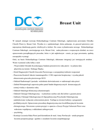 Breast Unit W ramach strategii rozwoju Dolnośląskiego Centrum Onkologii, zaplanowano powstanie Ośrodka Chorób Piersi tj. Breast Unit. Wynika to z epidemiologii, która pokazuje, że gruczoł piersiowy jest najczęstszą lokalizacją guzów złośliwych u kobiet. Do czasu wybudowania nowego Dolnośląskiego Centrum Onkologii, zawierającego m.in. Breast Unit, zadecydowano o rozpoczęciu działań, na rzecz opracowania porządkujących procedur, które w jak najkrótszym czasie, po jego powstaniu, spełnią europejskie wymogi. Otóż, na bazie Dolnośląskiego Centrum Onkologii, dokonano integracji już istniejących struktur . Warto wymienić tylko kilka z nich - Wojewódzki Ośrodek Koordynujący badania przesiewowe raka piersi - to jedyna taka placówka na terenie Dolnego Śląska; - Dział Diagnostyki Chorób Gruczołu Piersiowego o europejskiej trafności rozpoznań - Pracownia Kontroli Jakości mammografów i USG zapewnia bezpieczną i wysoką jakość obrazowania gruczołu piersiowego DCO - Oddział Radioterapii I posiada wieloletnie doświadczenie w radioterapii raka piersi - Zakład Histopatologii zapewnia pełen panel badań diagnostycznych dostarczających cennej wiedzy o dynamice raka; - Oddział Onkologii Klinicznej (chemioterapii) - Oddział Chirurgii Onkologicznej – wydzielono osobne sale dla kobiet z guzami piersi - Gabinety Chirurgii Onkologicznej (2) Specjalistycznej Przychodni Onkologicznej zadedykowane wyłącznie schorzeniom piersi. Trafiają tu również kobiety z programów profilaktycznych. Opracowano procedurę diagnostyczną oraz kwalifikacyjną do leczenia chirurgicznego. Stworzono system przyjęć w oparciu o Zeszyt Przyjęć Schorzeń Piersi oraz wdrożono współpracę z oddziałami zabiegowymi. - psycholog, - Komisja Leczenia Raka Piersi pod kierunkiem dr med. Anny Pawlaczyk– ustala program leczenia pooperacyjnego zgodnie z zasadami leczenia uzupełniającego 1 Powstał wielodyscyplinarny zespół, którego Koordynatorem jest prof. dr hab. med. Rafał Matkowski. W projekcie uczestniczą onkolodzy, różnych specjalności, którzy pracują w naszym ośrodku i widzą swoją przyszłość zawodową w przyszłym Breast Unit. O potrzebie tworzenia takich jednostek, jak Breast Unit mówi się w Polsce od lat. Badania przesiewowe w kierunku wczesnego wykrywania raka piersi są bardzo kosztowne; jak pokazuje praktyka – korzystanie z nich wciąż nie jest zadawalające. Specjalistyczny Ośrodek Chorób Piersi może to zmienić. Jest on złożoną strukturą organizacyjną, obejmującą swoimi działaniami wiele celów, które normują europejskie wytyczne – EUSOMA. W ich zakres wchodzą m.in. działania na rzecz wypracowania metod osiągnięcia wysokiego poziomu korzystania z badań profilaktycznych oraz zapewnienie dostępu do wysokiej jakości usług specjalistycznych – poczynając od diagnostyki, po wielospecjalistyczne leczenie onkologiczne i profesjonalną opiekę po leczeniu. Powołany w Dolnośląskim Centrum Onkologii, wielodyscyplinarny zespół narządowy, ma za zadanie skupienia szczególnej uwagi na postępach w zakresie wczesnej diagnostyki nowotworów piersi oraz, co bardzo ważne, na wdrażaniu optymalnych metod leczenia w jak najkrótszym czasie od momentu rozpoznania raka piersi. Po oszczędzającym zabiegu chirurgicznym kobieta jest kierowana na Komisję do Spraw Leczenia Raka Piersi. W skład Komisji wchodzą lekarze różnych specjalności onkologicznych: chirurg, chemioterapeuta, radioterapeuta, histopatolog. Ustalają program leczenia uzupełniającego oraz terminy jego rozpoczęcia. W ten sposób chora ma gwarancję utrzymania ciągłości kuracji bez zbędnych kolejek. Jest to pierwszy etap wdrożenia procedury zajmującej się leczeniem raka piersi – obecnie do Komisji kierowane są wyłącznie pacjentki operowane w Dolnośląskim Centrum Onkologii we Wrocławiu. Każda pacjentka otrzymuje protokół konsultacji, który podpisują lekarze uczestniczący w procesie leczenia. Karta Konsultacyjna, którą otrzymuje chora zawiera pełną wiedzę na temat nowotworu oraz planów terapeutycznych. Dzięki temu pacjentka może trafić na leczenie specjalistyczne do wybranego przez siebie miejsca – niekoniecznie w DCO. Spotkanie z Komisją ds. Leczenia Raka Piersi stwarza również okazję bezpośredniej rozmowy chorej z zespołem konsultujących specjalistów. Może ona m.in. uzyskać cenne dla siebie informacje o celowości leczenia uzupełniającego oraz na czym ono polega. Sytuacja taka stwarza pacjentka wie, że o jej wyzdrowienie dba zespół wysokiej klasy specjalistów. poczucie bezpieczeństwa. Opisane podjęte działania stwarzają realną nadzieję na poprawę wyników leczenia. 2