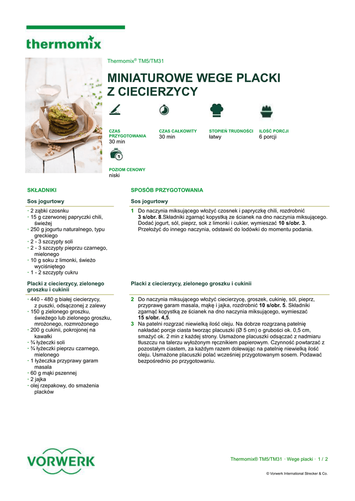 Thermomix® TM5/TM31 MINIATUROWE WEGE PLACKI Z CIECIERZYCY CZAS PRZYGOTOWANIA 30 min CZAS CAŁKOWITY STOPIEŃ TRUDNOŚCI ILOŚĆ PORCJI 30 min łatwy 6 porcji POZIOM CENOWY niski SKŁADNIKI SPOSÓB PRZYGOTOWANIA Sos jogurtowy Sos jogurtowy · 2 ząbki czosnku · 15 g czerwonej papryczki chili, świeżej · 250 g jogurtu naturalnego, typu greckiego · 2 - 3 szczypty soli · 2 - 3 szczypty pieprzu czarnego, mielonego · 10 g soku z limonki, świeżo wyciśniętego · 1 - 2 szczypty cukru 1 Do naczynia miksującego włożyć czosnek i papryczkę chili, rozdrobnić 3 s/obr. 8.Składniki zgarnąć kopystką ze ścianek na dno naczynia miksującego. Dodać jogurt, sól, pieprz, sok z limonki i cukier, wymieszać 10 s/obr. 3. Przełożyć do innego naczynia, odstawić do lodówki do momentu podania. Placki z ciecierzycy, zielonego groszku i cukinii Placki z ciecierzycy, zielonego groszku i cukinii · 440 - 480 g białej ciecierzycy, z puszki, odsączonej z zalewy · 150 g zielonego groszku, świeżego lub zielonego groszku, mrożonego, rozmrożonego · 200 g cukinii, pokrojonej na kawałki · ¾ łyżeczki soli · ¾ łyżeczki pieprzu czarnego, mielonego · 1 łyżeczka przyprawy garam masala · 60 g mąki pszennej · 2 jajka · olej rzepakowy, do smażenia placków 2 Do naczynia miksującego włożyć ciecierzycę, groszek, cukinię, sól, pieprz, przyprawę garam masala, mąkę i jajka, rozdrobnić 10 s/obr. 5. Składniki zgarnąć kopystką ze ścianek na dno naczynia miksującego, wymieszać 15 s/obr. 4,5. 3 Na patelni rozgrzać niewielką ilość oleju. Na dobrze rozgrzaną patelnię nakładać porcje ciasta tworząc placuszki (Ø 5 cm) o grubości ok. 0,5 cm, smażyć ok. 2 min z każdej strony. Usmażone placuszki odsączać z nadmiaru tłuszczu na talerzu wyłożonym ręcznikiem papierowym. Czynność powtarzać z pozostałym ciastem, za każdym razem dolewając na patelnię niewielką ilość oleju. Usmażone placuszki polać wcześniej przygotowanym sosem. Podawać bezpośrednio po przygotowaniu. Thermomix® TM5/TM31 · Wege placki · 1 / 2 © Vorwerk International Strecker & Co. WARTOŚCI ODŻYWCZE NA PORCJĘ Wartość energetyczna WSKAZÓWKA 1327 kJ / 318 kcal Białko 13 g Węglowodany 28 g Tłuszcze 17 g Cholesterol Błonnik 72 mg 8g · Przyprawę garam masala można przygotować w urządzeniu Thermomix®. · Składniki: 1 łyżka ziarenek pieprzu czarnego 1 łyżka nasion kolendry 1 łyżka nasion kardamonu 1 łyżka nasion kminu rzymskiego 1 laska cynamonu, dł. ok. 4 cm, pokrojona na kawałki ¾ łyżeczki goździków 2 liście laurowe, suszone, pokrojone na kawałki ½ łyżeczki gałki muszkatołowej, mielonej · Do czystego i suchego naczynia miksującego wsypać pieprz, kolendrę, kardamon, kmin rzymski, cynamon, goździki i liście laurowe, prażyć bez założonej miarki 3 min/120°C/obr. 1. Dodać gałkę muszkatołową, zemleć 1 min/obr. 10. Przesypać do słoika, odstawić. CZĘŚCI THERMOMIXA kopystka, miarka Thermomix® TM5/TM31 · Wege placki · 2 / 2 © Vorwerk International Strecker & Co.