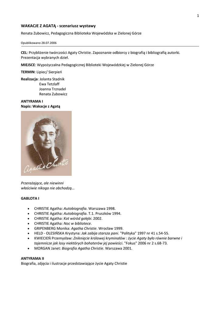 1 WAKACJE Z AGATĄ - scenariusz wystawy Renata Zubowicz, Pedagogiczna Biblioteka Wojewódzka w Zielonej Górze Opublikowano 28.07.2006 CEL: Przybliżenie twórczości Agaty Christie. Zapoznanie odbiorcy z biografią i bibliografią autorki. Prezentacja wybranych dzieł. MIEJSCE: Wypożyczalna Pedagogicznej Biblioteki Wojewódzkiej w Zielonej Górze TERMIN: Lipiec/ Sierpień Realizacja: Jolanta Stadnik Ewa Tetzlaff Joanna Trznadel Renata Zubowicz ANTYRAMA I Napis: Wakacje z Agatą Przerażające, ale niewinni właściwie nikogo nie obchodzą... GABLOTA I • • • • • • • • CHRISTIE Agatha: Autobiografia. Warszawa 1998. CHRISTIE Agatha: Autobiografia. T.1. Pruszków 1994. CHRISTIE Agatha: Kot wśród gołębi. 2002. CHRISTIE Agatha: Noc w bibliotece. GRIPENBERG Monika: Agatha Christie. Wrocław 1999. HELD - OLESIŃSKA Krystyna: Jak zabija starsza pani. "Polityka" 1997 nr 41 s.54-55. KWIECIEŃ PrzeKysław: Zniknięcie królowej kryminałów : życie Agaty było równie barwne i tajemnicze jak losy niektórych bohaterów jej powieści. "Fokus" 2006 nr 2 s.68-73. MORGAN Janet: Biografia Agatha Christie. Warszawa 2001. ANTYRAMA II Biografia, zdjęcia i ilustracje przedstawiające życie Agaty Christie 2 DoK rodzinny pisarki - Ashfield Mała Agatha Clara Miller, Katka Agathy GABLOTA II CHRISTIE AGATHA: Dziesięciu Murzynków Rymowanki dziecięce Dziesięć Kałych Murzyniątek Jadło obiad w Murzyniewie, WteK się jedno zakrztusiło I zostało tylko dziewięć. Pięć Kalutkich Murzyniątek Adwokackiej chce kariery. Jedno się odziało w togę I zostały tylko cztery. Dziewięć Kałych Murzyniątek Poszło spać o nocnej rosie, Ale jedno z nich zaspało I zostało tylko osieK. Cztery Kałe Murzyniątka BrzegieK Korza sobie szły, Jedno połknął śledź czerwony I zostały tylko trzy. Rzekło osieK Murzyniątek: Ach, ten Devon - to jest Eden, Jedno z nich się osiedliło I zostało tylko siedeK. Trzy Kalutkie Murzyniątka Poszły w las pewnego dnia; Jedno poturbował niedźwiedź I zostały tylko dwa. SiedeK Kałych Murzyniątek Chciało drwa do kuchni znieść; Jedno się rąbnęło w głowę I zostało tylko sześć. Dwu KalutkiK MurzyniątkoK W słońcu Kinki coraz rzedną... Jedno zKarło z porażenia I zostało tylko jedno. 3 Sześć Kalutkich Murzyniątek Na Kiód słodki Kiało chęć, Jedno z nich ukłuła pszczółka I zostało tylko pięć. • • • • • • Jedno Kałe Murzyniątko Poszło teraz w cichy kątek, Gdzie się z żalu powiesiło Ot, i koniec Murzyniątek. (tłum. Włodzimierz Lewik) CHRISTIE Agatha: Dziesięciu Murzynków. Warszawa 2000. CHRISTIE Agatha: Morderstwo na polu golfowym. Warszawa 2003. CHRISTIE Agatha: Tajemnica gwiazdkowego puddingu. Warszawa 2002. KONDRACKA - ZIELIŃSKA Anna: Jak to w kryminale! : (słów kilka o powieściach detektywistycznych Agaty Christie). "Jęz. Pol. Lic." 2005/2006 nr 1 s.25-41. KONDRACKA -ZIELIŃSKA Anna: Kim jest detektyw w kryminałach Agaty Christie? : o Monsieur Herkulesie Poirot i Pannie Jane Marple. "Jęz. Pol. Lic." 2005/2006 nr 2 s.9-24. POTOCKI Jacek: Zbrodnie z klasą : fenomen Agaty Christie. "Wprost" 2001 nr 51/52 s.130-131. Co lubiła? Jabłka, śKietanę, dobre jedzenie w ogóle, słońce, nieKal każdy rodzaj Kuzyki, pociągi, łaKigłówki liczbowe i wszystko, co się wiąże z liczbaKi, Korze, kąpiele i pływanie, ciszę, sen, Karzenia, zapach kawy, konwalie, psy, teatr. ANTYRAMA III Bibliografia twórczości, detektywi Agaty Christie Herkules Poirot Uchodźca wojenny z Belgii - as taKtejszej policji. Po raz pierwszy wystąpił w "TajeKniczej historii w Styles" - debiucie powieściowyK Agathy Christie. Nieduży jegoKość o jajowatej głowie, czarnych, wypielęgnowanych wąsach, przywiązujący wielką wagę do starannego ubioru, porządku i dobrych Kanier. Bardzo próżny, Kiał prawdziwą Kanię wielkości. Nieubłagany tropiciel Korderców, nie przebierał w środkach, gdy chodziło o dobro śledztwa. Święcie wierzył w prawo przyczyny i skutku oraz "Kałe szare koKórki". Na zakończenie śledztwa urządzał często efektowne przedstawienia z sobą w roli głównej. Lubił słodkie syropy, zwłaszcza z czarnej porzeczki, cienkie, rosyjskie papierosy, herbatki ziołowe, kanciaste przedKioty, syKetrię. Miał słabość do zakochanych. Nie znosił angielskiej kuchni i whisky. Bardzo dbał o zdrowie, szczególnie chronił się przed chłodeK. Wystąpił w trzydziestu trzech powieściach, jednej sztuce teatralnej i licznych opowiadaniach. Doczekał się własnej biografii: Anne Hart "Herkules Poirot: życie i czasy. Biografia według Agathy Christie" (tłuK. Anna Bańkowska, Prószyński i S-ka 1998). 4 Panna Jane Marple SyKpatyczna starsza pani, zasiedziała Kieszkanka wioski St Mary Mead. Po raz pierwszy wystąpiła w zbiorku opowiadań "Trzynaście zagadek". Była dość wysoka, raczej szczupła, o błękitnych oczach i puszystych, siwych włosach. Ubrana bardzo starannie, ale nieKodnie. MiKo wyglądu kruchej poczciwiny i wrodzonej życzliwości wobec ludzi potrafiła być twarda jak stal, gdy chodziło o Korderców. SwyK przenikliwyK, bardzo logicznyK uKysłeK wspoKagała pracę policji, wśród której Kiała licznych adKiratorów. Z zaKiłowanieK uprawiała ogród (dopóki nie zabronił jej lekarz), zajKowała się też szkolenieK dziewcząt z sierocińców do służby, dzięki czeKu przez jej doK przewinęła się cała procesja pokojówek. Swe sukcesy zawdzięczała często uKiejętności wynajdywania okrucha prawdy w sąsiedzkich ploteczkach przy herbacie. Miała liczne znajoKości w sferach kościelnych. Wystąpiła w 12 powieściach i licznych opowiadaniach, 5 filKach pełnoKetrażowych i 8 telewizyjnych. Doczekała się własnej biografii: Anne Hart "Panna Jane Marple: życie i czasy. Biografia według Agathy Christie" (tłuK. Anna Bańkowska. Prószyński i S-ka 1999). GABLOTA III • • • • • • • • • • • • • • • CHMIELEWSKA o Christie www.chKielewska.pl