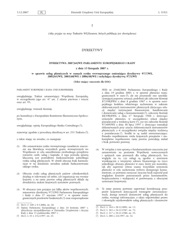 Dyrektywa 2007/64/WE Parlamentu Europejskiego i Rady