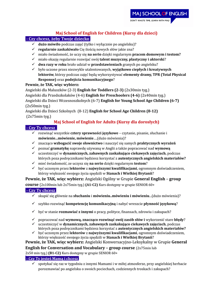 Maj School of English for Children (Kursy dla dzieci) - Czy chcesz, żeby Twoje dziecko dużo mówiło podczas zajęć (tylko i wyłącznie po angielsku)? regularnie zaskakiwało Cię ilością nowych słów jakie zna? miało świadomość, że uczy się na serio dzięki regularnym pracom domowym i testom? miało okazję regularnie rozwijać swój talent muzyczny, plastyczny i aktorski? dwa razy w roku brało udział w przedstawieniach granych po angielsku? było uczone przez niezwykle utalentowanych, wyjątkowo ciepłych i kreatywnych lektorów, którzy podczas zajęć będą wykorzystywać elementy dramy, TPR (Total Physical Response) oraz podejścia komunikacyjnego? Pewnie, że TAK, więc wybierz: Angielski dla Maluszków (2-3) English for Toddlers (2-3) (2x30min tyg.) Angielski dla Przedszkolaków (4-6) English for Preschoolers (4-6) (2x40min tyg.) Angielski dla Dzieci Wczesnoszkolnych (6-7) English for Young School Age Children (6-7) (2x50min tyg.) Angielski dla Dzieci Szkolnych (8-12) English for School Age Children (8-12) (2x75min tyg.) Maj School of English for Adults (Kursy dla dorosłych) - Czy Ty chcesz rozwinąć wszystkie cztery sprawności językowe – czytanie, pisanie, słuchanie i mówienie...mówienie, mówienie….(dużo mówienia)? znacząco wzbogacić swoje słownictwo i nauczyć się samych praktycznych wyrażeń poznać gramatykę naprawdę używaną w Anglii a także popracować nad wymową uczestniczyć w dynamicznych, zabawnych zaskakująco ciekawych zajęciach, podczas których poza podręcznikami będziesz korzystać z autentycznych angielskich materiałów? mieć świadomość, ze uczysz się na serio dzięki regularnym testom? być uczonym przez lektorów z najwyższymi kwalifikacjami, ogromnym doświadczeniem, którzy większość swojego życia spędzili w Stanach i Wielkiej Brytanii? Pewnie, że TAK, więc wybierz: Angielski Ogólny w Grupie General English – group course (2x100min lub 2x75min tyg.) (A1-C2) Kurs dostępny w grupie SENIOR 60+ - Czy Ty chcesz skupić się głównie na słuchaniu i mówieniu..mówieniu i mówieniu...(dużo mówienia)? szybko rozwinąć kompetencję komunikacyjną i nabyć wreszcie płynność językową? być w stanie rozmawiać z innymi o pracy, polityce, finansach, zdrowiu i zakupach? popracować nad wymową, znacząco rozwinąć swój zasób słów i wykorzenić stare błędy? uczestniczyć w dynamicznych, zabawnych zaskakująco ciekawych zajęciach, podczas których poza podręcznikami będziesz korzystać z autentycznych angielskich materiałów? być uczonym przez lektorów z najwyższymi kwalifikacjami, ogromnym doświadczeniem, którzy większość swojego życia spędzili w Stanach i Wielkiej Brytanii? Pewnie, że TAK, więc wybierz: Angielski Konwersacyjno-Leksykalny w Grupie General English for Conversation and Vocabulary – group course (2x75min lub 2x50 min tyg.) (B1-C2) Kurs dostępny w grupie SENIOR 60+ - Czy Ty jesteś Mamą i chcesz spotykać się raz w tygodniu z innymi Mamami i w miłej atmosferze, przy angielskiej herbacie porozmawiać po angielsku o swoich pociechach, codziennych troskach i zakupach? Pewnie, że TAK, więc wybierz: OTWARTE Konwersacje dla Mam General English for Conversation for Mums (OPEN SESSIONS) (1x40min) - Czy Ty jesteś studentem medycyny, lekarzem lub pielęgniarką i chcesz poszerzyć swoje słownictwo medyczne i poprawnie stosować terminologię medyczną? popracować nad wymową i być w stanie wygłosić prezentację na tematy medyczne? nabyć wreszcie płynność językową i przeprowadzić wywiad medyczny z pacjentem? Pewnie, że TAK, więc wybierz: Angielski Medyczny w Grupie Medical English – group course (2x75min tyg). (min. B1) - Czy Ty jesteś specjalistą w dziedzinie księgowości, bankowości lub finansów i chcesz być w stanie poprawnie zastosować terminologię biznesową, negocjować i użyć odpowiedniego słownictwa w czasie prezentacji? nauczyć się pisać listy i maile handlowe? przełamać lęk przed prowadzeniem rozmów biznesowych przez telefon? Pewnie, że TAK, więc wybierz: Angielski Biznesowy w Grupie Business English – group course (2x75min tyg). (min. B1) - Czy Ty planujesz wyjazd do Wielkiej Brytanii i chcesz znaleźć tam pracę i wiedzieć jak napisać swoje CV i list motywacyjny? przełamać strach przed rozmową telefoniczną z Anglikiem? wiedzieć jak komunikować się w codziennych sytuacjach na ulicy, w sklepie, u lekarza? być uczonym przez lektorkę, która przez ponad 10 lat mieszkała i pracowała w Anglii? Pewnie, że TAK, więc wybierz: Angielski Wyjazdowy w Grupie English for life and Work in the UK – group course (2x75min tyg). (min. A2) - Czy Ty zdajesz maturę w 2017 roku i chcesz powtórzyć to co umiesz i perfekcyjnie opanować materiał obowiązujący na egzaminie? poćwiczyć słuchanie oraz popracować nad tworzeniem wypowiedzi pisemnych? rozwinąć znacząco swoją znajomość słownictwa i struktur gramatycznych? poćwiczyć mówienie w zakresie obowiązującym na maturze? dowiedzieć się czego spodziewać się na egzaminie i jak go zdać? Pewnie, że TAK, więc wybierz: Angielski do Matury 2017 w Grupie (poziom podstawowy/rozszerzony) - English for Matura 2017 – group course (2x90min tyg). - Czy Ty nie przepadasz za zajęciami w grupie, wolisz bardziej kameralną atmosferę i chcesz żeby lektor skupił się wyłącznie na Tobie, Twoich potrzebach i oczekiwaniach językowych? uczyć się tylko z mężem, żoną, siostrą lub bratem? indywidualnie przygotować się do egzaminu językowego Cambridge lub matury? żeby Twoje dziecko nadrobiło zaległości w szkole w zaciszu własnego domu? Pewnie, że TAK, więc wybierz: Zajęcia indywidualne 1-1 VIP General English Zajęcia w mini parach/mini grupach (2-3 os.)Mini groups VIP General English Zajęcia indywidualne/Angielski Egzaminacyjny (gimnazjum, matura, FCE, CAE, CPE, Matura) 1-1 VIP Exam English Zajęcia indywidualne/Angielski Specjalistyczny Przygotowanie do 