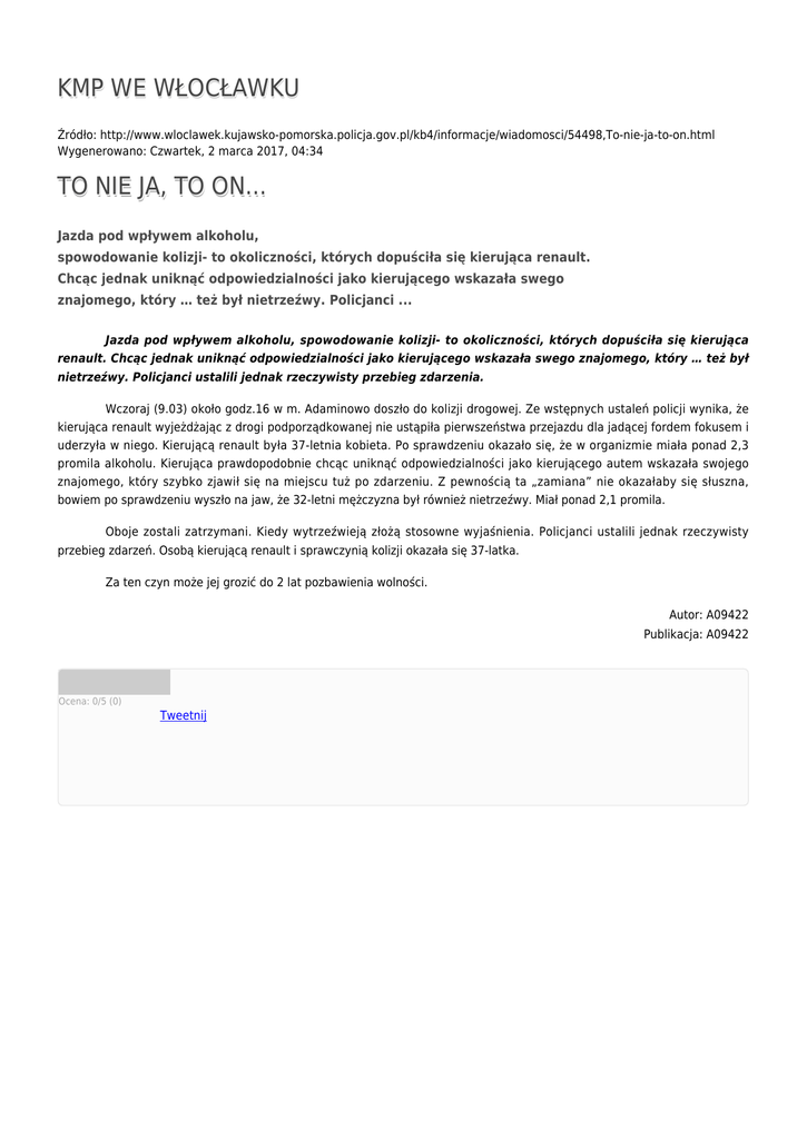 KMP WE WŁOCŁAWKU Źródło: http://www.wloclawek.kujawsko-pomorska.policja.gov.pl/kb4/informacje/wiadomosci/54498,To-nie-ja-to-on.html Wygenerowano: Czwartek, 2 marca 2017, 04:34 TO NIE JA, TO ON... Jazda pod wpływem alkoholu, spowodowanie kolizji- to okoliczności, których dopuściła się kierująca renault. Chcąc jednak uniknąć odpowiedzialności jako kierującego wskazała swego znajomego, który … też był nietrzeźwy. Policjanci ... Jazda pod wpływem alkoholu, spowodowanie kolizji- to okoliczności, których dopuściła się kierująca renault. Chcąc jednak uniknąć odpowiedzialności jako kierującego wskazała swego znajomego, który … też był nietrzeźwy. Policjanci ustalili jednak rzeczywisty przebieg zdarzenia. Wczoraj (9.03) około godz.16 w m. Adaminowo doszło do kolizji drogowej. Ze wstępnych ustaleń policji wynika, że kierująca renault wyjeżdżając z drogi podporządkowanej nie ustąpiła pierwszeństwa przejazdu dla jadącej fordem fokusem i uderzyła w niego. Kierującą renault była 37-letnia kobieta. Po sprawdzeniu okazało się, że w organizmie miała ponad 2,3 promila alkoholu. Kierująca prawdopodobnie chcąc uniknąć odpowiedzialności jako kierującego autem wskazała swojego znajomego, który szybko zjawił się na miejscu tuż po zdarzeniu. Z pewnością ta „zamiana” nie okazałaby się słuszna, bowiem po sprawdzeniu wyszło na jaw, że 32-letni mężczyzna był również nietrzeźwy. Miał ponad 2,1 promila. Oboje zostali zatrzymani. Kiedy wytrzeźwieją złożą stosowne wyjaśnienia. Policjanci ustalili jednak rzeczywisty przebieg zdarzeń. Osobą kierującą renault i sprawczynią kolizji okazała się 37-latka. Za ten czyn może jej grozić do 2 lat pozbawienia wolności. Autor: A09422 Publikacja: A09422 Ocena: 0/5 (0) Tweetnij