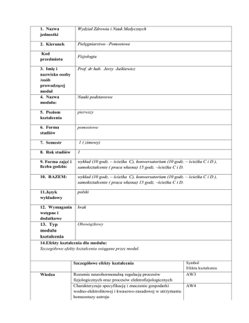 1. Nazwa jednostki Wydział Zdrowia i Nauk Medycznych 2. Kierunek Pielęgniarstwo –Pomostowe Kod przedmiotu Fizjologia 3. Imię i nazwisko osoby /osób prowadzącej moduł 4. Nazwa modułu: Prof. dr hab. Jerzy Jaśkiewicz 5. Poziom kształcenia pierwszy 6. Forma studiów pomostowe 7. Semestr 1 ( zimowy) 8. Rok studiów 1 9. Forma zajęć i liczba godzin: wykład (10 godz. – ścieżka C), konwersatorium (10 godz. – ścieżka C i D ), samokształcenie ( praca własna) 15 godz. –ścieżka C i D. 10. RAZEM: wykład (10 godz. – ścieżka C), konwersatorium (10 godz. – ścieżka C i D ), samokształcenie ( praca własna) 15 godz. –ścieżka C i D. 11.Język wykładowy polski 12. Wymagania wstępne i dodatkowe br ak 13. Typ modułu kształcenia Obowiązkowy Nauki podstawowe 14.Efekty kształcenia dla modułu: Szczegółowe efekty kształcenia osiągane przez moduł. Wiedza Szczegółowe efekty kształcenia Symbol Efektu kształcenia Rozumie neurohormonalną regulację procesów fizjologicznych oraz procesów elektrofizjologicznych Charakteryzuje specyfikację i znaczenie gospodarki wodno-elektrolitowej i kwasowo-zasadowej w utrzymaniu homeostazy ustroju AW3 AW4 Umiejętności Kompetencje społeczne Wykazuje różnice w budowie i charakteryzuje funkcje życiowe człowieka dorosłego i dziecka AU2 Opisuje zmiany w funkcjonowaniu organizmu jako całości w sytuacji zaburzenia jego homeostazy AU11 Systematycznie wzbogaca wiedzę zawodową i kształtuje umiejętności, dążąc do profesjonalizmu Jest otwarty na rozwój podmiotowości własnej i pacjenta AK2 AK9 15. Stosowane Wykład informacyjny, wykład problemowy, dyskusja metody dydaktyczne 16. Metody sprawdzania i kryteria oceny efektów kształcenia SYMBOL Formy sprawdzenia osiągnięcia efektu Efektu Kształcenia AW3 Test wielokrotnego wyboru AW4 Test wielokrotnego wyboru AU2 Pytania otwarte AU11 Pytania otwarte AK2 Samoocena studenta, ocena prowadzącego, ocena koleżeńska AK9 Samoocena studenta, ocena prowadzącego, ocena koleżeńska 19. Treści merytoryczne modułu 1. Zapoznanie studentów z budową i funkcją tkanek i narządów człowieka: układ oddechowy, układ krążenia, układ pokarmowy, układ nerwowy, układ rozrodczy, układ kostno-stawowy. 2. Fizjologia układu oddechowego: budowa i funkcja, mechanika oddychania, transport tlenu i dwutlenku węgla, wymiana gazowa w płucach. 3. Fizjologia układu krążenia: hemodynamika, aktywność mięśnia sercowego, regulacja ciśnienia tętniczego, regulacja lokalnego przepływu krwi, wymiana w łożysku kapilarnym. 4. Fizjologia układu pokarmowego: regulacja trawienia, wchłaniania, wydzielania i motoryki w przewodzie pokarmowym. 5. Fizjologia układu nerwowego: receptory czuciowe, ośrodki w centralnym systemie nerwowym, czuciowe i ruchowe szlaki nerwowe, nerwowa kontrola popędów, emocji oraz procesów snu i czuwania; pamięć i uczenie się. 6. Fizjologia układu rozrodczego: budowa i funkcja, regulacja oogenezy i spermatogenezy, regulacja cyklu miesięcznego; ciąża, poród i połóg. 7. Fizjologia układu kostno-stawowego: budowa, rodzaje i funkcje mięśni szkieletowych; rodzaje stawów i połączeń nieruchomych. Kościec człowieka. Wzajemne zależności w aspekcie wykonywania ruchów. 8. Przedstawienie zdolności adaptacyjnej w/w układów: termoregulacja, wysiłek, stres, wiek od niemowlęctwa po starość. Pojęcie homeostazy. Fizjologia - tematyka referatów przygotowywanych w ramach samokształcenia 1. Mechanizmy fizjologiczne adaptacji do niekorzystnych wpływów otoczenia 2. Czynność układu wewnątrzwydzielniczego w ciąży 3. Specyfika fizjologii osób starszych 20. Wykaz literatury obowiązkowej i uzupełniającej 1.Podstawowa Traczyk W. Fizologia człowieka w zarysie. PZWL. Warszawa 2007. 2.Uzupełniająca McLaughlin D, Stamford J, White D. Fizjologia człowieka. Krótkie wykłady. PWN. Warszawa 2008 Piotr Thor Podstawy patofizjologii człowieka. Podręcznik dla studentów i lekarzy. 2001 Sławomir Maśliński, Jan Ryżewski (red.) Patofizjologia. Podręcznik dla studentów medycyny Wydawnictwo Lekarskie PZWL