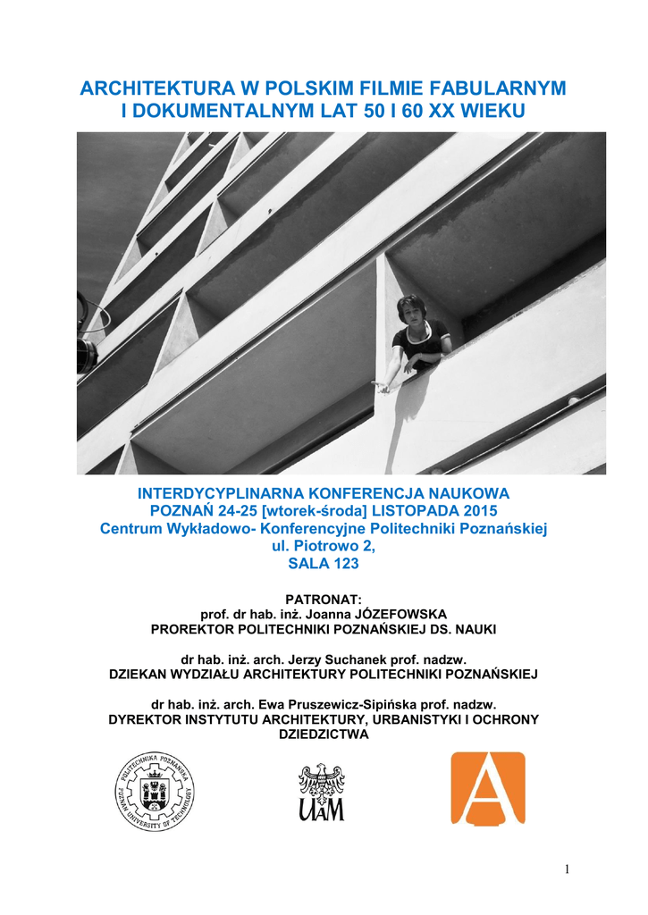 ARCHITEKTURA W POLSKIM FILMIE FABULARNYM I DOKUMENTALNYM LAT 50 I 60 XX WIEKU INTERDYCYPLINARNA KONFERENCJA NAUKOWA POZNAŃ 24-25 [wtorek-środa] LISTOPADA 2015 Centrum Wykładowo- Konferencyjne Politechniki Poznańskiej ul. Piotrowo 2, SALA 123 PATRONAT: prof. dr hab. inż. Joanna JÓZEFOWSKA PROREKTOR POLITECHNIKI POZNAŃSKIEJ DS. NAUKI dr hab. inż. arch. Jerzy Suchanek prof. nadzw. DZIEKAN WYDZIAŁU ARCHITEKTURY POLITECHNIKI POZNAŃSKIEJ dr hab. inż. arch. Ewa Pruszewicz-Sipińska prof. nadzw. DYREKTOR INSTYTUTU ARCHITEKTURY, URBANISTYKI I OCHRONY DZIEDZICTWA 1 PROGRAM RAMOWY WTOREK 24 LISTOPADA 2015 – SALA 123 CWK PP [I PIĘTRO] 10.00-11.00 REJESTRACJA UCZESTNIKÓW 10.00-11.15 OTWARCIE KONFERENCJI PANEL NR 1 KRONIKA FILMOWA MODERATOR PANELU: dr hab. Wojciech Otto prof. nadzw. 11.20 -.11.40 dr Sylwia Kołos. Zakład Filmu i Kultury Audiowizualnej, Katedra Kulturoznawstwa, Uniwersytet Mikołaja Kopernika w Toruniu „Kreacje, deformacje, ewolucje. Wizerunek miast polskich w Polskiej Kronice Filmowej” 11.40-12.10 dr hab. inż. arch. Piotr Marciniak prof. nadzw. Politechnika Poznańska, Wydział Architektury Zakład Historii architektury i Urbanistyki Polska Kronika Filmowa jako źródło dla badań współczesnej architektury polskiej 12.20-12.40 dr hab. Hanna Grzeszczuk-Brendel Politechnika Poznańska, Wydział Architektury Zakład Historii architektury i Urbanistyki Retoryka opisu architektury w polskiej kronice filmowej PANEL NR 2 MIASTA MODERATOR PANELU: dr hab. inż. arch. Adam Nadolny 12.40-13.00 dr Agata Gabiś Zakład Historii Kultury Materialnej, Instytut Historyczny Uniwersytetu Wrocławskiego Betonowa scenografia. Wrocławskie wieżowce w wybranych filmach z lat 70. XX wieku 13.00-13.20 mgr inż. arch. Lilianna Prus-Lewandowska Politechnika Łódzka Instytut Architektury i Urbanistyki Zakład Projektowania Obiektów, Użyteczności Publicznej, Pracownia Architektury: Le 2 Workshop Łódź w polskim Filmie fabularnym lat 50 i 60 XX wieku – obraz zapomnianego miasta. 13.20-13.40 dr Hubet Bilewicz Instytut Historii Sztuki Uniwersytetu Gdańskiego Stara szafa po katastrofie: sztafaż architektoniczny Sopotu i Gdańska w filmie „Dwaj ludzie z szafą” 13.40-14.00 Prof. dr hab. Krzysztof Kornacki Katedra Wiedzy o Filmie I Kulturze Audiowizualnej Wydział Filologiczny Uniwersytetu Gdańskiego Odbudowa ekranowa. Gdańsk w kinie fabularnym i dokumentalnym powojennego ćwierćwiecza 14.00 -14.20 DYSKUSJA 2 14.20-15.00 OBIAD 15.00 PROJEKCJA FILMU „Poznań miasto handlu i przemysłu” [1966] reż. Wiesław Drymer. Film ze zbiorów Wytwórni Filmów Oświatowych w Łodzi PANEL NR 3 DOKUMENT/DOKUMENTOWANIE MODERATOR PANELU: Prof. dr hab. Krzysztof Kornacki 15.30 -15.50 dr hab. Andrzej Szpulak prof. nadzw. Katedra Filmu, Telewizji i Nowych Mediów, Wydział Filologii Polskiej i Klasycznej, Uniwersytet im. Adama Mickiewicza w Poznaniu Widok od podszewki. Obrazy miasta w dokumencie drugiej połowy lat 50. 15.50-16.10 dr hab. Wojciech Otto prof. nadzw. Katedra Filmu, Telewizji i Nowych Mediów, Wydział Filologii Polskiej i Klasycznej, Uniwersytet im. Adama Mickiewicza w Poznaniu Impresje z placu budowy. Tradycje i transformacje w polskim dokumencie filmowym lat 60. 16.10 -16.30 dr Wojciech Saloni-Marczewski; Instytut Architektury i Urbanistyki Politechniki Łódzkiej, Państwowa Wyższa Szkoła Filmowa, Telewizyjna i Teatralna, Łódź Scenograf - architektem: Przekształcenia i dostosowanie architektury w budowanych dekoracjach filmów dwudziestolecia PRL. PANEL NR 4 WNĘTRZA MODERATOR PANELU: dr hab. inż. arch. Adam Nadolny 16.30 16.50 dr inż. arch. Agata Gawlak, mgr inż. arch. Karolina Skalska Politechnika Poznańska, Wydział Architektury, Instytut Architektury, Urbanistyki i Ochrony Dziedzictwa, Zakład Architektury Usługowej i Mieszkaniowej Trendy w architekturze wnętrz lat 50-tych i 60-tych na przykładzie polskiego filmu a współczesność 16.50-17.10 dr Joanna Wojciechowska-Kucięba Stowarzyszenie Historyków Sztuki O/LUBLIN Estetyka wnętrza z lat 50. i 60. XX wieku przedstawiona w polskiej komedii romantycznej z tego okresu. 17.10-17.30 dr hab. Barbara Gierszewska prof. nadzw. Instytut Filologii Polskiej UJK w Kielcach, Pracownia Teatru, Filmu i Nowych Mediów "Wygodne gniazdka? Pokoje i mieszkania inteligenckich bohaterów w polskim kinie 1956-1968". 17.30-17.50 dr inż. arch. Barbara Świt-Jankowska Politechnika Poznańska, Wydział Architektury Zakład Historii architektury i Urbanistyki "Historia żółtej ciżemki" - przestrzeń architektoniczna w oczach dziecka". 17.50 -18.00 DYSKUSJA 18.00 PROJEKCJA FILMU „Wejchertowie” [ 1979] reż. Władysław Wasilewski. Film ze zbiorów Wytwórni Filmów Oświatowych w Łodzi 20.00 SPOTKANIE WIECZORNE 3 ŚRODA 25 LISTOPADA 2015 – SALA 123 CWK PP [I PIĘTRO] 10.00-10.10 OTWARCIE KONFERENCJI PANEL NR 5 WARSZAWA MODERATOR PANELU: dr hab. Hanna Grzeszczuk-Brendel 10.10-10.30 prof. dr hab. Marek Hendrykowski Katedra Filmu, Telewizji i Nowych Mediów, Wydział Filologii Polskiej i Klasycznej, Uniwersytet im. Adama Mickiewicza w Poznaniu Świątynia nowej wiary. Filmowe obrazy budowy Pałacu Kultury 1952-1955". 10.30-10.50 dr inż. arch. Ryszard Nakonieczny Wydział Architektury Politechniki Śląskiej w Gliwicach, Katedra Teorii, Projektowania i Historii Architektury; Architektura Warszawy lat 60. jako efekt modernizacji kraju i wyraz optymizmu nowych czasów na przykładzie filmu fabularnego „Mocne uderzenie” w reżyserii Jerzego Passendorfera z 1966 roku. 10.50-11.10 dr hab. Barbara Giza, prof. nadzw. Uniwersytet SWPS, Wydział Nauk Humanistycznych i Społecznych w Warszawie Milczący bohater. Metaforyczna rola warszawskich ruin w filmach wojennych z lat 1949 – 1960 11.10-11.30 dr hab. Piotr Zwierzchowski prof. nadzw. Instytut Filologii Polskiej Uniwersytetu Kazimierza Wielkiego w Bydgoszczy Funkcje filmowych obrazów Warszawy w kinie polskim lat 60 PANEL NR 6 PRZESZŁOŚĆ/HISTORIA MODERATOR PANELU: prof. dr 