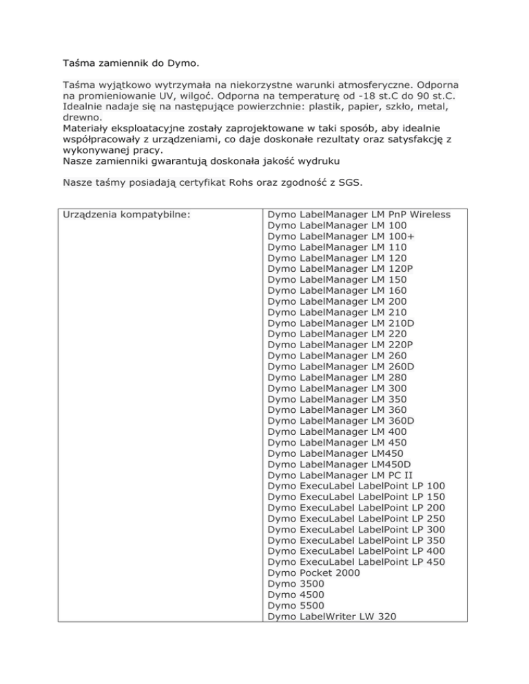 Taśma zamiennik do Dymo. Taśma wyjątkowo wytrzymała na niekorzystne warunki atmosferyczne. Odporna na promieniowanie UV, wilgoć. Odporna na temperaturę od -18 st.C do 90 st.C. Idealnie nadaje się na następujące powierzchnie: plastik, papier, szkło, metal, drewno. Materiały eksploatacyjne zostały zaprojektowane w taki sposób, aby idealnie współpracowały z urządzeniami, co daje doskonałe rezultaty oraz satysfakcję z wykonywanej pracy. Nasze zamienniki gwarantują doskonała jakość wydruku Nasze taśmy posiadają certyfikat Rohs oraz zgodność z SGS. Urządzenia kompatybilne: Dymo Dymo Dymo Dymo Dymo Dymo Dymo Dymo Dymo Dymo Dymo Dymo Dymo Dymo Dymo Dymo Dymo Dymo Dymo Dymo Dymo Dymo Dymo Dymo Dymo Dymo Dymo Dymo Dymo Dymo Dymo Dymo Dymo Dymo Dymo Dymo Dymo Dymo LabelManager LM PnP Wireless LabelManager LM 100 LabelManager LM 100+ LabelManager LM 110 LabelManager LM 120 LabelManager LM 120P LabelManager LM 150 LabelManager LM 160 LabelManager LM 200 LabelManager LM 210 LabelManager LM 210D LabelManager LM 220 LabelManager LM 220P LabelManager LM 260 LabelManager LM 260D LabelManager LM 280 LabelManager LM 300 LabelManager LM 350 LabelManager LM 360 LabelManager LM 360D LabelManager LM 400 LabelManager LM 450 LabelManager LM450 LabelManager LM450D LabelManager LM PC II ExecuLabel LabelPoint LP 100 ExecuLabel LabelPoint LP 150 ExecuLabel LabelPoint LP 200 ExecuLabel LabelPoint LP 250 ExecuLabel LabelPoint LP 300 ExecuLabel LabelPoint LP 350 ExecuLabel LabelPoint LP 400 ExecuLabel LabelPoint LP 450 Pocket 2000 3500 4500 5500 LabelWriter LW 320 Dymo Dymo Dymo Dymo Dymo Dymo Dymo Dymo Dymo Dymo Dymo Dymo Dymo Dymo Dymo LabelWriter LW 330 LabelWriter LW 400 LabelWriter LW 400 LabelWriter LW 400 LabelWriter LW 400 LabelWriter LW 450 LabelWriter LW 450 LabelWriter LW 450 LabelWriter LW 450 4 XL SE 450 RhinoPro ILP 219 Rhino 5000 Rhino 5200 RhinoPro 6000 Turbo Turbo Twin Turbo Duo Turbo Twin Turbo Duo