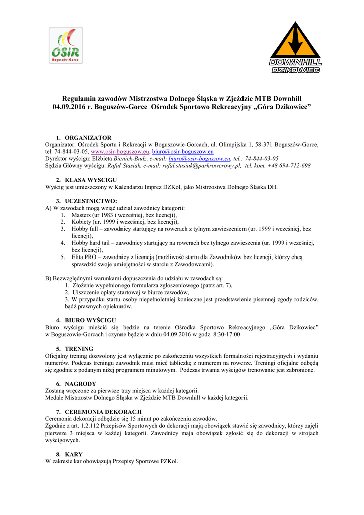 Regulamin zawodów Mistrzostwa Dolnego Śląska w Zjeździe MTB Downhill 04.09.2016 r. Boguszów-Gorce Ośrodek Sportowo Rekreacyjny „Góra Dzikowiec” 1. ORGANIZATOR Organizator: Ośrodek Sportu i Rekreacji w Boguszowie-Gorcach, ul. Olimpijska 1, 58-371 Boguszów-Gorce, tel. 74-844-03-05, www.osir-boguszow.eu, [email protected] Dyrektor wyścigu: Elżbieta Bieniek-Budz, e-mail: [email protected], tel.: 74-844-03-05 Sędzia Główny wyścigu: Rafał Stasiak, e-mail: [email protected], tel. kom. +48 694-712-698 2. KLASA WYSCIGU Wyścig jest umieszczony w Kalendarzu Imprez DZKol, jako Mistrzostwa Dolnego Śląska DH. 3. UCZESTNICTWO: A) W zawodach mogą wziąć udział zawodnicy kategorii: 1. Masters (ur 1983 i wcześniej, bez licencji), 2. Kobiety (ur. 1999 i wcześniej, bez licencji), 3. Hobby full – zawodnicy startujący na rowerach z tylnym zawieszeniem (ur. 1999 i wcześniej, bez licencji), 4. Hobby hard tail – zawodnicy startujący na rowerach bez tylnego zawieszenia (ur. 1999 i wcześniej, bez licencji), 5. Elita PRO – zawodnicy z licencją (możliwość startu dla Zawodników bez licencji, którzy chcą sprawdzić swoje umiejętności w starciu z Zawodowcami). B) Bezwzględnymi warunkami dopuszczenia do udziału w zawodach są: 1. Złożenie wypełnionego formularza zgłoszeniowego (patrz art. 7), 2. Uiszczenie opłaty startowej w biurze zawodów, 3. W przypadku startu osoby niepełnoletniej konieczne jest przedstawienie pisemnej zgody rodziców, bądź prawnych opiekunów. 4. BIURO WYŚCIGU Biuro wyścigu mieścić się będzie na terenie Ośrodka Sportowo Rekreacyjnego „Góra Dzikowiec” w Boguszowie-Gorcach i czynne będzie w dniu 04.09.2016 w godz. 8:30-17:00 5. TRENING Oficjalny trening dozwolony jest wyłącznie po zakończeniu wszystkich formalności rejestracyjnych i wydaniu numerów. Podczas treningu zawodnik musi mieć tabliczkę z numerem na rowerze. Treningi oficjalne odbędą się zgodnie z podanym niżej programem minutowym. Podczas trwania wyścigów trenowanie jest zabronione. 6. NAGRODY Zostaną wręczone za pierwsze trzy miejsca w każdej kategorii. Medale Mistrzostw Dolnego Śląska w Zjeździe MTB Downhill w każdej kategorii. 7. CEREMONIA DEKORACJI Ceremonia dekoracji odbędzie się 15 minut po zakończeniu zawodów. Zgodnie z art. 1.2.112 Przepisów Sportowych do dekoracji mają obowiązek stawić się zawodnicy, którzy zajęli pierwsze 3 miejsca w każdej kategorii. Zawodnicy maja obowiązek zgłosić się do dekoracji w strojach wyścigowych. 8. KARY W zakresie kar obowiązują Przepisy Sportowe PZKol. 9. PROGRAM MINUTOWY: 04.09.2016 Dzień zawodów: godz. 8.30 – 11.00 – zapisy zawodników godz. 8.30 – odprawa służb zabezpieczających godz. 9.00 – 11.00 – treningi godz. 11.30 – 1 przejazd – kolejność startów: Kobiety, Masters, Hobby hard tail , Hobby Full godz. 14.00 – 2 przejazd – kolejność startów grup j/w godz. 16.00 – 16.30 – dekoracja zwycięzców 10. ZASADY FINANSOWANIA Opłata startowa: 1. Opłata startowa zawodów wynosi: a) Wszystkie kategorie 60 zł b) Dla zapisanych przez internet do dnia 02.09.2016 opłata startowa 50zł (uiszczona w dniu zawodów w biurze) 2. Opłata upoważnia do korzystania z kolei linowej w dniu zawodów nieodpłatnie. 11. ZASADY BEZPIECZEŃSTWA Podczas zawodów stosowany będzie system chorągiewek: Zawodnik widzący powiewającą żółtą chorągiewkę ma obowiązek zatrzymać się lub wolno zjeżdżać w dół Zawodnik widzący powiewającą czerwona chorągiewkę ma obowiązek natychmiast zatrzymać się. Zatrzymani zawodnicy spokojnie, lecz bezzwłocznie muszą, udać się na linie mety i zgłosić się do sędziego mety. 12. OBOWIAZKOWE WYPOSAŻENIE Posiadanie odpowiedniego sprzętu: rower górski, co najmniej z przednim amortyzatorem i sprawnymi dwoma hamulcami, kask pełny zintegrowany (osłona na podbródek), oraz ochraniaczy: ochrona na kręgosłup („zbroja”), nałokietniki, nakolanniki, naramienniki, watowania ud, długie spodnie, koszula z długimi rękawami, pełne rękawiczki z palcami. 13. SKŁAD KOMISJI SĘDZIOWSKIEJ Sędziego głównego wyznacza Kolegium Sędziów DZKol. 14. KONTROLA ANTYDOPINGOWA Podczas zawodów obowiązują przepisy antydopingowe UCI i PZKol. 15. WYKAZ SZPITALI W POBLIŻU TRASY Specjalistyczny Szpital im. Stefana Batorego, 58-300 Wałbrzych, ul. Batorego 4, tel: 74-648-98-00 Szpital Specjalistyczny im. A. Sokołowskiego, 58-309 Wałbrzych, ul. Sokołowskiego 4, tel: 74-648-97-42 16. ZGŁOSZENIA: Zgłoszenia należy dokonywać drogą elektroniczną na stronie (informacja na stronie www.osir-boguszow.eu), do 02 Września 2016 do godziny 22: 00 lub bezpośrednio przed imprezą w biurze zawodów. 1. 2. 3. 4. 5. 6. 17. PRZEPISY KONCOWE Zawody zostaną przeprowadzone zgodnie z przepisami PZKol.- Bieg wstępny, który ustala kolejność startu w finale, gdzie zwycięża zawodnik z najlepszym czasem. Organizator nie ponosi odpowiedzialności za wypadki losowe zaistniałe podczas zawodów, dojazdu uczestników na zawody i powrotu z nich. Uczestnik startuje na własną odpowiedzialność (w przypadku zawodników niepełnoletnich na odpowiedzialność rodziców lub prawnych opiekunów). Organizator nie ponosi odpowiedzialności za ewentualne zaistniałe wypadki i kradzieże. Interpretacja niniejszego regulaminu należy do Sędziego Głównego w porozumieniu z przedstawicielem organizatorem zawodów. Zgłoszenie uczestnictwa w imprezie jest równoznaczne z akceptacją niniejszego regulaminu. Regulamin zatwierdzono dnia 27.07.2016 DZKol Wrocław – T. Daszkiewicz