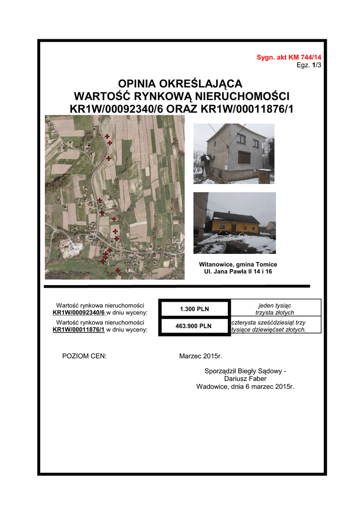 Sygn. akt KM 744/14 Egz. 1/3 OPINIA OKREŚLAJĄCA WARTOŚĆ RYNKOWĄ NIERUCHOMOŚCI KR1W/00092340/6 ORAZ KR1W/00011876/1 Witanowice, gmina Tomice Ul. Jana Pawła II 14 i 16 Wartość rynkowa nieruchomości KR1W/00092340/6 w dniu wyceny: 1.300 PLN Wartość rynkowa nieruchomości KR1W/00011876/1 w dniu wyceny: 463.900 PLN POZIOM CEN: jeden tysiąc trzysta złotych czterysta sześćdziesiąt trzy tysiące dziewięćset złotych. Marzec 2015r. Sporządził Biegły Sądowy Dariusz Faber Wadowice, dnia 6 marzec 2015r. 1 2 WYCIĄG Z OPINII1 Przedmiotem opinii są nieruchomości położone w miejscowości Witanowice, gmina Tomice, powiat wadowicki, objęte w Sądzie Rejonowym w Wadowicach księgami wieczystymi: KR1W/00092340/6 - działka nr 131/6 o pow. 694m2 oraz KR1W/00011876/1 - działki nr 107/9, 107/11, 107/18, 97/12, 107/13, 122/3, 123, 1973, 126/4, 107/31, 95/23, 95/21 o pow. łącznej 1,5988ha. Na działkach nr 122/3, 123, 1973, 126/4 znajduje się zabudowa mieszkalno- zagrodowa o numerze adresowym ul. Jana Pawła 14 i 16. Cel wyceny i zakres Celem wyceny jest określenie aktualnej wartości rynkowej wyceny przedmiotowej nieruchomości w postępowaniu egzekucyjnym prowadzonym przez Komornika Sądowego przy Sądzie Rejonowym w Wadowicach Mirosławę Wójcicka w sprawie KM 744/14. Zakres opracowania obejmuje prawo własności gruntu wraz z zabudową według stanu na dzień wyceny. OPIS BYDYNKU MIESZKALNEGO – ulica Jana Pawła II 16 Budynek mieszkalny jednorodzinny, wolnostojący, składający się z sutereny, parteru i piętra. Budynek murowany w technologii tradycyjnej około 1978r. Ponieważ budynek posiada dwie kondygnacje powtarzalne łączna powierzchnia użytkowa wynosi 158,81m2. Stan techniczno-użytkowy jest zadowalający. INNE ELEMENTY ZAGOSPODAROWANIA Budynek mieszkalny o numerze adresowym ulica Jana Pawła II 14. Budynek jednokondygnacyjny, nie podpiwniczony murowany z cegły w 1948r. Jest nie zamieszkały, wymaga generalnego remontu lub do rozbiórki. Orientacyjna powierzchnia użytkowa: 51,98m2. Drewniana stodoła na filarach betonowych. W części stodoły znajduje się garaż. Budynek bez instalacji. Stan techniczny średni. Ogrodzenie z siatki w złym stanie technicznym ZASTOSOWANE PODEJŚCIA I METODY: ⇒ Wartość rynkowa części zabudowanej nieruchomości Podejście porównawcze, metoda porównywania parami ⇒ Wartość rynkowa gruntu niezabudowanego: Podejście porównawcze, metoda korygowania ceny średniej ZESTAWIENIE WYNIKÓW WYCENY: Wartość rynkowa nieruchomości KR1W/00092340/6 w dniu wyceny: Wartość rynkowa nieruchomości KR1W/00011876/1 w dniu wyceny: 1.300 PLN 463.900 PLN jeden tysiąc trzysta złotych czterysta sześćdziesiąt trzy tysiące dziewięćset złotych. STAN NIERUCHOMOŚCI: 05-02-2015r. POZIOM CEN: Marzec 2015r. Sporządził Biegły Sądowy – Dariusz Faber Wadowice, dnia 6-03-2015r. 1 Podlega złożeniu w Powiatowym Ośrodku Dokumentacji Geodezyjno Kartograficznej w Wadowicach ZAWARTOŚĆ OPRACOWANIA 1. Dane formalno prawne…………………………….........………………….....……… 1.1 Przedmiot, zakres, cel wyceny 1.2 Zamawiający 1.3 Podstawy formalne 1.4 Podstawy formalno-prawne 1.5 Źródła danych merytorycznych 1.6 Daty 4 2. Dane o nieruchomości………………………......……………..…….……….....…… 2.1 Opis stanu prawnego 2.2 Opis nieruchomości 5 3. Część obliczeniowa................................................................................................ 3.1 Metodyka.......................................................................................................... 3.2 Określenie i analiza rynku nieruchomości ....................................................... 3.3 Obliczenie wartości rynkowej nieruchomości części zabudowanej nieruchomości……………………………………………………………………………. 3.4 Obliczenie wartości rynkowej jednostkowej gruntu bez prawa zabudowy – rolnego……………………………………………………………………………………. 3.5 Obliczenie wartości rynkowej jednostkowej gruntu z prawem zabudowy…….. 3.6 Łączna wartość rynkowa nieruchomości w dniu wyceny……………………….. 3.7 Łączna wartość rynkowa gruntu w obliczonej wartości rynkowej nieruchomości w dniu wyceny…………………………………………………………. 17 17 17 20 23 25 26 26 4. Raport z opinii ….…......………………………………………….............................. 28 4.1 Podsumowanie wyników wyceny 4.2 Klauzule 5. Załączniki…………....…………………........……………..……………..................... 29 1. DANE FORMALNO- PRAWNE 1.1. Przedmiot, zakres i cel wyceny Przedmiotem opinii są nieruchomości położone w miejscowości Witanowice, gmina Tomice, powiat wadowicki, objęte w Sądzie Rejonowym w Wadowicach księgami wieczystymi: • KR1W/00092340/6 - działka nr 131/6 o pow. 694m2 oraz • KR1W/00011876/1 - działki nr 107/9, 107/11, 107/18, 97/12, 107/13, 122/3, 123, 1973, 126/4, 107/31, 95/23, 95/21 o pow. łącznej 1ha59a88m2 Na działkach nr 122/3, 123, 1973, 126/4 o powierzchni łącznej 2259m 2 znajduje się zabudowa mieszkalno- zagrodowa o numerze adresowym ul. Jana Pawła 14 oraz Jana Pawła 16. Celem wyceny jest określenie aktualnej wartości rynkowej przedmiotowej nieruchomości w postępowaniu egzekucyjnym prowadzonym przez Komornika Sądowego przy Sądzie Rejonowym w Wadowicach Mirosławę Wójcicka w sprawie KM 744/14. Zakres opracowania obejmuje prawo własności gruntu wraz z zabudową według stanu na dzień wyceny. 1.2 Zamawiający Komornik Sądowy przy Sądzie Rejonowym w Wadowicach Mirosława Wójcicka 1.3 Podstawa formalna ⇒ Postanowienie o powołaniu biegłego z daty 04-12-2014r. 1.4 Podstawy formalno - prawne ⇒ Ustawa z 21 sierpnia 1997r O Gospodarce Nieruchomościami (Dz.U.115 poz. 741 z późniejszymi zmian