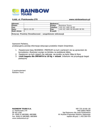 Łódź, ul. Piotrkowska 270 Adresat: Firma: Fax: Data: Ilość stron: 2013-10-29 1 www.rainbowtours.pl Nadawca: Firma: Rainbow Tours Telefon: +48 42/ 680 38 80 Fax: +48 42/ 680 38 89,680 38 90 E-mail: Dotyczy: Przeloty Dremlinerami – uzupełnienie informacji Szanowni Państwo, przekazujemy poniżej informacje dotyczące przelotów liniami Dreamliner. 1. Pasażerowie klasy BUSINESS i PREMIUM na tych czarterach nie są uprawnieni do korzystania z Business Lounge na lotnisku na podstawie biletu. 2. Pasażerom na tych rejsach nie naliczają się punkty na karty Miles & More 3. Limit bagażu dla INFANTA to 10 kg + wózek. Infantowi nie przysługuje bagaż podręczny Z pozdrowieniami Rainbow Tours RAINBOW TOURS S.A. ul. Piotrkowska 270 90-361 Łódź Ph. 0048 42 6803880, 6803888 Fax. 0048 42 6803889, 6803890 www.rainbowtours.pl NIP 725-18-68-136 KRS 0000178650 Sąd Rejonowy dla Łodzi-Śródmieścia XX Wydział Krajowego Rejestru Sądowego kapitał akcyjny: 1.455.200 PLN 1