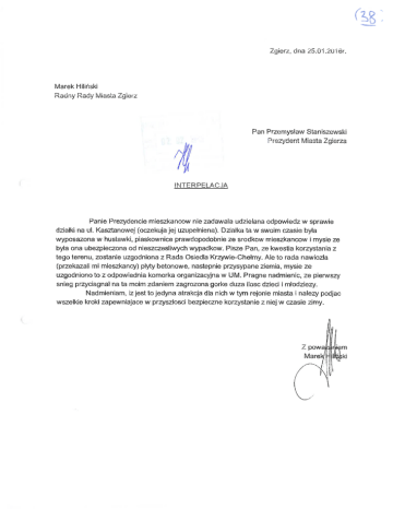 Zgierz, cina 25.01.2u16r. Marek Hiliński Radny Rady Miasta Zgierz . Pan Przemysław Staniszewski Prezydent Miasta Zgierza INTERPELACJA Panie Prezydencie mieszkańców nie zadawala udzielana odpowiedz w sprawie działki na ul. Kasztanowej (oczekują jej uzupełniena). Działka ta w swoim czasie była wyposażona w huśtawki, piaskownice prawdopodobnie ze środków mieszkańców i mysie ze była ona ubezpieczona od nieszczęśliwych wypadków. Pisze Pan, ze kwestia korzystania z tego terenu, zostanie uzgodniona z Rada Osiedla Krzywie-Chełmy. Ale to rada nawiozła (przekazali mi mieszkańcy) płyty betonowe, następnie przysypane ziemia, mysie ze uzgodniono to z odpowiednia komórka organizacyjna w UM. Pragnę nadmienić, ze pierwszy śnieg przyciągnął na ta moim zdaniem zagrożona gorke duza ilosc dzieci i młodzieży. Nadmieniam, iz jest to jedyna atrakcja dla nich w tym rejonie miasta i należy podjac wszelkie kroki zapewniające w przyszłości bezpieczne korzystanie z niej w czasie zimy.