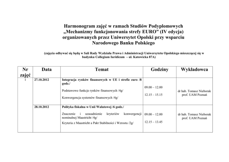 Harmonogram zajęć w ramach Studiów Podyplomowych „Mechanizmy funkcjonowania strefy EURO” (IV edycja) organizowanych przez Uniwersytet Opolski przy wsparciu Narodowego Banku Polskiego (zajęcia odbywać się będą w Sali Rady Wydziału Prawa i Administracji Uniwersytetu Opolskiego mieszczącej się w budynku Collegium Iuridicum – ul. Katowicka 87A) Nr zajęć 1 Data 27.10.2012 Temat Godziny Integracja rynków finansowych w UE i strefie euro /8 godz./ 09.00 – 12.00 Podstawowe funkcje rynków finansowych /4g/ 12.15 – 15.15 Konwergencja systemów finansowych /4g/ 28.10.2012 Wykładowca dr hab. Tomasz Nieborak prof. UAM Poznań Polityka fiskalna w Unii Walutowej /6 godz./ Znaczenie i uzasadnienie nominalnej Maastricht /4g/ kryteriów konwergencji 09.00 – 12.00 Kryteria z Maastricht a Pakt Stabilności i Wzrostu /2g/ 12.15 – 13.45 dr hab. Tomasz Nieborak prof. UAM Poznań 2 17.11.2012 Euro w roli waluty międzynarodowej /8 godz./ Warunki konieczne międzynarodowego /4g/ dla kreacji pieniądza 08.30 – 11.30 Funkcje pieniądza międzynarodowego /4g/ 18.11.2012 dr hab. Tomasz Nieborak prof. UAM Poznań 11.45 – 14.45 Zarys integracji gospodarczej i walutowej w Europie /4 godz./ Idea, cele i sekwencja integracji gospodarczej w Europie / 4g/ 09.00 – 12.00 dr hab. Stefan Marek Grochalski, prof. UO Międzynarodowe stosunki gospodarcze /4 godz./ Makroekonomiczne związki gospodarki krajowej z 12.15 – 15.15 gospodarką światową. Konkurencyjność gospodarki a międzynarodowe przepływy czynników wytwórczych 3 dr hab. Aleksandra Trzcielińska - Polus, prof. UO 01.12.2012 Międzynarodowe stosunki gospodarcze /8 godz./ Międzynarodowa integracja gospodarcza, Międzynarodowy 09.00 – 12.00 system walutowy, Międzynarodowe stosunki finansowe 12.15 – 15.15 02.12.2012 dr hab. Aleksandra Trzcielińska - Polus, prof. UO Zarys integracji gospodarczej i walutowej w Europie / 8 godz./ Procesy tworzenia Unii Walutowej w Europie /4 g/ 09.00 – 12.00 dr hab. Stefan Marek Grochalski, prof. UO Integracja jako globalizacji /2g/ proces wtórny względem procesów 12.15 – 15.15 Unia walutowa jako najważniejszy stopień integracji ekonomicznej /2g/ 15.12.2012 4 Polityka pieniężna w Unii Walutowej /8 godz./ Pojęcia, cele i instrumenty polityki pieniężnej /4g/ Rola i skuteczność współczesnej polityki pieniężnej /4g/ 16.12.2012 5 12.01.2013 09.00 – 12.00 dr Piotr Stanisławiszyn UO 12.15 – 15.15 Zagadnienia z makroekonomii oraz Międzynarodowych Stosunków Gospodarczych /4 godz./ Polityki fiskalne, Dysproporcje gospodarcze, 9.00 – 12.00 Zagadnienia z makroekonomii oraz Międzynarodowych 12.15 – 15.15 Stosunków Gospodarczych /4 godz./ Problemy makroekonomii i podstawowe wielkości makroekonomiczne, Pieniądz, system bankowy i polityka pieniężna, Polityka fiskalna, Dysproporcje gospodarcze dr Grzegorz Balawajder UO Budżet UE /8 godz./ Zasady tworzenia budżetu ogólnego UE /2g/ 09.00 – 10.30 Procedura uchwalania budżetu /4g/ Metody koordynacji polityki budżetowej w UE /2g/ 10.45 – 13.45 14.00 – 15.30 dr Piotr Stanisławiszyn UO 13.01.2013 Polityka fiskalna w Unii Walutowej/8 godz./ Rola zdyscyplinowanej i przewidywalnej polityki fiskalnej 09.00 – 12.00 w Unii Walutowej /4g/ Reguły w polityce fiskalnej UE /4g/ 6 26.01.2013 12.15 – 15.15 Teoretyczne podstawy integracji monetarnej /8 godz./ Tzw. „stara” i „nowa” TOOW – wprowadzenie do kryteriów 09.00 – 12.00 konwergencji nominalnej /4g/ 12.15 – 15.15 Endogeniczność kryteriów OOW /4g/ 27.01.2013 dr Piotr Stanisławiszyn UO dr Magdalena Stawicka UEWr Specyfikacja polskiej gospodarki a zdolność do czerpania korzyści i ekspozycji na koszty /8 godz./ Postęp w zakresie konwergencji nominalnej /2g/ 09.00 – 10.45 Dysparytet w zakresie konwergencji realnej /2g/ 11.00 – 12.30 Czynniki determinujące wybór scenariusza integracji /2g/ 12.45 – 14.15 dr Magdalena Stawicka UEWr Zaburzenia w międzynarodowym systemie finansowym a 14.30 – 16.00 przystąpienie do strefy euro /2g/ 7 09.02.2013 Polityka pieniężna w Unii Walutowej /5 godz./ Rola tzw. kotwicy makroekonomicznej /4g/ nominalnej w Polityka pieniężna EBC w perspektywie 10 lat funkcjonowania euro /1g/ polityce 09.00 – 12.00 12.15 – 13.00 dr Przemysław Malinowski UO 10.02.2013 Korzyści i zagrożenia wynikające z uczestnictwa w Unii Walutowej na gruncie teorii i doświadczeń strefy euro /8 godz./ Korzyści krótko i średniookresowe /4g/ 8 23.02.2013 Integracja rynków finansowych, wzrost handlu i inwestycji / 4g/ Korzyści i zagrożenia wynikające z uczestnictwa w Unii Walutowej na gruncie teorii i doświadczeń strefy euro /4 godz./ Czynniki determinujące skalę korzyści i kosztów oraz szans i zagrożeń /4g/ 09.00 – 12.00 dr Andrzej Michór UO 12.15 – 15.15 09.00 - 12.00 dr Andrzej Michór UO 12.15 – 15.15 dr Edyta RutkowskaTomaszewska UWr Porzucenie polityki pieniężnej /4g/ 09.00 – 12.00 Ryzyko boomu i przegrzania gospodarki /4g/ 12.15 – 15.15 dr Edyta RutkowskaTomaszewska UWr Koszty i zagrożenia wynikające z uczestnictwa w Unii Walutowej na gruncie teorii i doświadczeń strefy euro /4 godz./ Koszty dostosowań krótkookresowych (wymiana pieniądza, logistyki, efekty cenowe) /4g/ 24.02.2013 Koszty i zagrożenia wynikające z uczestnictwa w Unii Walutowej na gruncie teorii i doświadczeń strefy euro /8 godz./ 9 09.03.2013 Specyfikacja polskiej gospodarki a zdolność do czerpania korzyści i ekspozycji na koszty /4 godz./ Cechy strukturalne polskiej gospodarki /4g/ 09.00 – 12.00 dr Wioletta Turowska UEWr Przypadki Danii, Szwecji i Wielkiej Brytanii /2g/ 12.15 – 13.45 dr Joanna Ryszka UO Dylematy okresu przedakcesyjnego (optymalna policy mix, wymogi proceduralne, konieczność przejścia przez ERM II, etc.) /2g/ Perspektywy integracji walutowej w Europie /8 godz./ 14.00 – 15.30 Kryzys finansowy a funkcjonowanie strefy euro /4g/ 09.00 – 12.00 Zdolność nowych krajów członkowskich do integracji walu