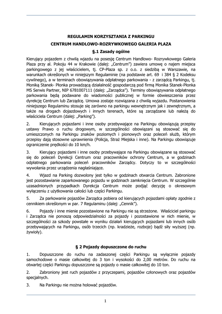 REGULAMIN KORZYSZTANIA Z PARKINGU CENTRUM HANDLOWO-ROZRYWKOWEGO GALERIA PLAZA §.1 Zasady ogólne Kierujący pojazdem z chwilą wjazdu na posesję Centrum Handlowo- Rozrywkowego Galeria Plaza przy al. Pokoju 44 w Krakowie (dalej: „Centrum”) zawiera umowę o najem miejsca parkingowego z jej właścicielem, tj. CP-Plaza sp. z o.o. z siedzibą w Warszawie, na warunkach określonych w niniejszym Regulaminie (na podstawie art. 69 i 384 § 2 Kodeksu cywilnego), a w terminach obowiązywania odpłatnego parkowania - z zarządcą Parkingu, tj. Moniką Stanek- Płonka prowadzącą działalność gospodarczą pod firmą Monika Stanek-Płonka MS Serwis Partner, NIP 6781007111 (dalej: „Zarządca”). Terminy obowiązywania odpłatnego parkowania będą podawane do wiadomości publicznej w formie obwieszczenia przez dyrekcję Centrum lub Zarządcę. Umowa zostaje rozwiązana z chwilą wyjazdu. Postanowienia niniejszego Regulaminu stosuje się zarówno na parkingu wewnętrznym jak i zewnętrznym, a także na drogach dojazdowych i innych terenach, które są zarządzane lub należą do właściciela Centrum (dalej: „Parking”). 2. Kierujących pojazdami i inne osoby przebywające na Parkingu obowiązują przepisy ustawy Prawo o ruchu drogowym, w szczególności obowiązani są stosować się do umieszczonych na Parkingu znaków poziomych i pionowych oraz poleceń służb, którym przepisy dają stosowne uprawnienia (Policja, Straż Miejska i inne). Na Parkingu obowiązuje ograniczenie prędkości do 10 km/h. 3. Kierujący pojazdami i inne osoby przebywające na Parkingu obowiązane są stosować się do poleceń Dyrekcji Centrum oraz pracowników ochrony Centrum, a w godzinach odpłatnego parkowania poleceń pracowników Zarządcy. Dotyczy to w szczególności wywołania przez urządzenia nagłaśniające. 4. Wjazd na Parking dozwolony jest tylko w godzinach otwarcia Centrum. Zabronione jest pozostawianie zaparkowanego pojazdu w godzinach zamknięcia Centrum. W szczególnie uzasadnionych przypadkach Dyrekcja Centrum może podjąć decyzję o okresowym wyłączeniu z użytkowania całości lub części Parkingu. 5. Za parkowanie pojazdów Zarządca pobiera od kierujących pojazdami opłaty zgodnie z cennikiem określonym w par. 7 Regulaminu (dalej: „Cennik”). 6. Pojazdy i inne mienie pozostawione na Parkingu nie są strzeżone. Właściciel parkingu i Zarządca nie ponoszą odpowiedzialności za pojazdy i pozostawione w nich mienie, w szczególności za szkody powstałe w wyniku działań kierujących pojazdami lub innych osób przebywających na Parkingu, osób trzecich (np. kradzieże, rozboje) bądź siły wyższej (np. żywioły). § 2 Pojazdy dopuszczone do ruchu 1. Dopuszczone do ruchu na zadaszonej części Parkingu są wyłącznie pojazdy samochodowe o masie całkowitej do 3 ton i wysokości do 2,00 metrów. Do ruchu na otwartej części Parkingu dopuszczone są pojazdy o masie całkowitej do 10 ton. 2. Zabroniony jest ruch pojazdów z przyczepami, pojazdów członowych oraz pojazdów specjalnych. 3. Na Parkingu nie można holować pojazdów. 1 4. Zabroniony jest ruch pojazdów przewożących materiały łatwopalne, żrące lub wybuchowe. 5. Zabroniony jest wjazd pojazdów z nieszczelnościami powodującymi wyciek substancji niebezpiecznych (np. paliwa) lub brudzących. § 3 Sposób uiszczania opłat za parkowanie Wjazd na Parking w terminie obowiązywania odpłatnego parkowania możliwy jest po uiszczeniu przez kierującego kaucji w wysokości odpowiadającej opłacie określonej w Cenniku. Terminy obowiązywania odpłatnego parkowania będą podawane do wiadomości publicznej w formie obwieszczenia przez dyrekcję Centrum lub Zarządcę. 1. Kaucję uiszcza się w gotówce pracownikom Zarządcy przy wjeździe na Parking. Ewentualny zwrot kaucji następuje przy wyjeździe z Parkingu. Warunki i zasady ewentualnego zwolnienia od opłaty za parkowanie (zwrot kaucji) określa Cennik. Zapisów dotyczących opłat za parkowanie nie stosuje się do pojazdów uprzywilejowanych. § 4 Sposób parkowania 1. Parkowanie pojazdów dozwolone jest tylko na wyznaczonych miejscach. W szczególności zabronione jest parkowanie na miejscach oznaczonych zakazem parkowania, na przejściach dla pieszych oraz drodze pożarowej. 2. W przypadku braku wolnych miejsc parkingowych kierujący pojazdem obowiązany jest niezwłocznie opuścić Parking. 3. W czasie wykonywania manewrów parkowania kierujący pojazdem powinien uważać na pojazdy sąsiednie. Dozwolone jest parkowanie wyłącznie w granicach wyznaczonych liniami, bez zastawiania linii. Pojazd należy pozostawiać unieruchomiony, z wyłączonym zapłonem i bez świateł. 4. Na jednym miejscu parkingowym wyznaczonym dla samochodów osobowych dozwolone jest parkowanie nie więcej niż dwóch motocykli. 5. Korzystanie z miejsc parkingowych przeznaczonych dla osób niepełnosprawnych dopuszczalne jest tylko w przypadku przewożenia osoby niepełnosprawnej lub posiadania przez kierującego pojazdem stosownej karty, po uprzednim umieszczeniu jej w widocznym miejscu za przednią szybą pojazdu. 6. Korzystanie z miejsc parkingowych przeznaczonych dla rodzin z dziećmi dopuszczalne jest tylko w przypadku przewożenia dziecka w przeznaczonym dla dzieci foteliku samochodowym lub kobiety ciężarnej, bądź gdy kierującym jest kobieta ciężarna. 7. Parkowanie busów i autobusów dozwolone jest wyłącznie na wydzielonej części Parkingu. 8. Kontrola w zakresie prawidłowości parkowania pojazdów należy do dyrekcji Centrum i pracowników ochrony Centrum, a w terminach obowiązywania odpłatnego parkowania również do pracowników Zarządcy. W sprawach niejasnych dotyczących zasad korzystania z Parkingu należy kontaktować się z Dyrekcją Centrum lub pracownikami ochrony Centrum, a terminach obowiązywania odpłatnego parkowania z Zarządcą. 2 § 4 Reguły porządkowe 1. Na Parkingu obowiązują wszystkie postanowienia porządkowe Regulaminu dla Klientów 