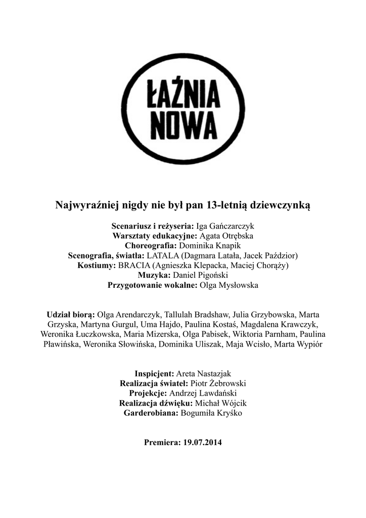 ! ! ! Najwyraźniej nigdy nie był pan 13-letnią dziewczynką ! Scenariusz i reżyseria: Iga Gańczarczyk Warsztaty edukacyjne: Agata Otrębska Choreografia: Dominika Knapik Scenografia, światła: LATALA (Dagmara Latała, Jacek Paździor) Kostiumy: BRACIA (Agnieszka Klepacka, Maciej Chorąży) Muzyka: Daniel Pigoński Przygotowanie wokalne: Olga Mysłowska ! ! Udział biorą: Olga Arendarczyk, Tallulah Bradshaw, Julia Grzybowska, Marta Grzyska, Martyna Gurgul, Uma Hajdo, Paulina Kostaś, Magdalena Krawczyk, Weronika Łuczkowska, Maria Mizerska, Olga Pabisek, Wiktoria Parnham, Paulina Pławińska, Weronika Słowińska, Dominika Uliszak, Maja Wcisło, Marta Wypiór ! ! Inspicjent: Areta Nastazjak Realizacja świateł: Piotr Żebrowski Projekcje: Andrzej Lawdański Realizacja dźwięku: Michał Wójcik Garderobiana: Bogumiła Kryśko ! ! Premiera: 19.07.2014 ! ! ! ! O czym marzą nastoletnie dziewczynki? Jakie mają pragnienia? Kim są? Kim chcą być? Czego potrzebują, by twórczo się rozwijać, realizować własne marzenia i pasje? ! „Najwyraźniej nigdy nie był pan 13-letnią dziewczynką” – najnowszy projekt artystyczno-społeczny Igi Gańczarczyk jest próbą oddania głosu dziewczynkom i stworzenia możliwości opowiedzenia o sobie i o otaczającym świecie z ich własnej perspektywy. Scenariusz spektaklu w znacznej mierze opiera się o improwizacje i opowieści młodych uczestniczek projektu. To fascynująca podróż przez różne dziewczęce narracje (pamiętniki, złote-myśli, zeszyty typu „wpisz-się”), którym towarzyszą niewerbalne próby wyrażenia własnych odczuć i emocji (taniec, cielesność). Wyłania się z nich wielobarwny obraz świata, urzekający szczerością i odwagą dziewczęcych wyznań. ! Historie dziewczynek bawią, angażują i skłaniają do refleksji - zarówno dzieci jak i dorosłych. Najmłodsi znajdują w nich odbicie swojego codziennego życia i problemów, ich rodzice - zrozumienie dla zachowań i małych dramatów, które wydawały się im wcześniej prozaiczne. Pełne energii młode uczestniczki projektu wcielają się w różne postaci i płynnie przechodzą między przedstawianiem osobistego doświadczenia a jego fikcyjnym, paralelnym odbiciem. Minimalistyczna scenografia i oszczędne światła tworzą poczucie znajdowania się w onirycznej przestrzeni. Zresztą już samo podglądanie tego małego świata, poprzez swoją obcość, jest trochę jak balansowanie na granicy snu i rzeczywistości. ! Ogromny sukces przedstawienia poświadcza m.in fakt otrzymania przez twórców Marki Radia Kraków. ! Spektakl wchodził w skład projektu „Lato w Teatrze” realizowanego przez Instytut Teatralny im. Zbigniewa Raszewskiego ze środków Ministerstwa Kultury i Dziedzictwa Narodowego. ! ! fot. Bartosz Siedlik Z recenzji przedstawienia: ! „We wtorek 10 czerwca grupa 17 uczennic zaginęła bez śladu" - niedługo później odnalazły się w krakowskiej Łaźni Nowej, gdzie z Igą Gańczarczyk stworzyły w ramach akcji Lato w Teatrze spektakl inspirowany twórczością Virginii Woolf i własnymi przeżyciami. Artyści oddali głos pokoleniu, którego zwykle w teatrze nie słuchamy. Okazało się, że dzieci mają nam do powiedzenia rzeczy ważne i poruszające - o sobie, relacjach z innymi. "Najwyraźniej nigdy nie był pan 13-letnią dziewczynką" to piękny, wspaniale zagrany i mądry spektakl. Michał Centkowski, Newsweek ! Zaczepny tytuł - "Najwyraźniej nigdy nie był pan 13-letnią dziewczynką" - mówi, że będziemy mieć do czynienia ze światem trudno dostępnym, płynnym, ulotnym, rządzącym się własnymi prawami. Panowie nie mogli być 13-letnimi dziewczynkami, panie owszem były - ale czy po latach pamięta się jeszcze ten czas wychodzenia z dzieciństwa, jego rytuały, lęki, zabawy? Spektakl w Łaźni, który powstał we współpracy z nastoletnimi aktorkami, daje widzom możliwość zajrzenia do tego świata. (...) Dziewczynki są bojowe: nie podoba się im to, że czegoś nie wypada, że uważane bywają za gorsze od chłopców. Chłopcy są zresztą traktowani przez nie jak osobne, obce plemię, choć obserwowane z ciekawością. Dziewczynki bywają bezwzględne także dla siebie, co najlepiej widać w scenie imitującej telewizyjne talkshow, w której ze złośliwą przesadą rozprawiają o słitfociach, hejtowaniu na Facebooku, odchudzaniu się i połykaniu tasiemca. Niewątpliwie trudno być 13-letnią dziewczynką, ale przedstawienie o tym traktujące ogląda się świetnie. ! ! ! Joanna Targoń, Gazeta Wyborcza Kraków Gańczarczyk udało się zachować pewną dwutorowość narracji – z jednej strony konsekwentnie prowadzi temat nierównego traktowania dziewczyn i chłopców przez dorosłych i wtłaczanie ich w stereotypowe role, z drugiej pozwoliła na opowiedzenie „po swojemu”, jak wygląda ich codzienność. ! ! Marta Bryś, Dwutygodnik.com !