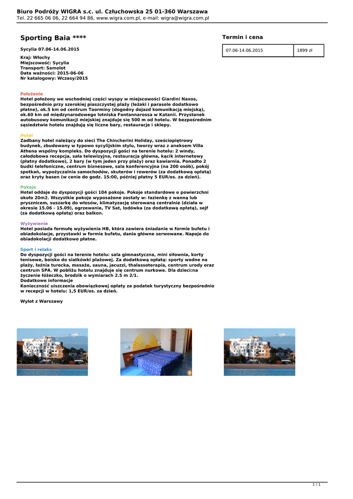 Biuro Podróży WIGRA s.c. ul. Człuchowska 25 01-360 Warszawa Tel. 22 665 06 06, 22 664 94 86, www.wigra.com.pl, e-mail: [email protected] Sporting Baia **** Sycylia 07.06-14.06.2015 Termin i cena 07.06-14.06.2015 1899 zł Kraj: Włochy Miejscowość: Sycylia Transport: Samolot Data ważności: 2015-06-06 Nr katalogowy: Wczasy/2015 Położenie Hotel położony we wschodniej części wyspy w miejscowości Giardini Naxos, bezpośrednio przy szerokiej piaszczystej plaży (leżaki i parasole dodatkowo płatne), ok.5 km od centrum Taorminy (dogodny dojazd komunikacją miejską), ok.60 km od międzynarodowego lotniska Fontannarossa w Katanii. Przystanek autobusowy komunikacji miejskiej znajduje się 500 m od hotelu. W bezpośrednim sąsiedztwie hotelu znajdują się liczne bary, restauracje i sklepy. Hotel Zadbany hotel należący do sieci The Chincherini Holiday, sześciopiętrowy budynek, zbudowany w typowo sycylijskim stylu, tworzy wraz z aneksem Villa Athena wspólny kompleks. Do dyspozycji gości na terenie hotelu: 2 windy, całodobowa recepcja, sala telewizyjna, restauracja główna, kącik internetowy (płatny dodatkowo), 2 bary (w tym jeden przy plaży) oraz kawiarnia. Ponadto 2 budki telefoniczne, centrum biznesowe, sala konferencyjna (na 200 osób), pokój spotkań, wypożyczalnia samochodów, skuterów i rowerów (za dodatkową opłatą) oraz kryty basen (w cenie do godz. 15:00, później płatny 5 EUR/os. za dzień). Pokoje Hotel oddaje do dyspozycji gości 104 pokoje. Pokoje standardowe o powierzchni około 20m2. Wszystkie pokoje wyposażone zostały w: łazienkę z wanną lub prysznicem, suszarkę do włosów, klimatyzację sterowaną centralnie (działa w okresie 15.06 - 15.09), ogrzewanie, TV Sat, lodówka (za dodatkową opłatą), sejf (za dodatkową opłatą) oraz balkon. Wyżywienie Hotel posiada formułę wyżywienia HB, która zawiera śniadanie w formie bufetu i obiadokolacje, przystawki w formie bufetu, dania główne serwowane. Napoje do obiadokolacji dodatkowo płatne. Sport i relaks Do dyspozycji gości na terenie hotelu: sala gimnastyczna, mini siłownia, korty tenisowe, boisko do siatkówki plażowej. Za dodatkową opłatą: sporty wodne na plaży, łaźnia turecka, masaże, sauna, jacuzzi, thalassoterapia, centrum urody oraz centrum SPA. W pobliżu hotelu znajduje się centrum nurkowe. Dla dzieci:na życzenie łóżeczko, brodzik o wymiarach 2.5 m 2/1. Dodatkowe informacje Konieczność uiszczenia obowiązkowej opłaty za podatek turystyczny bezpośrednio w recepcji w hotelu: 1,5 EUR/os. za dzień. Wylot z Warszawy 1/1 Powered by TCPDF (www.tcpdf.org)