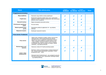 Nazwa Program Opis zakresu pracy MINIMUM Program Program NA SWOIM POD KLUCZ Opcja Przygotowanie do budowy Mapa projektowa Projekt domu Kierownik budowy Prowizoryczne ogrodzenie działki Badania geotechniczne gruntu Wytyczenie budynku Wykonanie mapy działki do celów projektowych Dostarczenie gotowego projektu domu wraz z wykonaniem adaptacji do działki w zakresie podstawowym (bez dokonywania istotnych zmian w projekcie) Objęcie obowiązków kierownika budowy Na czas budowy Sprawdzenie podłoża do głębokości 3m - wg odrębnej kalkulacji Geodezyjne wytyczenie budynku Prace ziemne, Fundament Prace ziemne Warstwa betonu pod ławicami Ławice i stopy fundamentowe Zdjęcie ziemi urodzajnej na odkład, wykopy w gruncie pod wykonanie ławic i ścian fundamentowych (po obrysie zewnętrznym ławic) na głębokość posadowienia budynku 100cm, zasypanie fundamentu gruntem rodzimym wraz z zagęszczeniem, obsypanie budynku ziemią urodzajną. W przypadku braku ziemi do zasypu lub obsypu materiał dowieziony - wg odrębnej kalkulacji Wykonana z betonu B-15 (jeśli przewiduje projekt) Wylewane z betonu konstrukcyjnego w wykopie izolowanym folią , zbrojone prętami żebrowanymi wg projektu. Poziom posadowienia ławic - 100cm Dekowanie ławic fundamentowych - przy wystąpieniu gorszych warunków gruntowych wraz z wykonaniem szerszego wykopu - wg odrębnej kalkulacji [email protected] Tel/Fax: (32) 753-27-24 509 428 777, 509 719 198 1 Nazwa Program Opis zakresu pracy MINIMUM Program Program NA SWOIM POD KLUCZ Opcja Prace ziemne, Fundament cd. Izolacja pozioma ławic Warstwa papy izolacyjnej pod ścianą fundamentową Ściany fundamentowe Ściany wykonane z bloczków szaluknowych wypełnianych betonem konstrukcyjnym na budowie (grubość wg projektu) lub wykonane z bloczków betonowych murowanych na zaprawie Izolacja termiczna ścian fundamentowych Izolacja pionowa ścian fundamentowych Kanalizacja Płyta z betonu na poziomie fundamentu Na ścianie fundamentowej z zewnątrz styropian gr. 10cm 2x emulsja bitumiczna, na styropianie z zewnątrz folia kubełkowa Rozprowadzenie rur PCV do poziomu fundamentu wg projektu Wykonana z betonu wg projektu, zbrojona siatką z drutu Fi 3mm Konstrukcja budynku Izolacja pod ścianami parteru Ściany nośne zewnętrzne i wewnętrzne Warstwa papy asfaltowej lub folii fundamentowej Beton komórkowy gr. 24cm układany na cienkowarstwowej zaprawie klejowej lub Porotherm Dryfix 25cm P+W Ścianki działowe Ścianki działowe z betonu komórkowego układane na cienkowarstwowej zaprawie klejowej gr. 11,5cm - 12cm Słupy żelbetowe Wykonane z betonu konstrukcyjnego Strop nad parterem Wieniec na ścianach kolankowych Na poziomie parteru Strop wg projektu - gęstożebrowy lub żelbetowy monolityczny Wieniec i rdzenie żelbetowe na ścianach kolankowych z betonu konstrukcyjnego zbrojone prętami stalowymi - wg projektu [email protected] Tel/Fax: (32) 753-27-24 509 428 777, 509 719 198 2 Nazwa Program Opis zakresu pracy MINIMUM Program Program NA SWOIM POD KLUCZ Opcja Konstrukcja parteru cd. Schody wewnętrzne Zbrojone, wykonane z betonu konstrukcyjnego wg projektu Drewniane, malowane wg odrębnej kalkulacji Kominy Kominy spalinowe i wentylacyjne systemowe wg projektu Dach budynku Więźba dachowa Więźba dachowa drewniana zabezpieczona odpowiednim impregnatem przeciw korozji biologicznej Przygotowanie do krycia Folia o wysokiej paroprzepuszczalności mocowana wraz z drewnianymi łatami i kontrłatami Dachówka cementowa (podstawowa, boczna) z akcesoriami (gąsiory, trójniki). Obróbki blacharskie z blachy powlekanej w kolorze Pokrycie dachowe Rynny Blacha dachówkowa w kolorze, obróbki blacharskie z blachy powlekanej w kolorze Pokrycie dachu dachówką ceramiczną, gontem bitumicznym , blachą płaską lub inne - wg odrębnej kalkulacji Rynny w kolorze zbliżonym do koloru dachówki z PCV wraz z rurami spustowymi Okna i wyłazy dachowe Okna dachowe w rozmiarach wg projektu z nawiewnikami, energooszczędne. W łazienkach z tworzywa PCV odporne na działanie wilgoci. Wyłazy dachowe z szybą hartowaną Wykończenie kominów ponad dachem Kominy ocieplone styropianem EPS Fasada o gr. 5cm, wykończone tynkiem strukturalnym pod kolor dachu Komunikacja dachowa Stopnie kominiarskie, ławki kominiarskie przy kominach Zabezpieczenie przed śniegiem Drabinki przeciwśniegowe, śniegołapy - wg odrębnej kalkulacji [email protected] Tel/Fax: (32) 753-27-24 509 428 777, 509 719 198 3 Nazwa Program Opis zakresu pracy MINIMUM Program Program NA SWOIM POD KLUCZ Opcja Stolarka zewnętrzna Okna Okna PCV 6 lub 7 komorowe jednostronnie lub dwustronnie powlekane w kolorze, szyby energooszczędne o współczynniku U=0,7 W/m2K Okna PCV 5 lub 6 komorowe w kolorze białym, szyby standardowe o współczynniku U=1,0 W/m2K Drzwi zewnętrzne Drzwi metalowe, ocieplane powlekane w kolorze standardowym wraz z ościeżnicą Drzwi zewnętrzne drewniane lub inne -wg odrębnej kalkulacji Brama garażowa, napęd do bramy Brama segmentowa w kolorze standardowym lub biała bez napędu (przetłoczenie poziome) Napęd do bramy garażowej - wg odrębnej kalkulacji Instalacje wewnętrzne Przewody o przekrojach 1,5mm2 oraz 2,5mm2, tablica rozdzielcza wraz z bezpiecznikami podstawowymi, zabezpieczenie wyłącznikami różnicowo-prądowymi (2szt) Instalacja elektryczna telewizyjna, internet Instalacja alarmowa Wykonanie podstawowej instalacji TV oraz Internet Na poziomie parteru Rozprowadzenie instalacji alarmowej - wg odrębnej kalkulacji Instalacja systemu "Dom inteligentny" Instalacja wodna Instalacja kanalizacyjna Rozprowadzenie okablowania po budynku - wg odrębnej kalkulacji Rury zgrzewane typu PP zakończone korkami do prób szczelności Rury typu PCV wg projektu [email protected] Tel/Fax: (32) 753-27-24 509 428 777, 509 719 198 4 Nazwa Program Opis zakresu pracy MINIMUM Program Program NA SWOIM POD KLUCZ Opcja Instalacje wewnętrzne cd. Rozprowadzenie rur do grzejników. Rury Pex/Al./Pex zakończone zaworami do