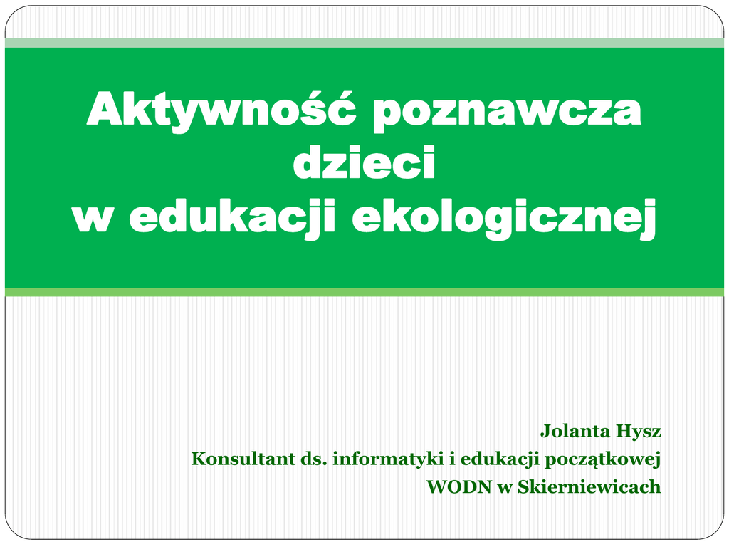 Aktywność poznawcza dzieci w edukacji ekologicznej Jolanta Hysz Konsultant ds. informatyki i edukacji początkowej WODN w Skierniewicach Analiza podstawy programowej wychowania przedszkolnego pod kątem edukacji przyrodniczej Aby osiągnąć cele wychowania przedszkolnego, należy wspomagać rozwój, wychowywać i kształcić dzieci następujących obszarach: 12. Wychowanie dla poszanowania roślin i zwierząt. Dziecko kończące wychowanie przedszkolne i rozpoczynające naukę w szkole podstawowej: 1) nazywa oraz wyróżnia rośliny i zwierzęta żyjące w różnych środowiskach przyrodniczych, np. na polu, na łące, w lesie; 2) wie, jakie warunki są potrzebne do rozwoju zwierząt (przestrzeń życiowa, bezpieczeństwo, pokarm) i wzrostu roślin (światło, temperatura, wilgotność); 3) potrafi wymienić zmiany zachodzące w życiu roślin i zwierząt w kolejnych porach roku; wie, w jaki sposób człowiek może je chronić i pomóc im, np. przetrwać zimę. Zalecane warunki i sposób realizacji. W trosce o prawidłowy rozwój psychoruchowy oraz przebieg wychowania i kształcenia dzieci w wieku przedszkolnym zaleca się następujące proporcje zagospodarowania czasu przebywania w przedszkolu oraz innej formie wychowania przedszkolnego, w rozliczeniu tygodniowym: 1. … 2. co najmniej jedną piątą czasu (w przypadku młodszych dzieci – jedną czwartą czasu) dzieci spędzają w ogrodzie przedszkolnym, na boisku, w parku itp. (organizowane są tam gry i zabawy ruchowe, zajęcia sportowe, obserwacje przyrodnicze, prace gospodarcze, porządkowe i ogrodnicze itd.); Aktywność poznawcza W kształtowaniu procesu poznawania S. Szuman wydzielił 4 etapy: 1. Zetknięcie się z danym zjawiskiem czy przedmiotem sensorycznie i motorycznie 2. Poznanie nazwy 3. Uzyskanie pewnego zasobu wiedzy 4. Porównanie obiektów poznania i klasyfikowanie ich oraz określanie pojęciowe przez definicje Na rozwój aktywności poznawczej dzieci wpływa również, zdaniem psychologów, odpowiedni dobór obiektów do obserwacji oraz zadania, w których dominować będą elementy porównywania i klasyfikowania. Główne operacje myślowe Główne operacje myślowe, leżące u podstaw biologicznego poznawania, to: Analiza Synteza Porównywanie Uogólnianie Klasyfikowanie Konkretyzacja Edukacja środowiskowa jako dialog Edukacja środowiskowa powinna koniecznie być dialogiem, który zachodzi w trzech wymiarach: Dialog dziecka z przyrodą Dialog dziecka z nauczycielem i innymi dziećmi Dialog (spotkanie) dziecka ze słowem pięknym opisującym piękno przyrody Metodyczne aspekty dialogowania z przyrodą Dialog z przyrodą dzieci nawiązują poprzez: Spotkanie z przyrodą Obserwowanie jej Badanie i eksperymentowanie Przez twórcze działanie chroniące przyrodę Sytuacje, które pozwalają dzieciom zadawać pytania i uzyskiwać odpowiedzi na nie Nauczyciel powinien zapewnić dzieciom: Bezpośrednie Wielozmysłowe (jeśli to możliwe) poznawanie i przeżywanie środowiska Metoda spotkania i medytacji z przyrodą W przypadku roślin: Na wycieczce dzieci stają w półkolu naprzeciw konkretnej rośliny i zastanawiają się co by ona (np. stara wiekowa lipa) im powiedziała, gdyby umiała mówić. Obserwują zewnętrzne cechy tej rośliny, m.in. kształt i kolor liści (czy nie usychają, czy nie mają brązowych plam) i zastanawiają się, o czym świadczą te cechy, czyli odczytują biologiczny język rośliny. W przypadku zwierząt: Oprócz cechy wyglądu znaczenia ma cała mowa, czyli określone zachowanie zwierzęcia w danej chwili, jego reakcje na bodźce środowiskowe, jego etologia. Dzieci wczuwają się w jego sytuację, próbują wymienić i zrozumieć jego potrzeby oraz oczekiwania wobec nich. Ważne jest jednak, aby nie postrzegały roślin czy zwierząt niewłaściwie, przypisując im cechy ludzkie, antropomorfizują je. Każde zwierzę ma np. porę odpoczynku i porę aktywności, ale ta ostatnia u większości przypada na wczesny poranek i późne popołudnie. Aktywność i zachowania zwierząt są uwarunkowane hormonami i są instynktowne, dopiero potem wyuczone. Nie można też przypisywać zwierzętom emocji, jakie są właściwe ludziom. Dzieci, wczuwając się w konkretną sytuację rośliny czy zwierzęcia, nabywają wrażliwość, rozwijają empatię wobec nich – niezbędny element świadomości ekologicznej. Dialog dziecka z nauczycielem i innymi dziećmi Dialog dziecka z przyrodą powinien być wspomagany przez dialog osobowy z nauczycielem pomiędzy dzieckiem a nauczycielem. Dziecko/uczeń doświadczające wrażliwości nauczyciela otwiera się na świat wartości i rozwija w sobie podobną wrażliwość. Dialog nauczyciela z dziećmi/uczniami wymaga: Odpowiednich metod pracy – atrakcyjnych, aktywizujących Uczenia myślenia problemowego Dialog – spotkanie – dziecka ze słowem pięknym opisującym piękno przyrody Edukacja ekologiczna powinna być też spotkaniem ze słowem opisującym piękno przyrody. Jest to pośrednia forma dialogowania z przyrodą. Literatura bardziej uwrażliwia, sięga w głąb, odkrywa to, co jest ukryte gdzieś głęboko, czyni wrażliwym na piękno, harmonię, ciszę lub dynamikę przyrody, jej zmienność i różnorodność, jak również wskazuje na potrzebę ochrony tych wartości. Pośrednie spotkanie z przyrodą, przekazuje czytelnikowi doświadczenia obcowania z nią autora, który nie tylko opanował umiejętność prowadzenia dialogu, lecz również umie o tym opowiadać. Zabawy dydaktyczne wg Z. Bogdanowicz Dla dzieci 3-letnich: Karmimy zwierzęta – przyporządkowanie wybranych rodzajów pokarmów dla przedstawionych zwierząt Nasze zwierzęta – nazywanie zwierząt domowych i poznawanie pomieszczeń, w których przebywają Stań przy takim samym kwiatku – odnajdywanie określonego kwiatu w ogrodzie Dla dzieci 4-letnich: Warzywa do garnka – rozpoznawanie dotykiem kształtu warzyw Dobieramy liście – rozpoznawanie kształtu liści Dla dzieci