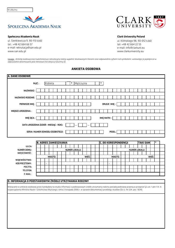Nr albumu: Społeczna Akademia Nauk ul. Sienkiewicza 9, 90-113 Łódź tel.: +48 42 664 66 57 e-mail: [email protected] www.san.edu.pl Clark University Poland ul. Kilińskiego 98, 90-012 Łódź tel: +48 42 664 22 55 e-mail: [email protected] www.clarkuniversity.eu Uwaga: Ankietę osobową oraz kwestionariusz rekrutacyjny należy wypełnić drukowanymi literami oraz odpowiednio cyframi lub symbolami, wstawiając je pojedynczo w odpowiednie obramowane pola tekstowe (nie dotyczy kolumny D). ANKIETA OSOBOWA A. DANE OSOBOWE PŁEĆ : Kobieta * Mężczyzna * NAZWISKO : NAZWISKO RODOWE: PIERWSZE IMIĘ : DRUGIE IMIĘ : MIEJSCE URODZENIA : IMIĘ OJCA : IMIĘ MATKI : DATA URODZENIA (DZIEŃ - MIESIĄC - ROK): SERIA I NUMER DOWODU OSOBISTEGO: PESEL: B. ADRES ZAMIESZKANIA C. DO KORESPONDENCJI TAKI SAM * ULICA: NUMER DOMU: MIEJSCOWOŚĆ: NUMER LOKALU: NUMER LOKALU: MIASTO: MIASTO: WIEŚ: WIEŚ: WOJEWÓDZTWO: KOD POCZTOWY: - - POCZTA: TELEFON: E-MAIL: D. INFORMACJA O PODSTAWOWYM ŹRÓDLE UTRZYMANIA RODZINY Wskazanie w ankiecie osobowej przez kandydata na studia informacji o podstawowym źródle utrzymania rodziny posiada podstawę prawną w przepisie §2 ust. 1 pkt 1 lit. b rozporządzenia Ministra Nauki i Szkolnictwa Wyższego z dnia 2 listopada 2006 r. w sprawie dokumentacji przebiegu studiów (Dz.U. Nr 224, poz. 1634). KWESTIONARIUSZ REKRUTACYJNY E. WYBÓR PROGRAMU STUDIÓW Studenci, oprócz realizacji studiów II stopnia na wybranym kierunku w Społecznej Akademii Nauk, dodatkowo 1. Studia Master + biorą udział w kształceniu umożliwiającym otrzymanie dyplomu Clark University Magister Zarządzanie - specjalizacja Business Management * (24 miesiące) Filologia Angielska - specjalizacja Business Communication * Uczestnicy programów podyplomowych otrzymują świadectwo ukończenia studiów podyplomowych Społecznej Akademii Nauk oraz dyplom Clark University Master of Science in Professional Communication * * * * * Management 2. Studia Master Marketing (24, 18 lub 12 miesięcy) Information Systems Health Systems Human Resources 3. Studia MBA(SAN)+Master (24 miesiące, 18 miesięcy) 4. Studia MBA dla Absolwentów Clark University (12 miesięcy) 4. Tryb 5. Oddział Uczestnicy programów MBA otrzymują dyplom MBA Społecznej Akademii Nauk, świadectwo ukończenia studiów podyplomowych MBA oraz dyplom Clark University Master of Science in Professional Communication Managerial Communication * Marketing Communication * Information Systems * Health Management * * HR Management Uczestnicy otrzymują dyplom MBA Społecznej Akademii Nauk, świadectwo ukończenia studiów podyplomowych MBA Managerial Communication * Marketing Communication * Information Systems * Health Management * HR Management * 24 miesiące * 18 miesięcy * 12 miesięcy * Łódź * Warszawa * F. KOMPETENCJE JĘZYKOWE 1. Wybrany tryb językowy Całość w języku angielskim 2. Posiadane certyfikaty z języka angielskiego: TOEFL iBT (min 90 punktów) IELTS (minimum poziom szósty) TOEIC (minimum 785 punktów) INNE: G. ŚWIADECTWO DOJRZAŁOŚCI NAZWA SZKOŁY: NUMER SZKOŁY: ADRES: SZKOŁA/OKRĘGOWA KOMISJA EGZAMINACYJNA: DATA WYDANIA: NUMER ŚWIADECTWA: H. DYPLOM UKOŃCZENIA STUDIÓW NAZWA UCZELNI: ADRES: DATA WYSTAWIENIA: MIEJSCE WYSTAWIENIA: NUMER DYPLOMU: DODATKOWE INFORMACJE: * Polski + angielski * * * * * FCE (ocena A) CAE (niezależnie od wyniku) CPE (niezależnie od wyniku) Brak certyfikatu * * * * I. W JAKI SPOSÓB DOWIEDZIAŁ(A) SIĘ PAN(I) O CLARK UNIVERSITY? z prezentacji prowadzonej na zajęciach w SAN od znajomych, którzy studiują w Społecznej Akademii Nauk od studenta Clark University z targów * * * * * * z ulotki z plakatu/billboardu * * * z informacji w TV lub radio z Internetu z prasy (proszę podać jakiej) Jeśli udział w programie Clark University zarekomendowała Panu/-i osoba znajoma studiująca w Społecznej Akademii Nauk / Clark University, prosimy o podanie jej nazwiska. * w inny sposób (proszę podać jaki) J. PODPIS OSOBY, KTÓREJ POWYŻSZE INFORMACJE DOTYCZĄ Oświadczam, iż wszystkie powyższe dane są prawdziwe i kompletne oraz zostały przekazane zgodnie z moją najlepszą wiedzą. Oświadczam, iż zapoznałem się i akceptuję Regulamin Rekrutacji do programów Społecznej Akademii Nauk i Clark University (dostępny na stronie www.clarkuniversity.eu oraz w Biurze Rekrutacji) IMIĘ : NAZWISKO : MIEJSCOWOŚĆ: DATA: - - CZYTELNY PODPIS: * Właściwe zaznaczyć znakiem x. ZAŁĄCZNIKI Do podania dołączam: 1. Świadectwo dojrzałości w oryginale (tylko dla kandydatów na studia magisterskie) 2. Odpis dyplomu (licencjat, inżynier, magister) 3. Suplement do dyplomu (transkrypt, wykaz wszystkich zaliczeń) 4. Certyfikat językowy (jeśli jest) 5. Application for Graduate Admissions 6. 3 rekomendacje (Confidential Recommendations lub listy polecające) 7. CV 8. List motywacyjny w jęz. angielskim 9. Zdjęcia w fromacie legitymacyjnym (1 dla programów podyplomowych i MBA; 4 dla studiów magisterskich) 10. Kserokopia dowodu osobistego Społeczna 11. Dowód wpłaty wpisowego wniesionego na konto: Akademia Nauk Dla wpłat w złotówkach: Bank PKO BP S.A.I O/Centrum w Łodzi Nr 71 1020 3352 0000 1502 0075 7005 Dla wpłat w euro: Nordea Bank Polska S.A. IBAN: PL78 1440 1231 0000 0000 0715 9641 SWIFT: NDEAPLP2 * * * * * * * * * * * Administratorem danych osobowych zamieszczonych w kwestionariuszu osobowym jest Społeczna Akademia Nauk z siedzibą przy ul. Sienikiewicza 9, 90-113 Łódź. Administrator gromadzi i przetwarza dane osobowe zgodnie z obowiązującymi przepisami prawa, w tym ustawy z dnia 27 lipca 2005 r. Prawo o szkolnictwie wyższym (Dz.U. Nr 164, poz. 1365 ze zm.) oraz rozporządzeniem Ministra Nauki i Szkolnictwa Wyższego z dnia 2 listopada 2006 r. w sprawie dokumentacji przebiegu studiów (Dz.U. Nr 224, poz. 1634), w celu prowadzenia rekrutacji na studia wyższe oraz prawidłowego dokumentowania przebiegu studiów. Kandydat na studenta a także student uprawniony jest w siedzibie Społecznej Ak