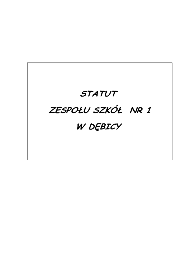 STATUT ZESPOŁU SZKÓŁ NR 1 W DĘBICY Podstawa prawna: - Ustawa z dnia 7 września 1991 roku o systemie oświaty – tekst jednolity ( Dz. U. z 2004r. Nr 256, poz. 2572 z późn. zm. ) - Rozporządzenie Ministra Edukacji Narodowej z dnia 21 maja 2001 r. w sprawie ramowych statutów publicznego przedszkola oraz publicznych szkół (Dz. U. Nr 61, poz. 624 z późniejszymi zmianami). WSTĘP § 1. 1. Ilekroć w dalszej treści statutu jest mowa bez bliższego określenia o: 1) zespole szkół – należy przez to rozumieć Zespół Szkół nr 1 w Dębicy, 2) gimnazjum – należy przez to rozumieć Miejskie Gimnazjum nr 3 z Oddziałami Integracyjnymi im. Krzysztofa Kamila Baczyńskiego w Zespole Szkół nr 1 w Dębicy, 3) szkole podstawowej – należy przez to rozumieć Publiczną Szkołę Podstawową nr 5 w Zespole Szkół nr 1 w Dębicy 4) ustawie – należy przez to rozumieć ustawę z dnia 7 września 1991 r. o systemie oświaty (Dz. U. z 2004 r. Nr 256, poz. 2572 z późn. zm.), 5) statucie – należy przez to rozumieć Statut Zespołu Szkół nr 1 w Dębicy, 6) dyrektorze, radzie pedagogicznej, samorządzie uczniowskim i radzie rodziców- należy przez to rozumieć organy działające w zespole szkół, 7) uczniach i rodzicach – należy przez to rozumieć uczniów zespołu szkół oraz ich rodziców lub prawnych opiekunów, 8) wychowawcy – należy przez to rozumieć nauczyciela, którego szczególnej opiece wychowawczej powierzono jeden z oddziałów w zespole, 9) organie prowadzącym Zespół – należy przez to rozumieć Gminę Miejską Dębica, 10) organie sprawującym nadzór pedagogiczny nad zespołem – należy przez to rozumieć Podkarpackiego Kuratora Oświaty w Rzeszowie. 2. Organem wyższego stopnia w rozumieniu Kodeksu postępowania administracyjnego, w stosunku do decyzji wydawanych przez dyrektora w sprawach z zakresu obowiązku szkolnego jest Podkarpacki Kurator Oświaty w Rzeszowie. 2 POSTANOWIENIA OGÓLNE § 2. Szkoła nosi nazwę: Zespół Szkół nr 1 w Dębicy. Jest szkołą publiczną dla dzieci i młodzieży. Zespół tworzy: Publiczna Szkoła Podstawowa nr 5 w Dębicy, Miejskie Gimnazjum nr 3 z Oddziałami Integracyjnymi im. Krzysztofa Kamila Baczyńskiego w Dębicy. § 3. 1. Siedzibą Zespołu Szkół jest miejscowość Dębica. 2. Zespół Szkół mieści się w budynku dotychczasowej Szkoły Podstawowej nr 5 przy ul. Paderewskiego 4 w Dębicy. § 4. Obwód Zespołu Szkół nr 1 w Dębicy określony został jak w załączniku nr 1 i nr 2 Uchwały Nr XXXVIII/515/06 Rady Miejskiej w Dębicy z dnia 30 maja 2006 roku. § 5. 1. Na pieczęci używana jest nazwa : „ Zespół Szkół nr 1 w Dębicy’’. 2. Na pieczęciach placówek wchodzących w skład zespołu używa się nazwy o treści: 1) „ Zespół Szkół nr 1 Publiczna Szkoła Podstawowa nr 5 w Dębicy”, 2) „ Zespół Szkół nr 1 Miejskie Gimnazjum nr 3 z Oddziałami Integracyjnymi im.Krzysztofa Kamila Baczyńskiego w Dębicy ’’. § 6. 1. Gimnazjum wchodzące w skład zespołu posiada imię określone w § 1 i sztandar. 2. Zmiana lub likwidacja imienia następuje na wspólny wniosek rady pedagogicznej, rady rodziców i samorządu uczniowskiego złożony do organu prowadzącego szkołę. 3. Zespołowi szkół nadaje imię organ prowadzący na wniosek rady szkoły lub wspólny wniosek rady pedagogicznej, rady rodziców i samorządu uczniowskiego. 3 § 7. 1. Organem prowadzącym Zespół Szkół nr 1 w Dębicy jest Gmina Miejska Dębica. 2. Organem nadzorującym Zespół Szkół nr 1 w Dębicy jest Podkarpacki Kurator Oświaty w Rzeszowie. 3. Zgodnie z przepisami w sprawie ramowych planów nauczania czas cyklu kształcenia w zespole szkół wynosi: 1) w szkole podstawowej – 6 lat, 2) w gimnazjum – 3 lata. 4. W strukturze zespołu szkół funkcjonuje: 1) biblioteka szkolna. 2) uchylony CELE I ZADANIA ZESPOŁU SZKÓŁ § 8. 1. Zespół Szkół realizuje cele i zadania określone w ustawie z dnia 7 września 1991r. o systemie oświaty ( Dz. U. z 2004r. Nr 256 poz. 2572 z późn. zm.) oraz w przepisach wykonawczych wydanych na jej podstawie, a w szczególności: 1) umożliwia zdobycie wiedzy i umiejętności niezbędnych do uzyskania świadectwa ukończenia szkoły poprzez : a) atrakcyjny i nowatorski program nauczania, b) udział w warsztatach językowych. 1a) zapewnia uczniom rozwój indywidualnych zdolności twórczych poprzez m.in. system nagród. 2) umożliwia absolwentom dokonanie świadomego wyboru dalszego kierunku kształcenia poprzez : a) poradnictwo psychologiczno- pedagogiczne, b) rozwijanie zainteresowań pozalekcyjnych, c) organizowanie spotkań gimnazjalnych. 4 z przedstawicielami szkół ponad- 3) kształtuje środowisko wychowawcze sprzyjające realizowaniu celów i zasad określonych w ustawie stosownie do warunków zespołu szkół i wieku ucznia poprzez : a) zapewnienie odpowiedniej bazy dla uczniów, b) systematyczne diagnozowanie i monitorowanie zachowań uczniów, 4) umożliwia prowadzenie klas integracyjnych, klas sportowych oraz oddziału rocznego przygotowania przedszkolnego, 5) sprawuje opiekę nad uczniami odpowiednio do ich potrzeb poprzez : a) prowadzenie zajęć dydaktyczno – wyrównawczych, b) prowadzenie zajęć z gimnastyki korekcyjnej, c) prowadzenie zajęć logopedycznych, d) prowadzenie zajęć terapeutycznych, e) umożliwienie spożywania posiłków. 2. Zajęcia, o których mowa w ust. 1 pkt. 5 prowadzone są na podstawie diagnozy dokonanej przez poradnię psychologiczno - pedagogiczną, lekarza oraz w miarę posiadanych środków finansowych. 3. Szkoła podstawowa i gimnazjum organizują naukę religii zgodnie z odrębnymi przepisami. § 9. Zadania opiekuńczo - wychowawcze 1. Nad uczniami przebywającymi w zespole szkół podczas zajęć obowiązkowych, nadobowiązkowych i pozalekcyjnych opiekę sprawuje oraz za ich bezpieczeństwo odpowiada nauczyciel prowadzący te zajęcia. 2. Nad uczniami biorącymi udział w zajęciach poza terenem szkoły, w t